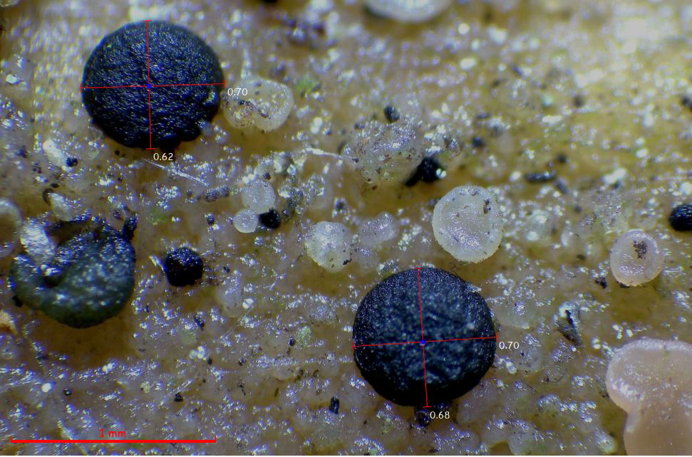 Ascomas en forma de granos de color negro de unos 0,7 mm. de diámetro, poco arraigados al sustrato.