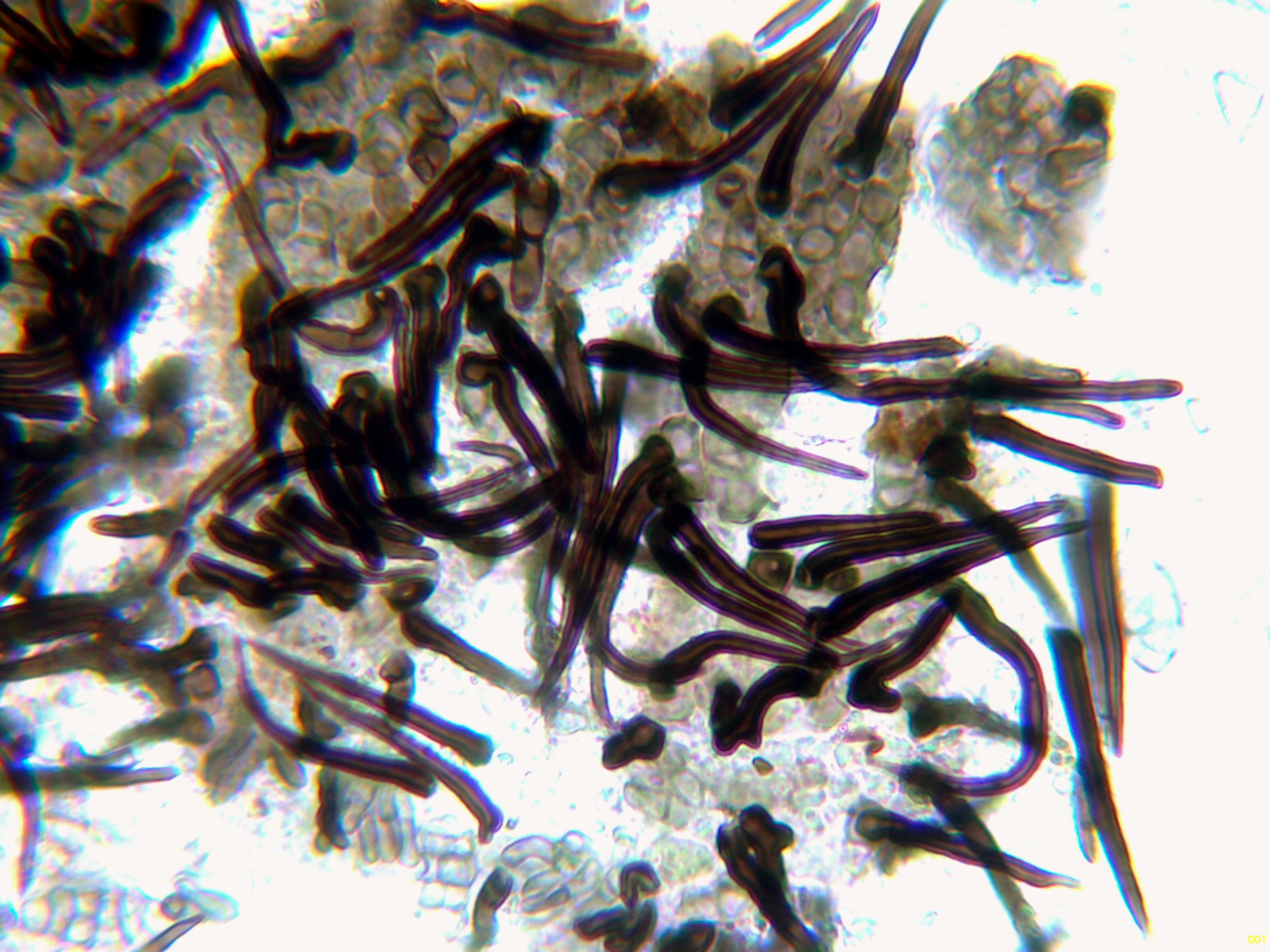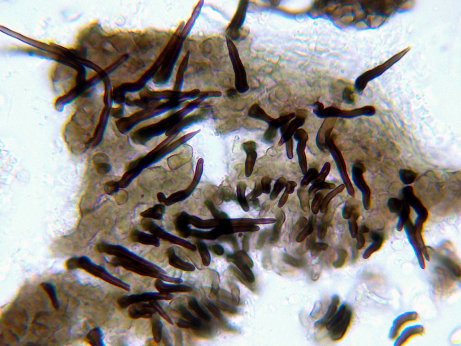 Pelos externos a modo de setas, de color marrón muy oscuro, casi negro, sin septos, con el extremo apuntado y de pared gruesa, con unas medidas de (11.5) 17.9 - 31 (33.5) × (2.4) 3.1 - 4.3 (4.5) µm.