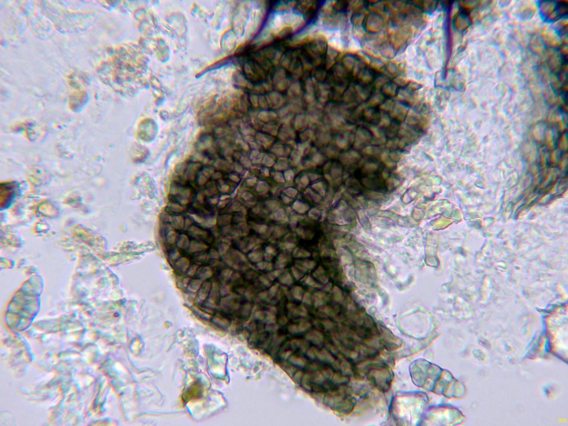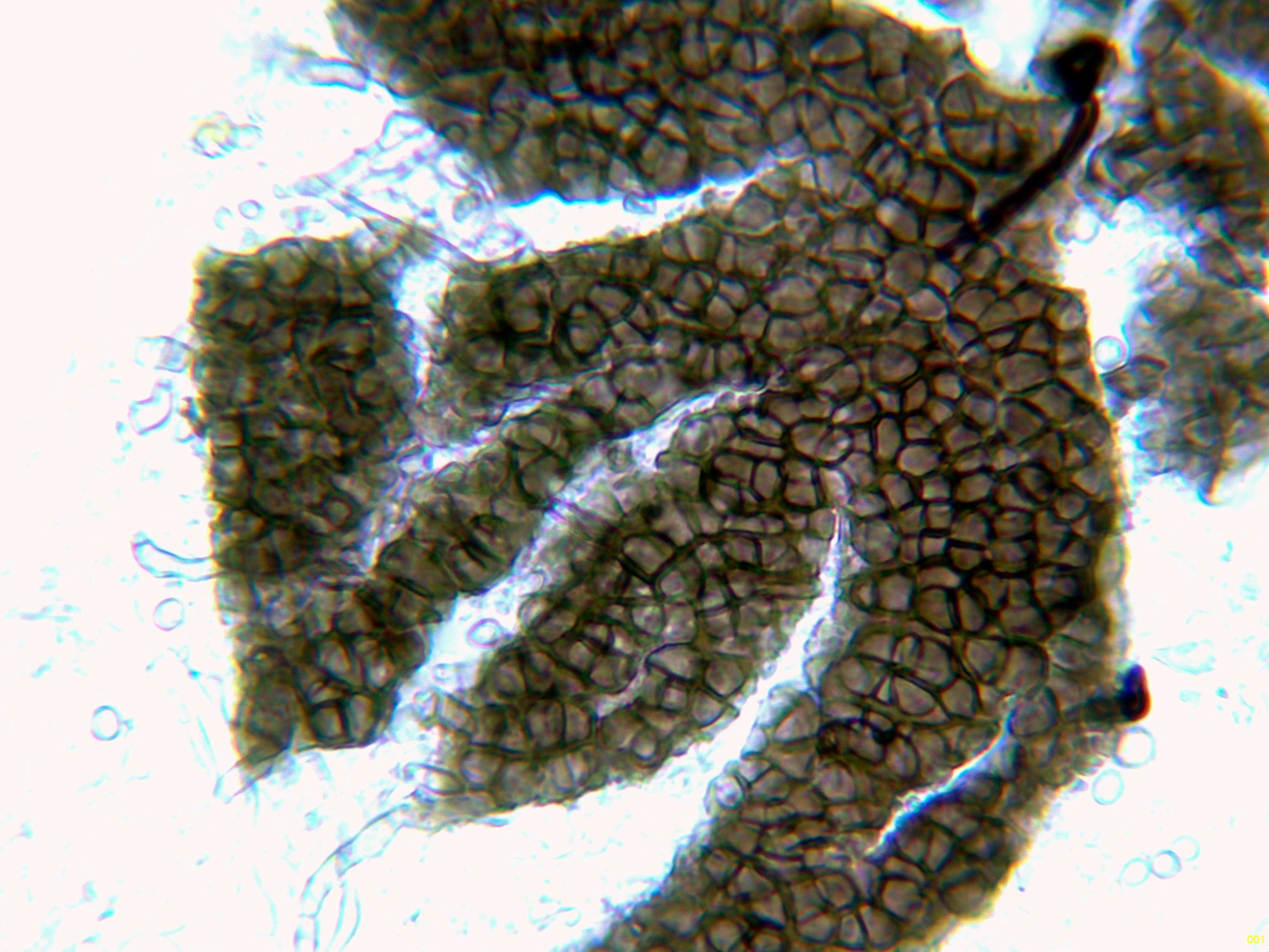 Hifas de la pared del peridio de pequeño tamaño, angulares, fuertemente pigmentadas de marrón y de pared gruesa.