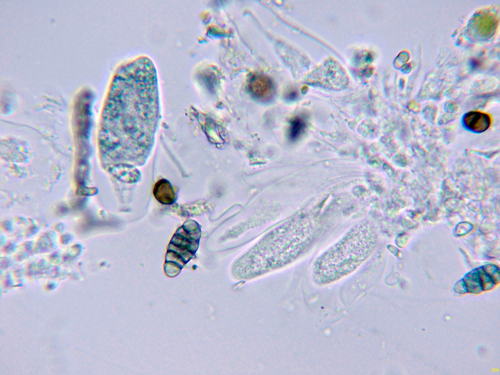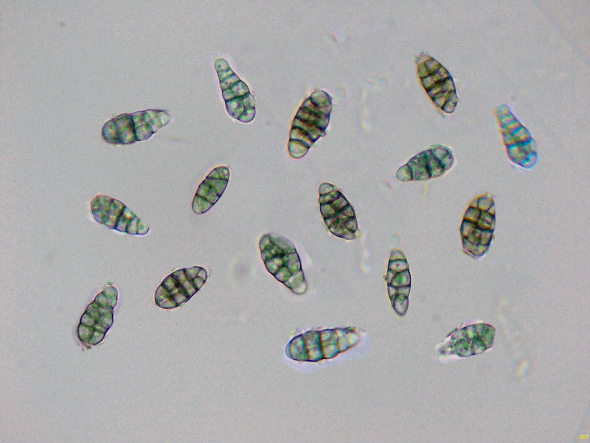 Las esporas libres en agua, estas esporas hialinas dentro del asco, para ir adquiriendo un color marrón grisáceo con la maduración, con 3 a 5 (6) septos transversales y con 2 o 3 septos oblicuos longitudinales.