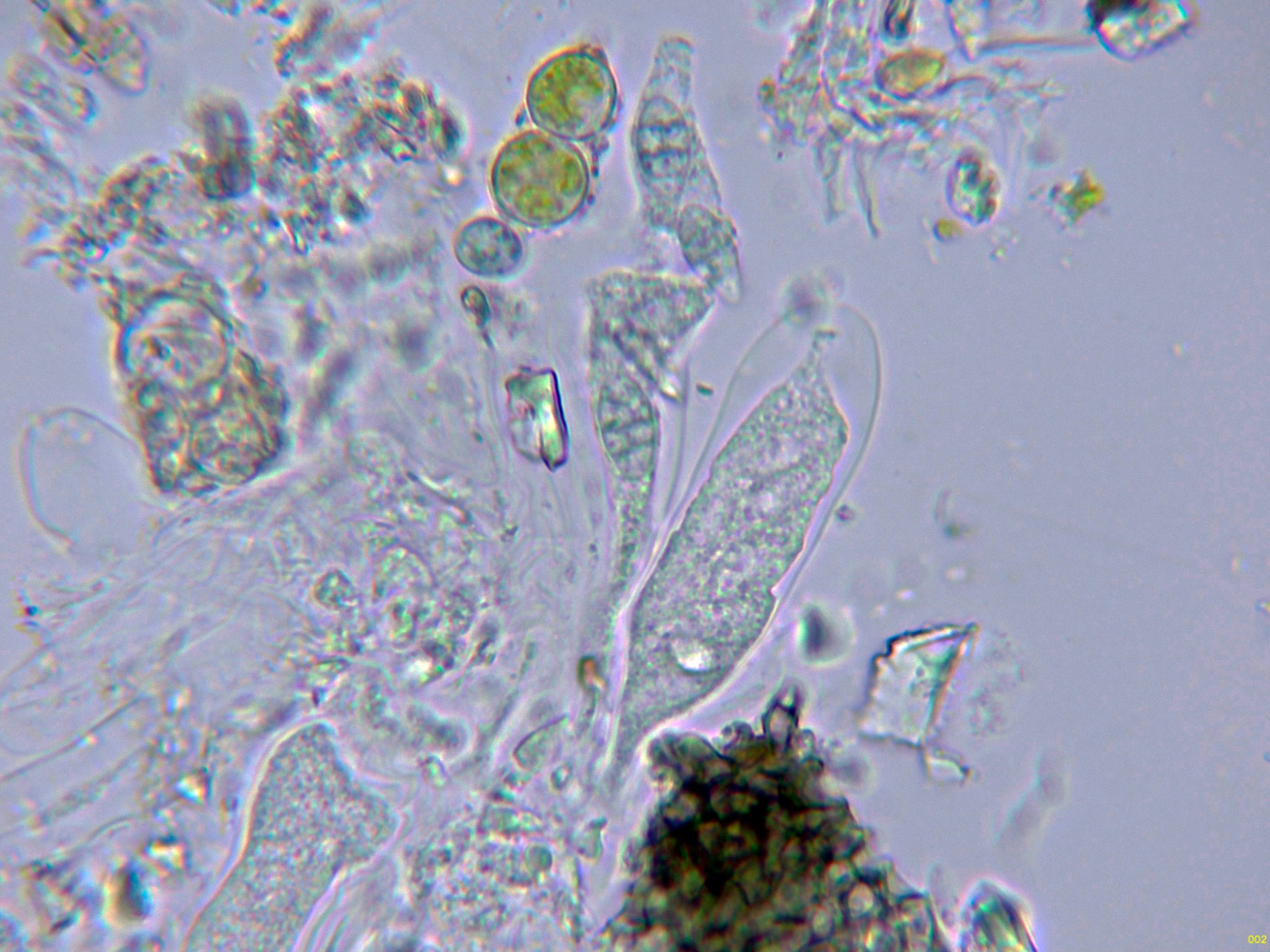 Por casualidad, al estudiar la Orbilia, al observar la imagen pude comprobar que sin pretenderlo, había seccionado un ascoma de la Capronia, en su interior se puede ver la masa gelatinosa donde se alojan los ascos.