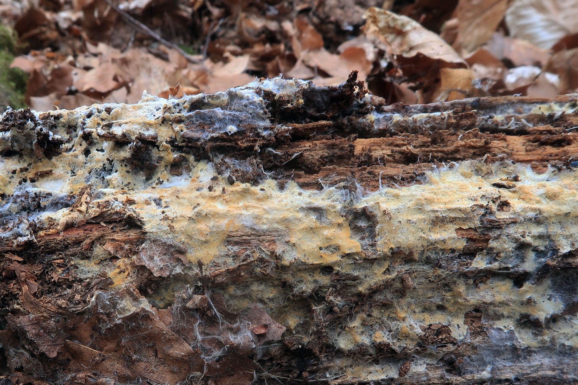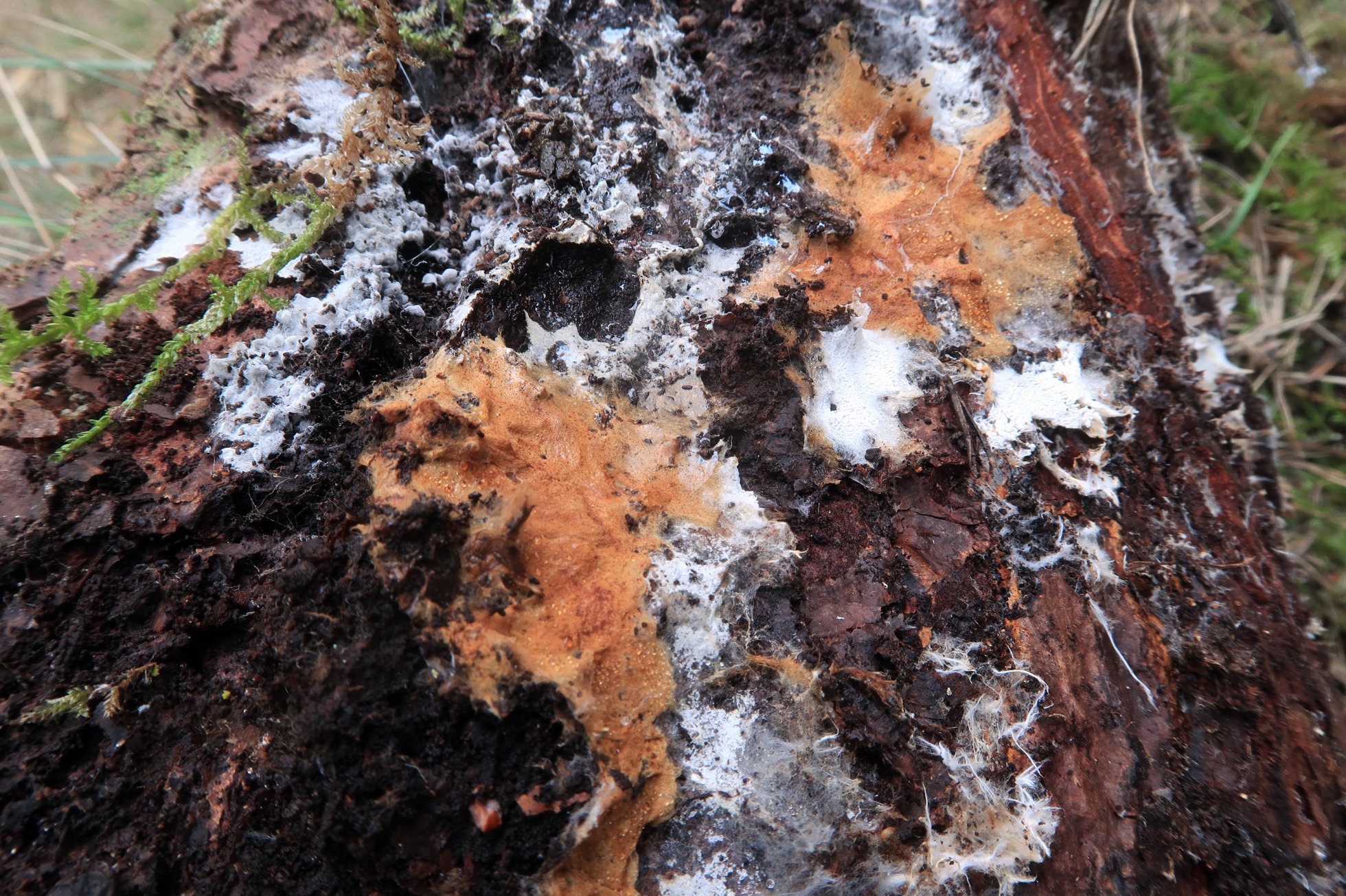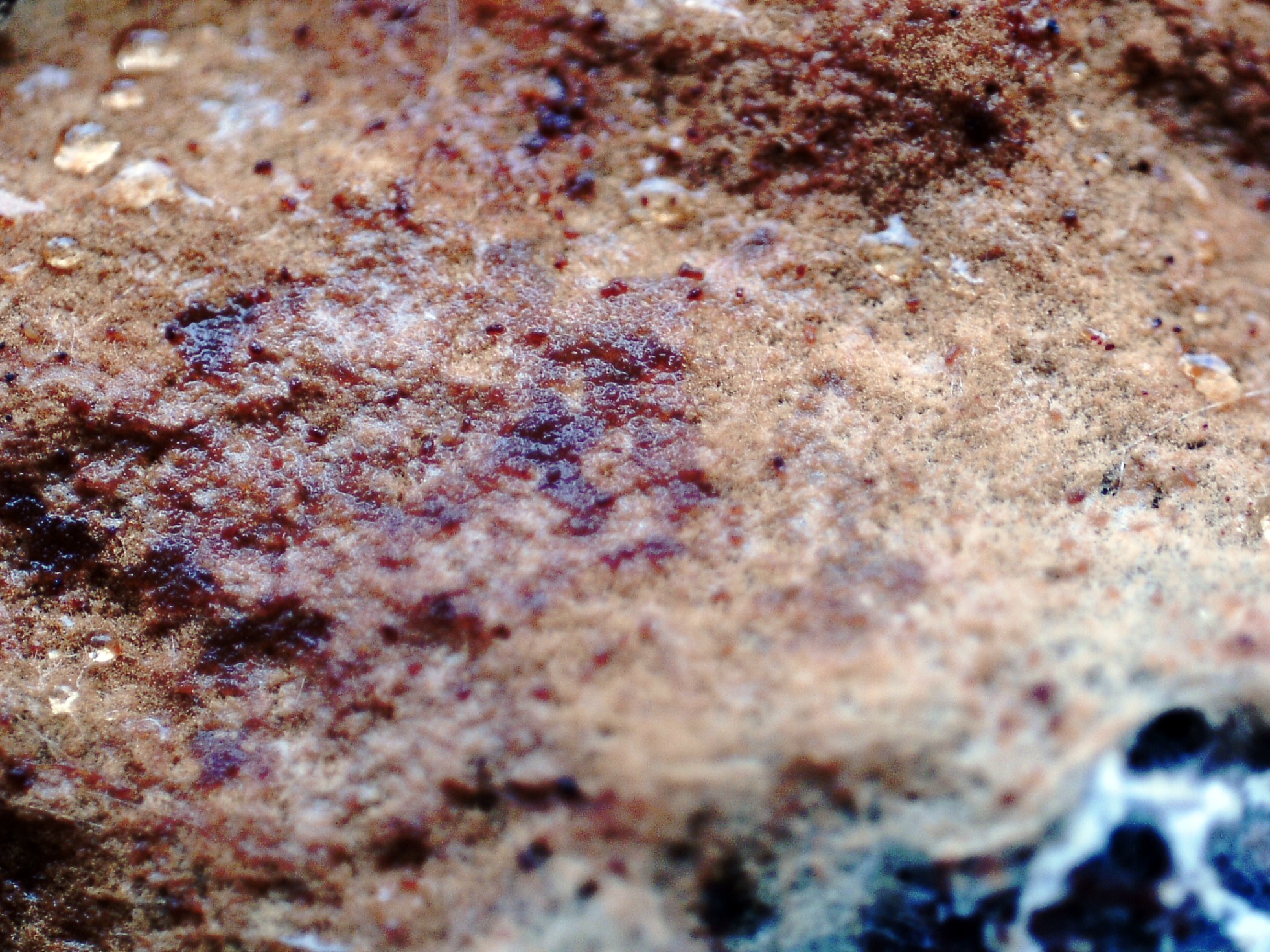En la superficie de un tronco y en la parte que está en contacto con el suelo, una Tomentella, sus hifas subiculares sin fíbulas allanan mucho el camino a la hora de ponerle apellido, sus cortas espinas ya descartan la Tomentella badia y queda solo como muy probable la Tomentella brunneofirma.