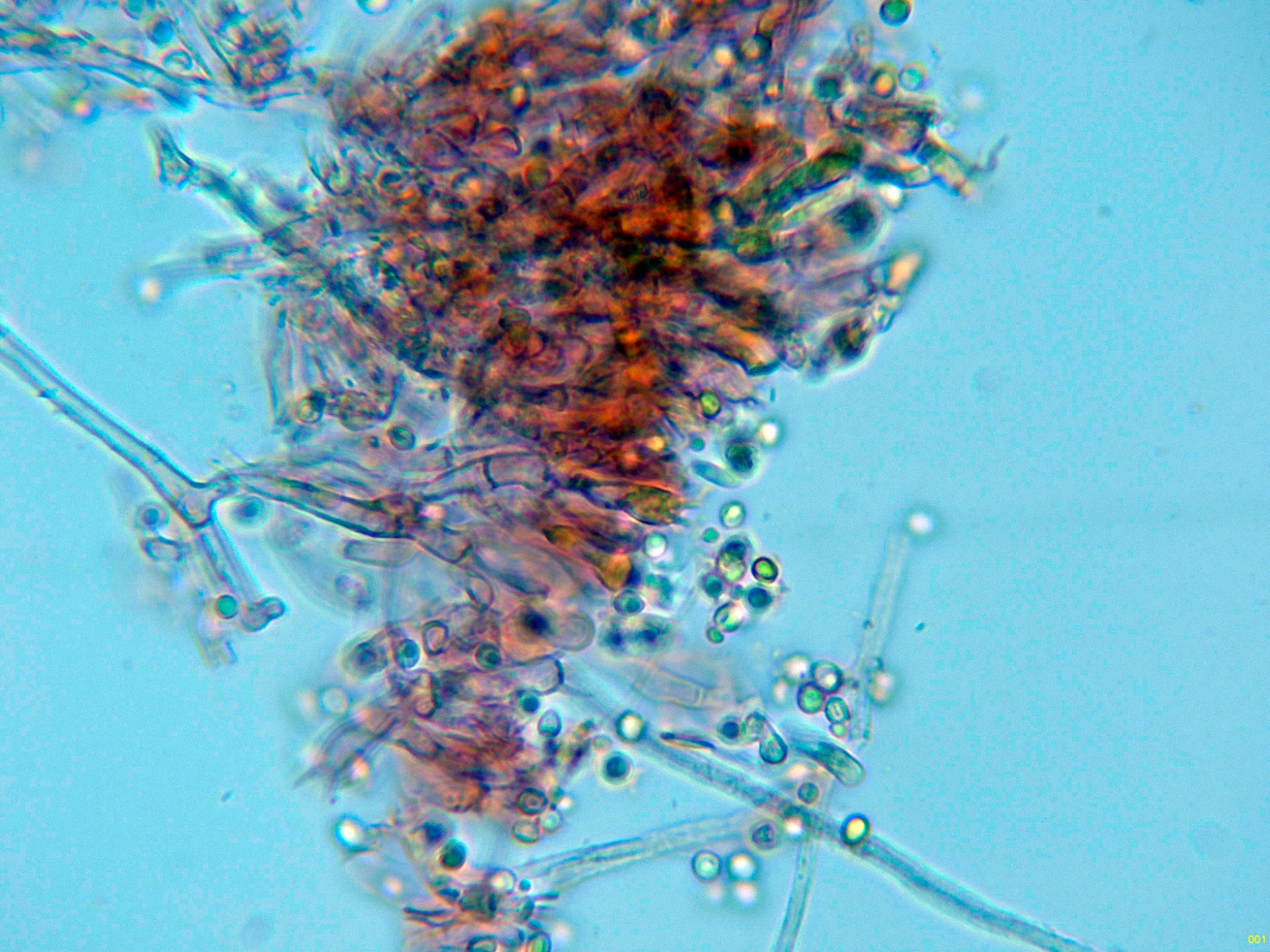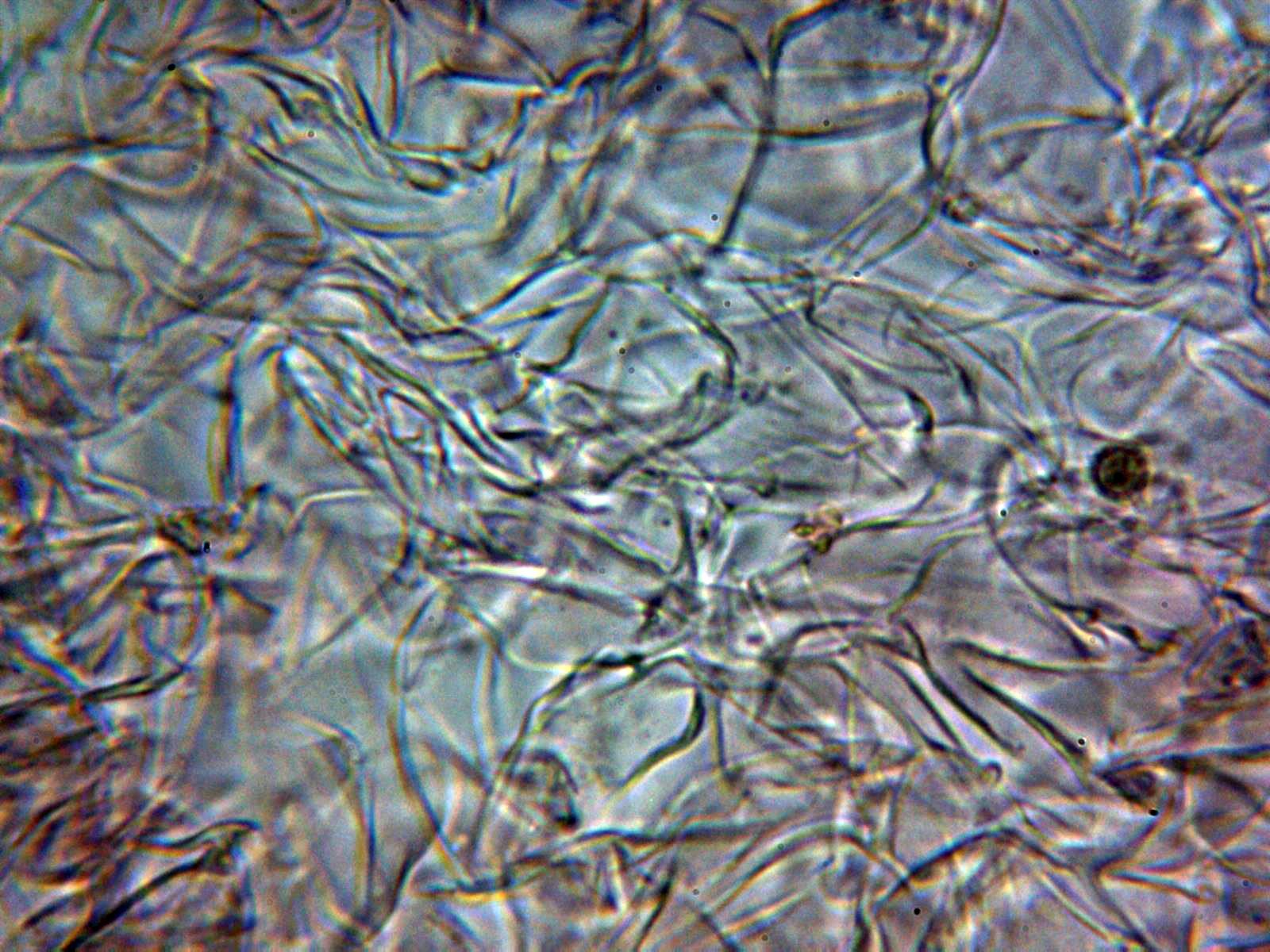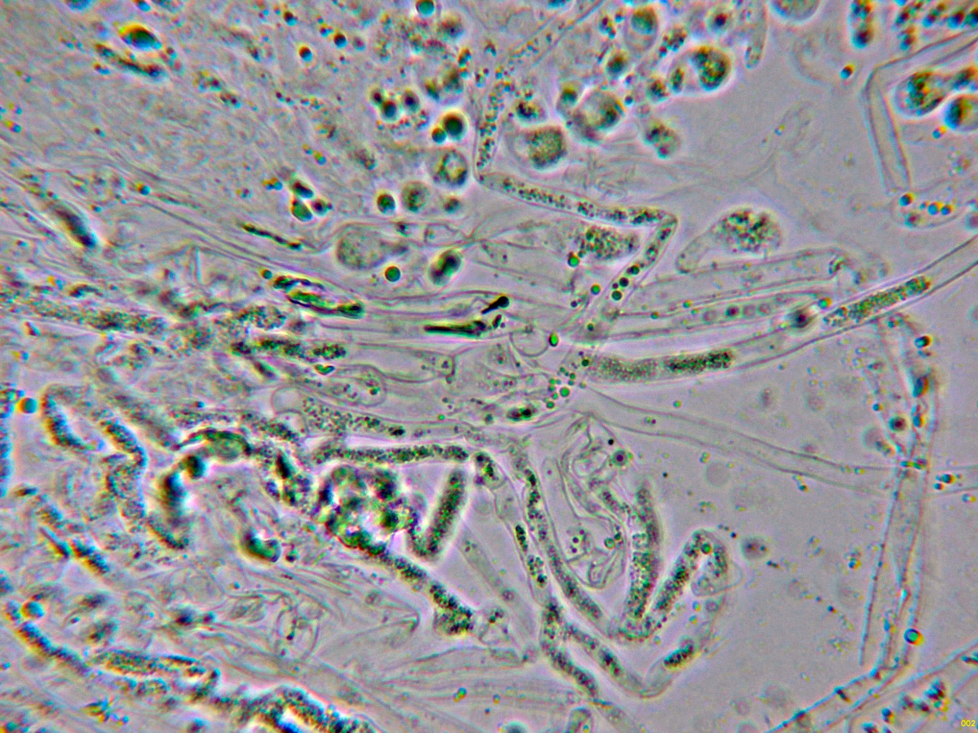 Poco a destacar en su microscopía, solo un amasijo de hifas, alguna de ellas con inflamientos.