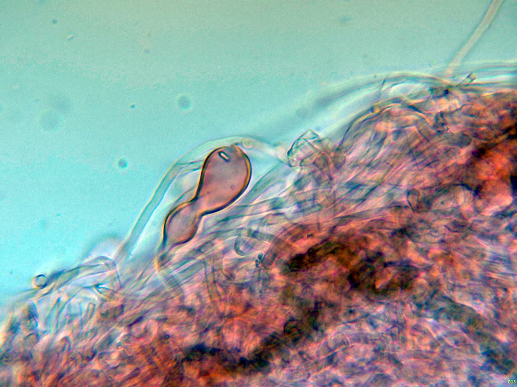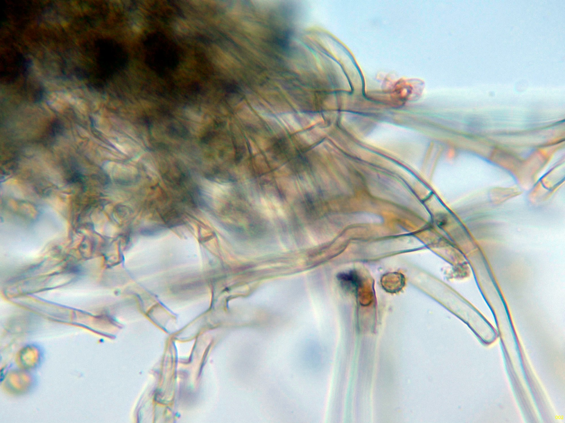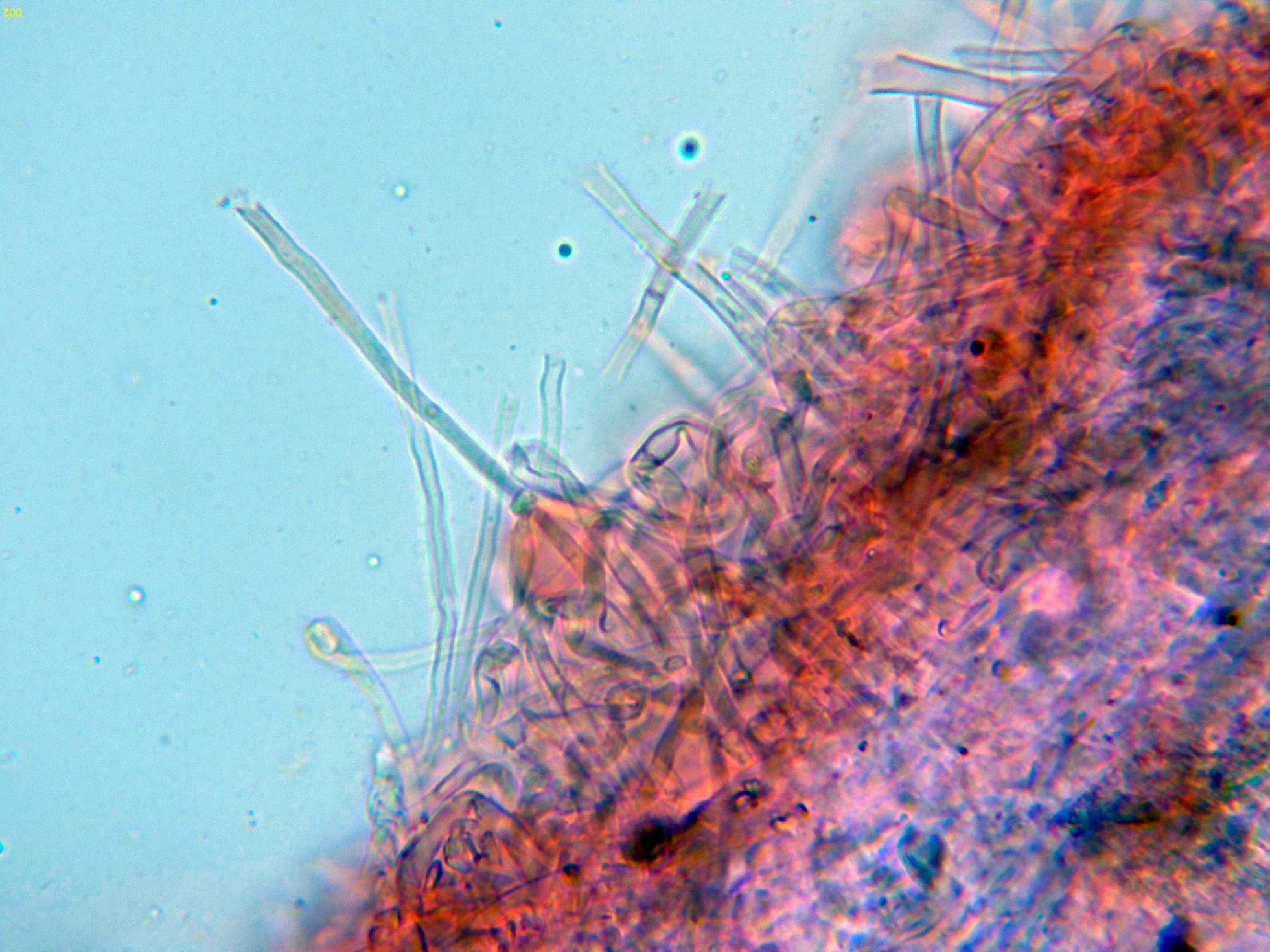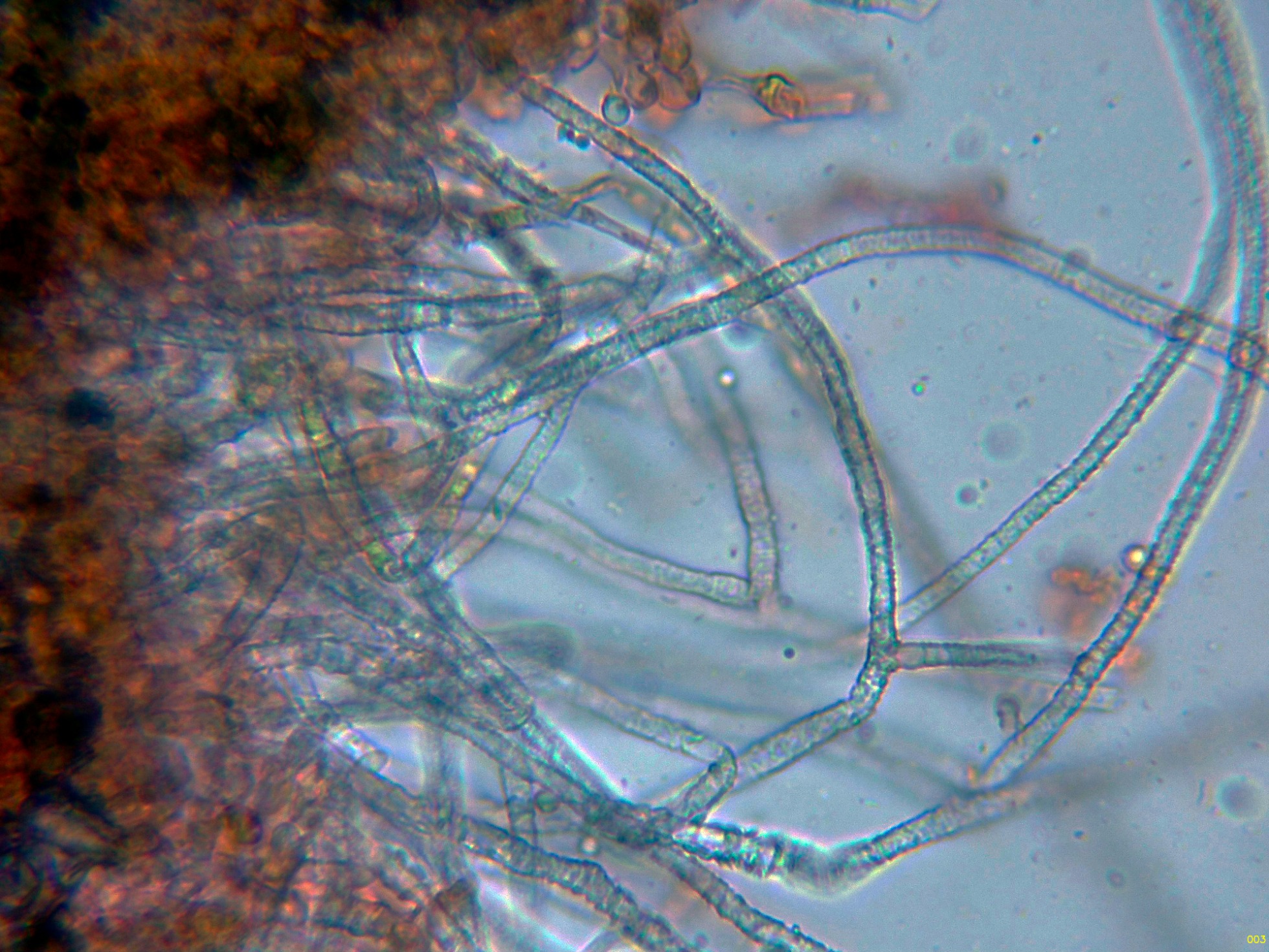 Otro Corticial, sus hifas subiculares con incrustaciones, sin fíbulas, y sus pequeñas esporas me recuerdan mucho al Piloderma byssinum.