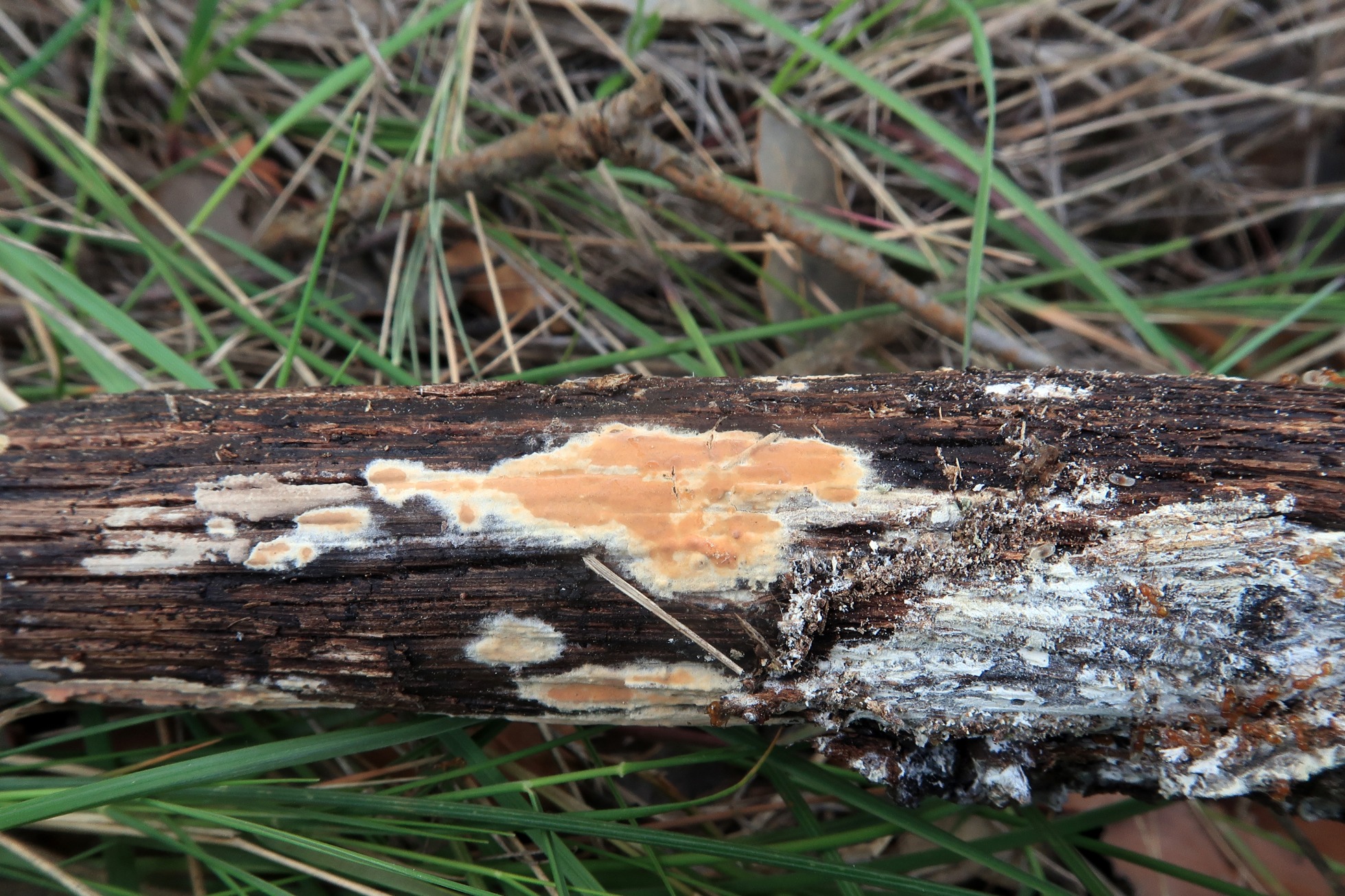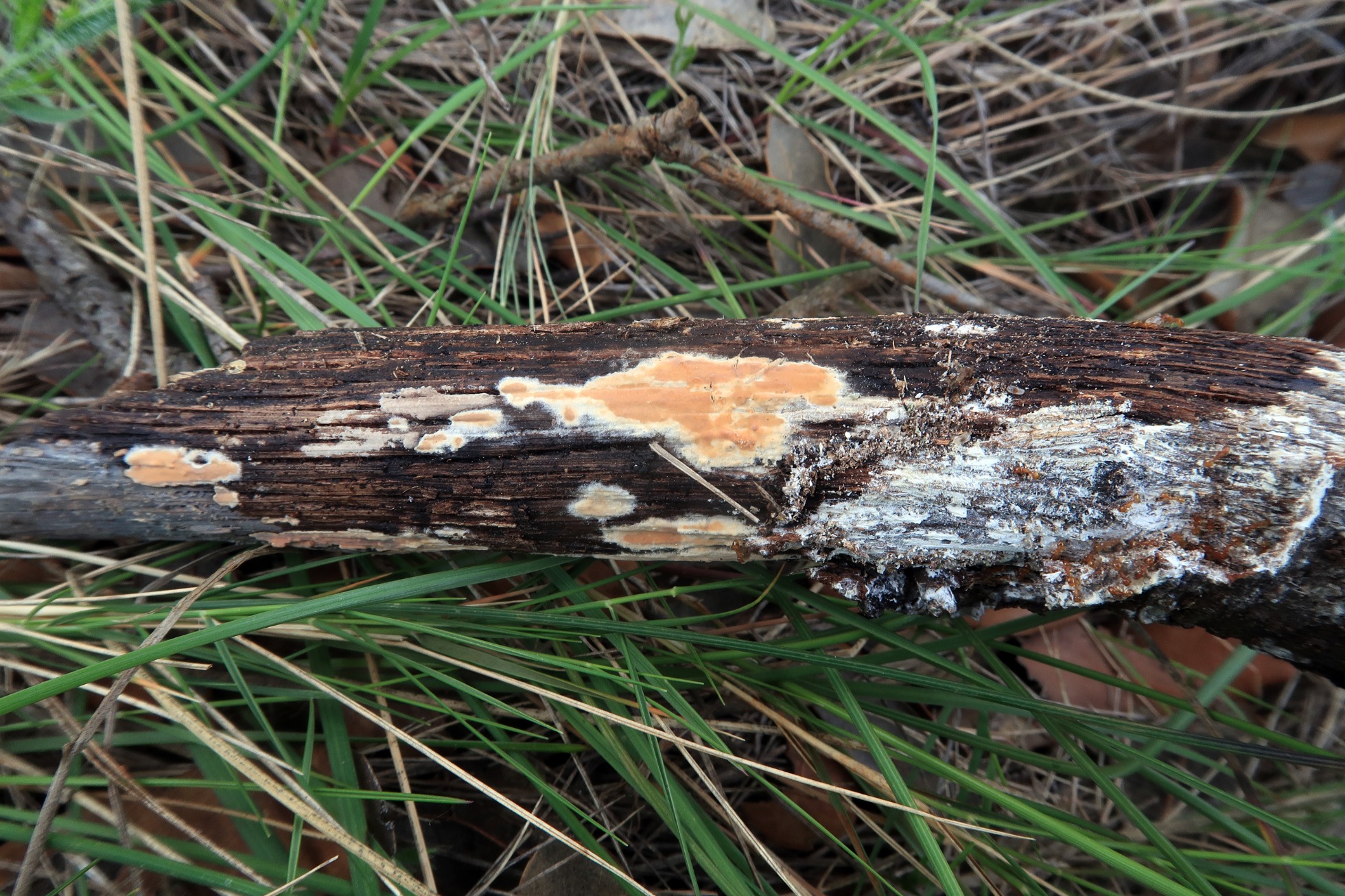 Una Peniophora del pasado domingo 5 de mayo, sobre la superficie decorticada de un tronco tumbado del suelo, en un estado ya bastante avanzado de descomposición, en una zona donde predominaban las encinas.