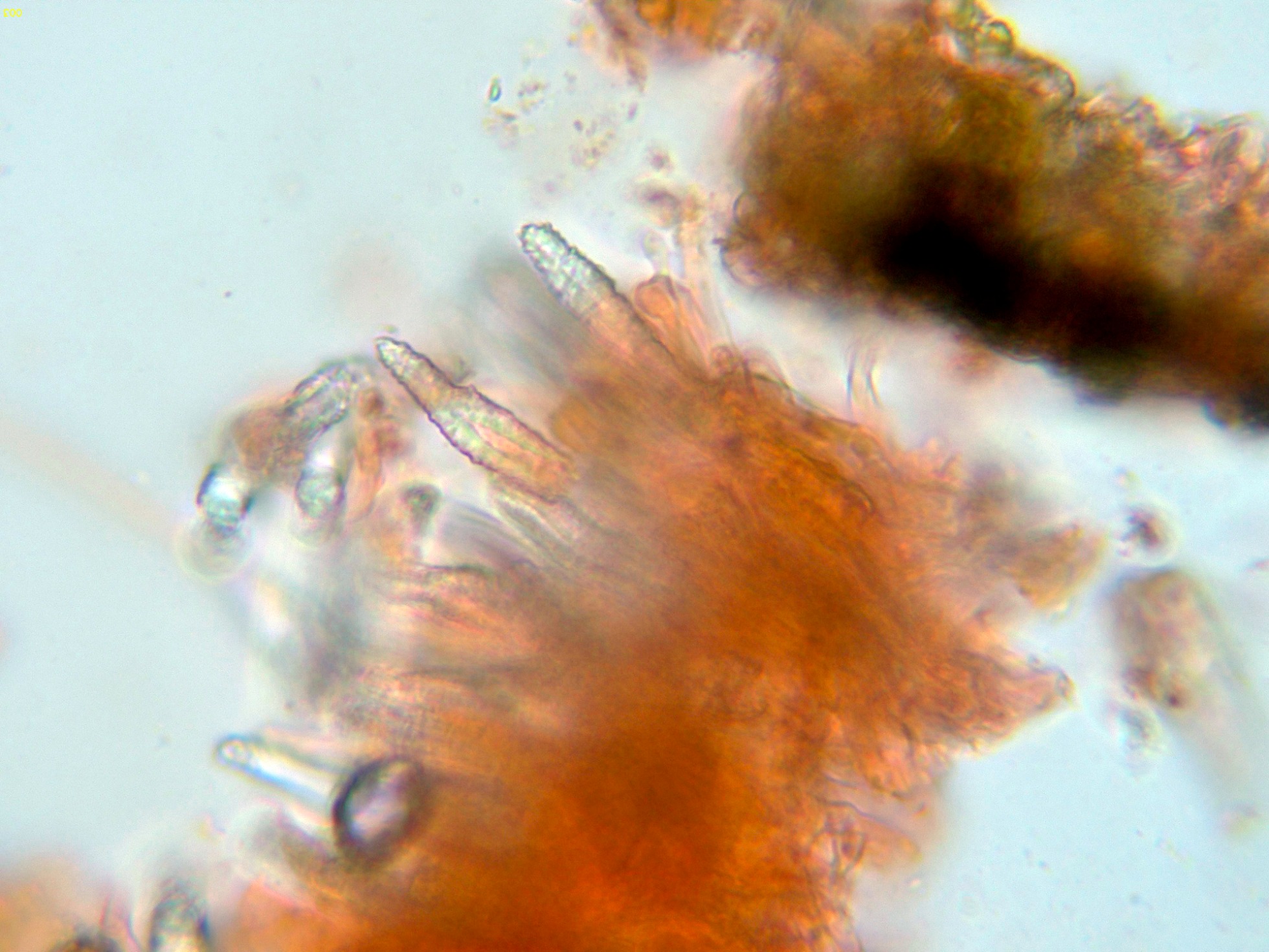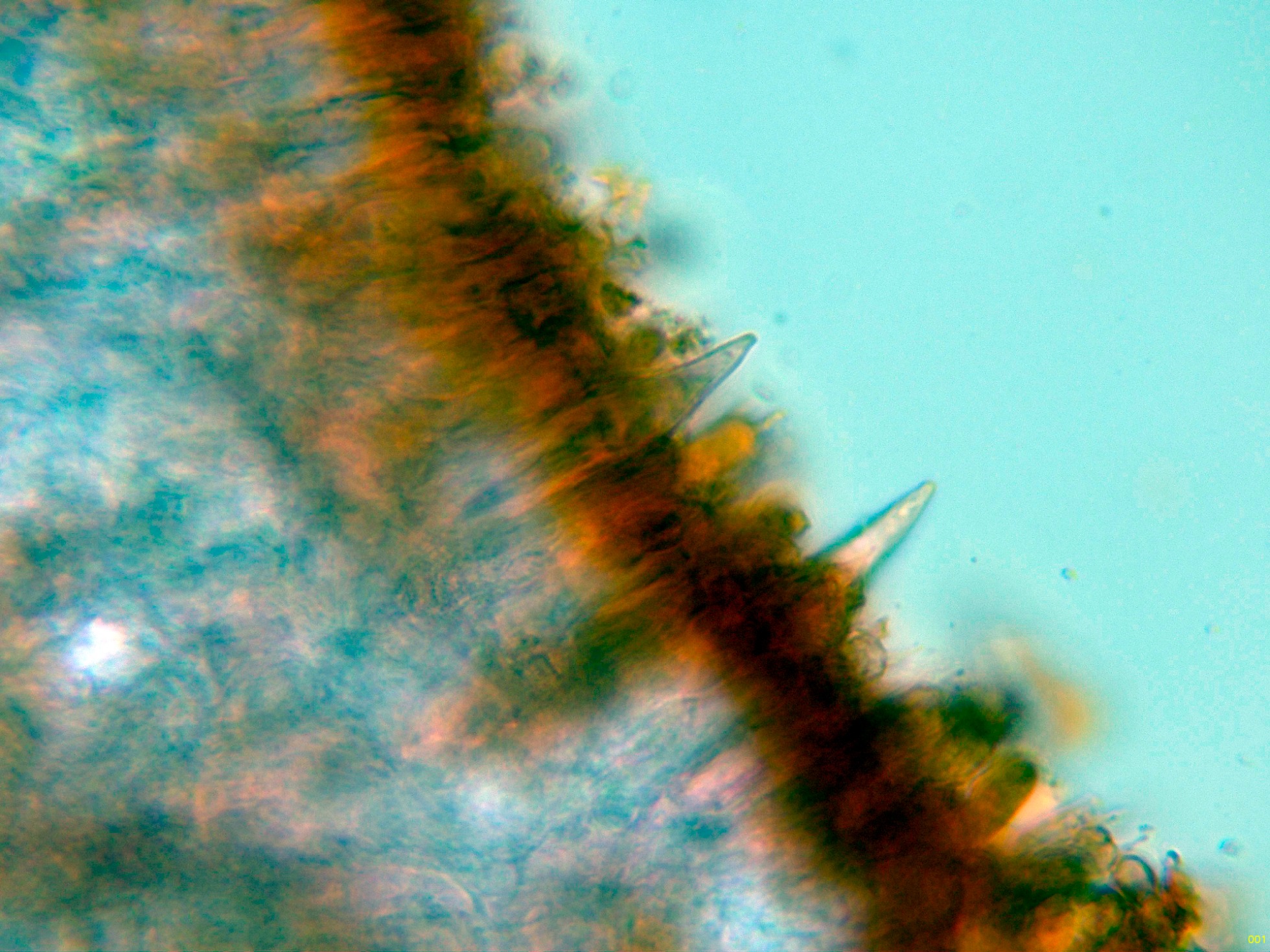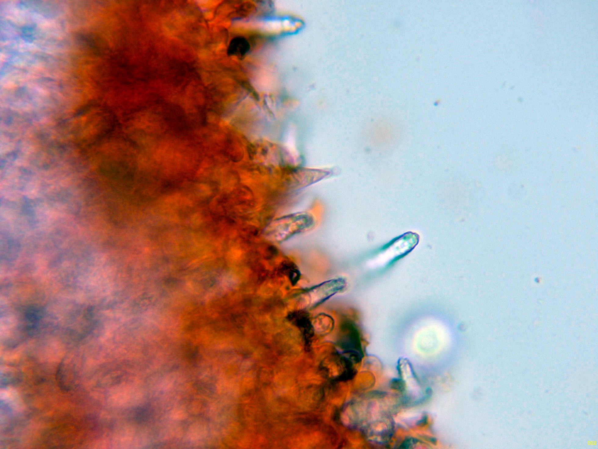 Abundantes cistidios, lanceolados, muchos de ellos con incrustaciones.