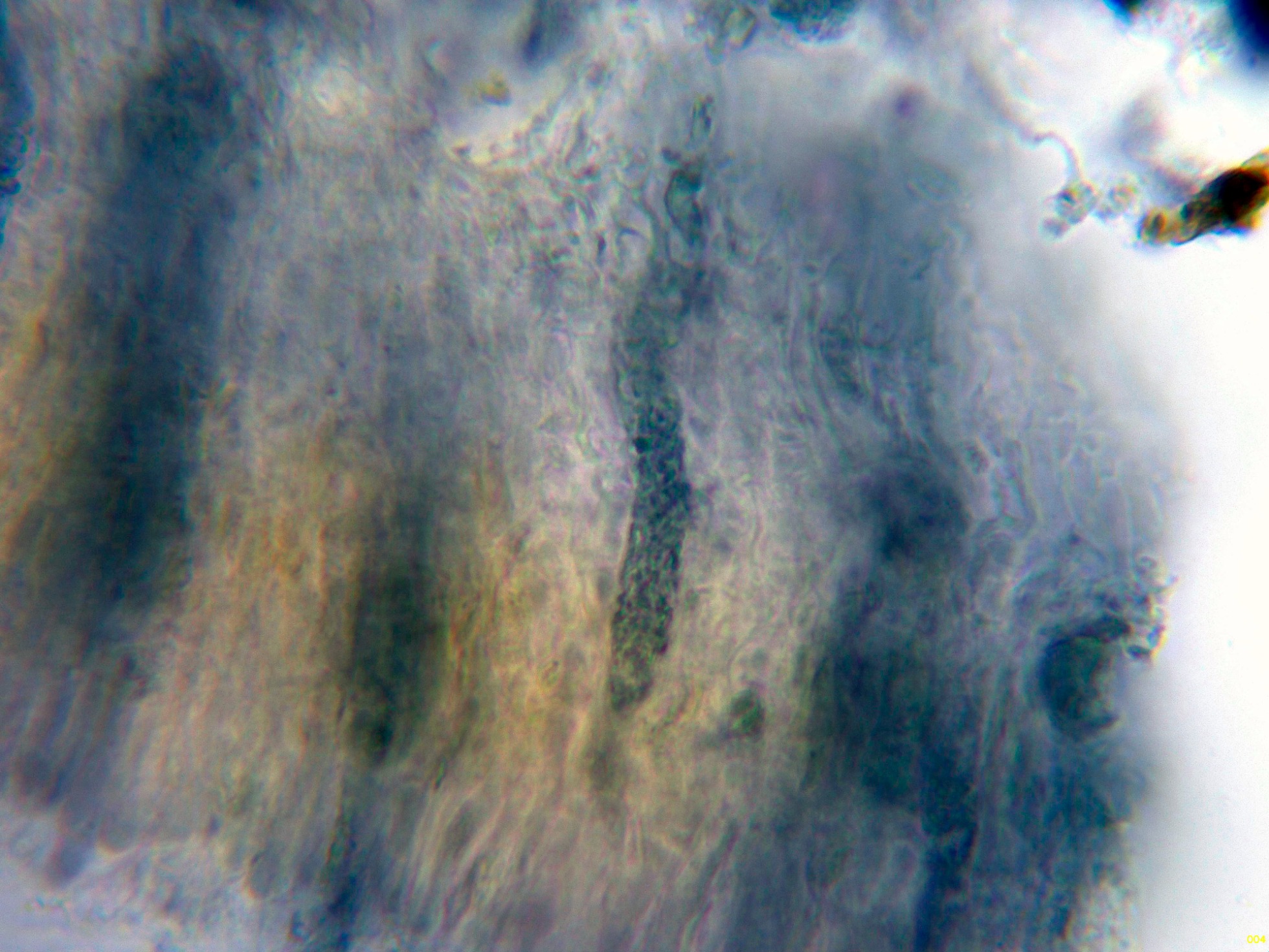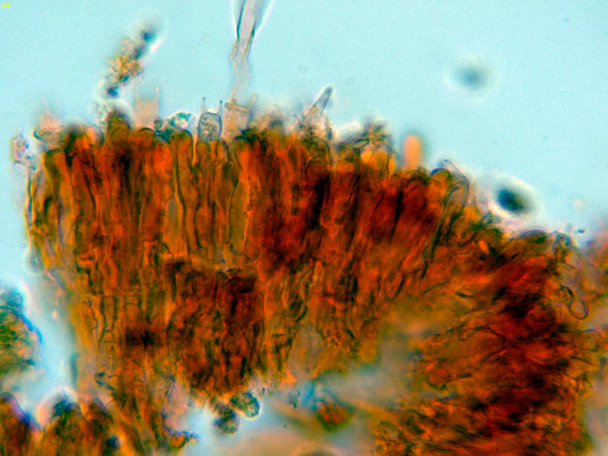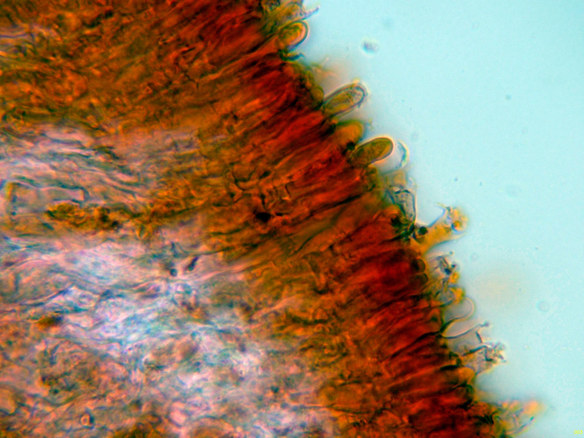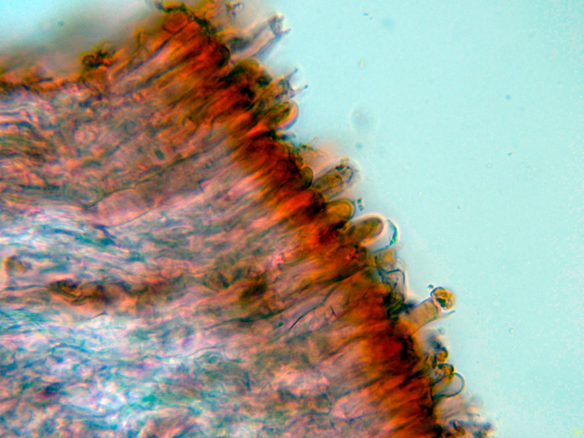 Gloeocistidios presentes en el himenio, difíciles de observar en las preparaciones con agua o Rojo Congo, pero muy visibles con la Sulfovainillina.