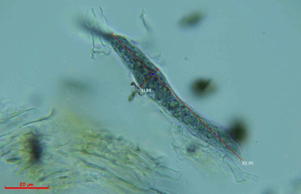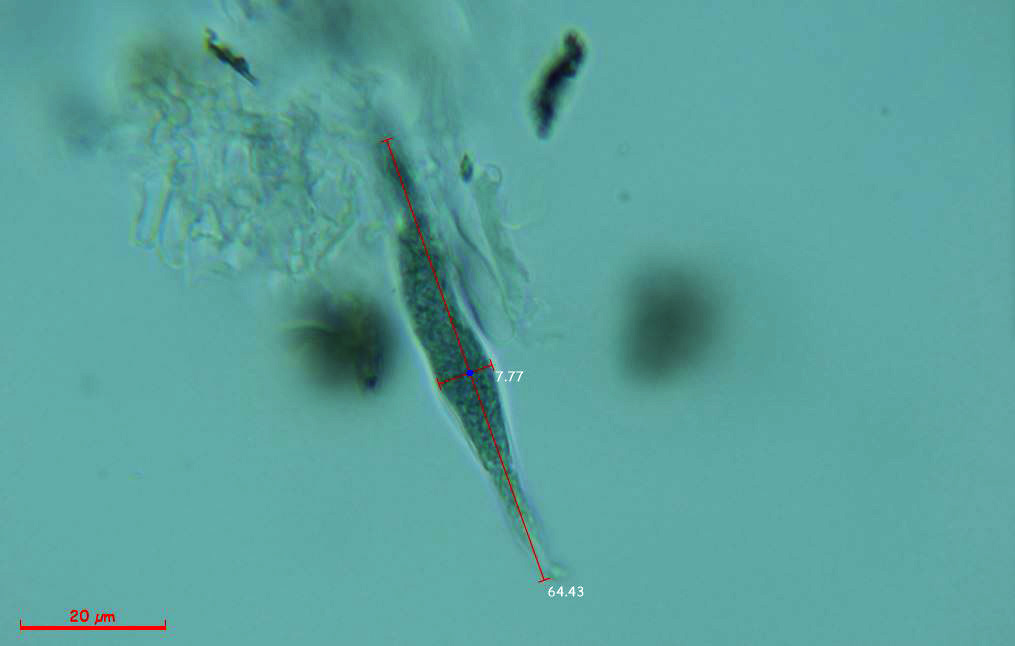 Un par de gloeocistidios en Sulfovainillina con sus medidas.