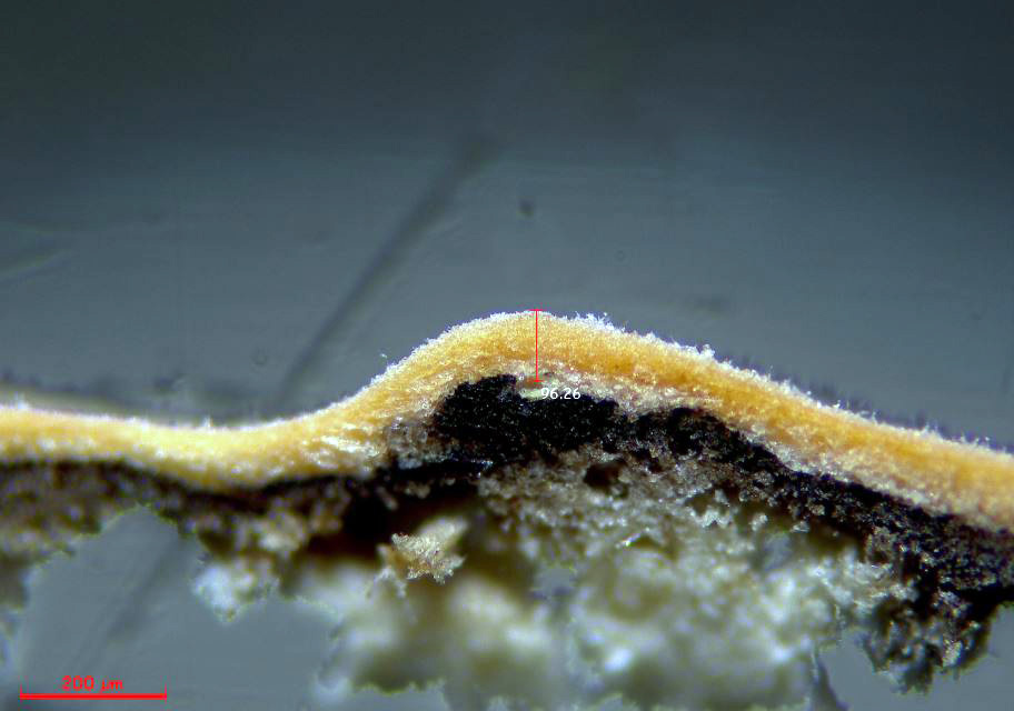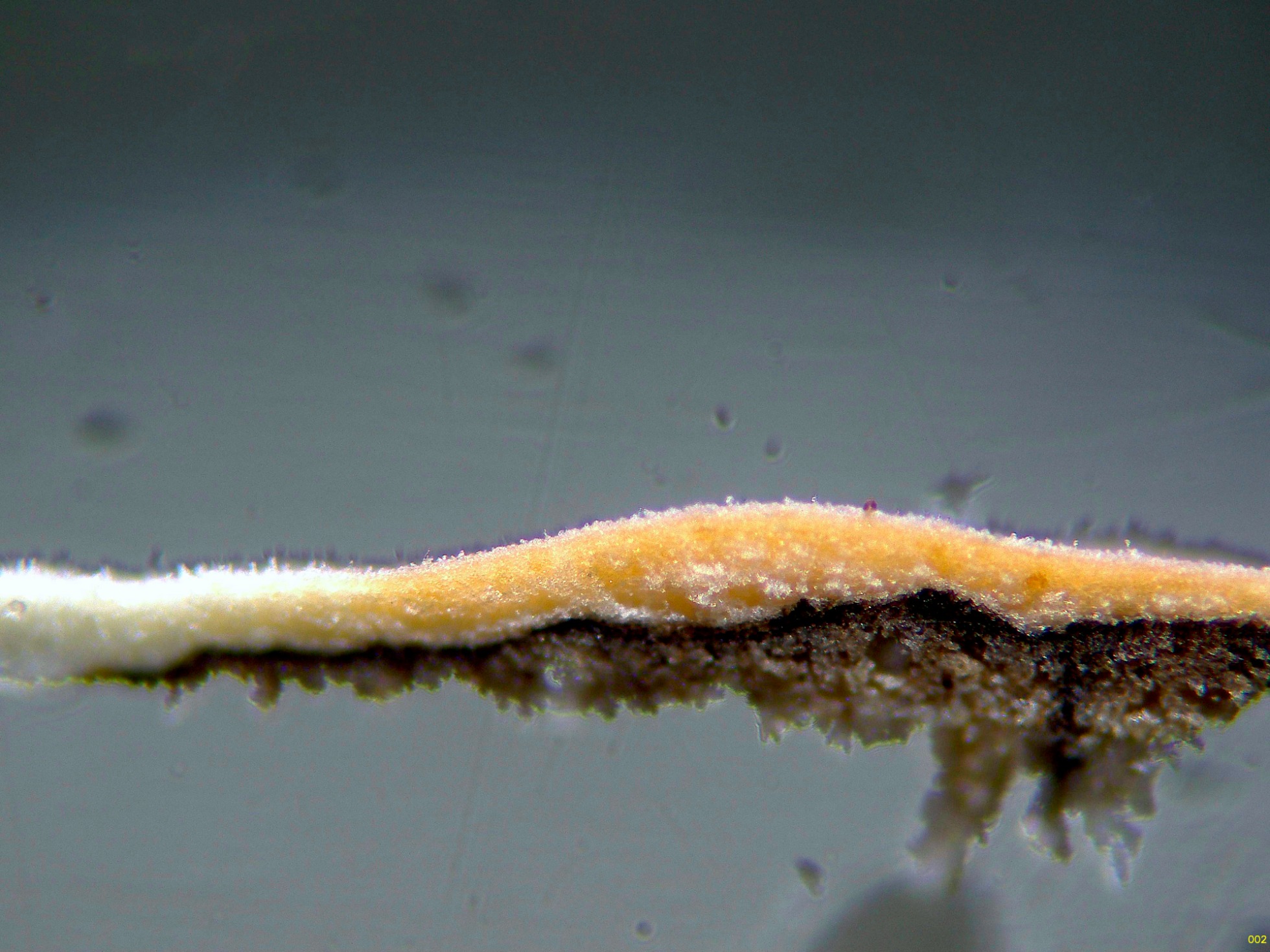Basidiomas de muy pequeño grosor, detalle de la sección del basidioma a 100 aumentos.