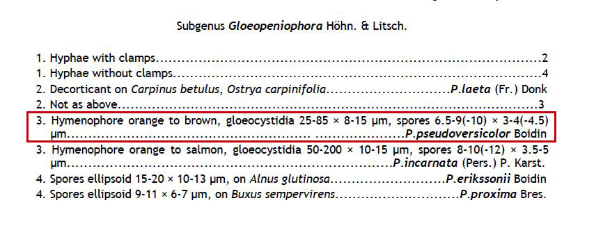 Determinación hecha siguiendo las Claves del documento "On-line key to Peniophora Cooke species from Macedonia", que por la presencia de gloeocistidos, ya la coloca dentro del subgénero Gloeopeniophora, donde con color anaranjado, gloeocistidios de hasta 85 micras y esporas con unas medidas de 6.5-9(-10) × 3-4(-4.5) μm., conducen a la Peniophora pseudoversicolor propuesta.