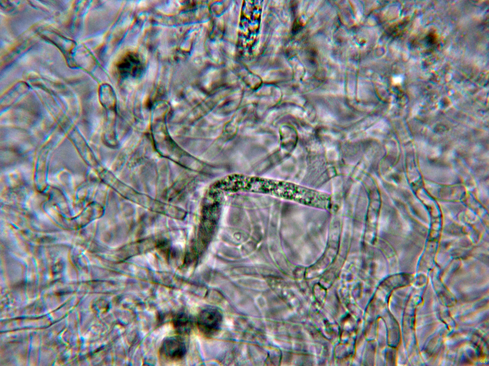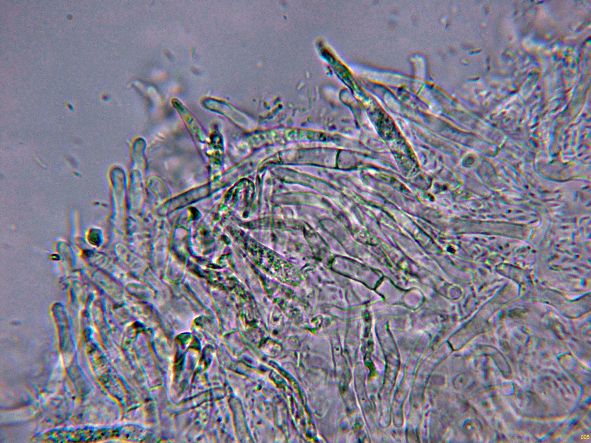 Dermatocistidios dispersos en la suprapellis, con unas medidas de (52.2) 52.23 - 66.7 × (4.8) 4.82 - 6.5 µm., que no se tiñen con la Sulfovainillina.