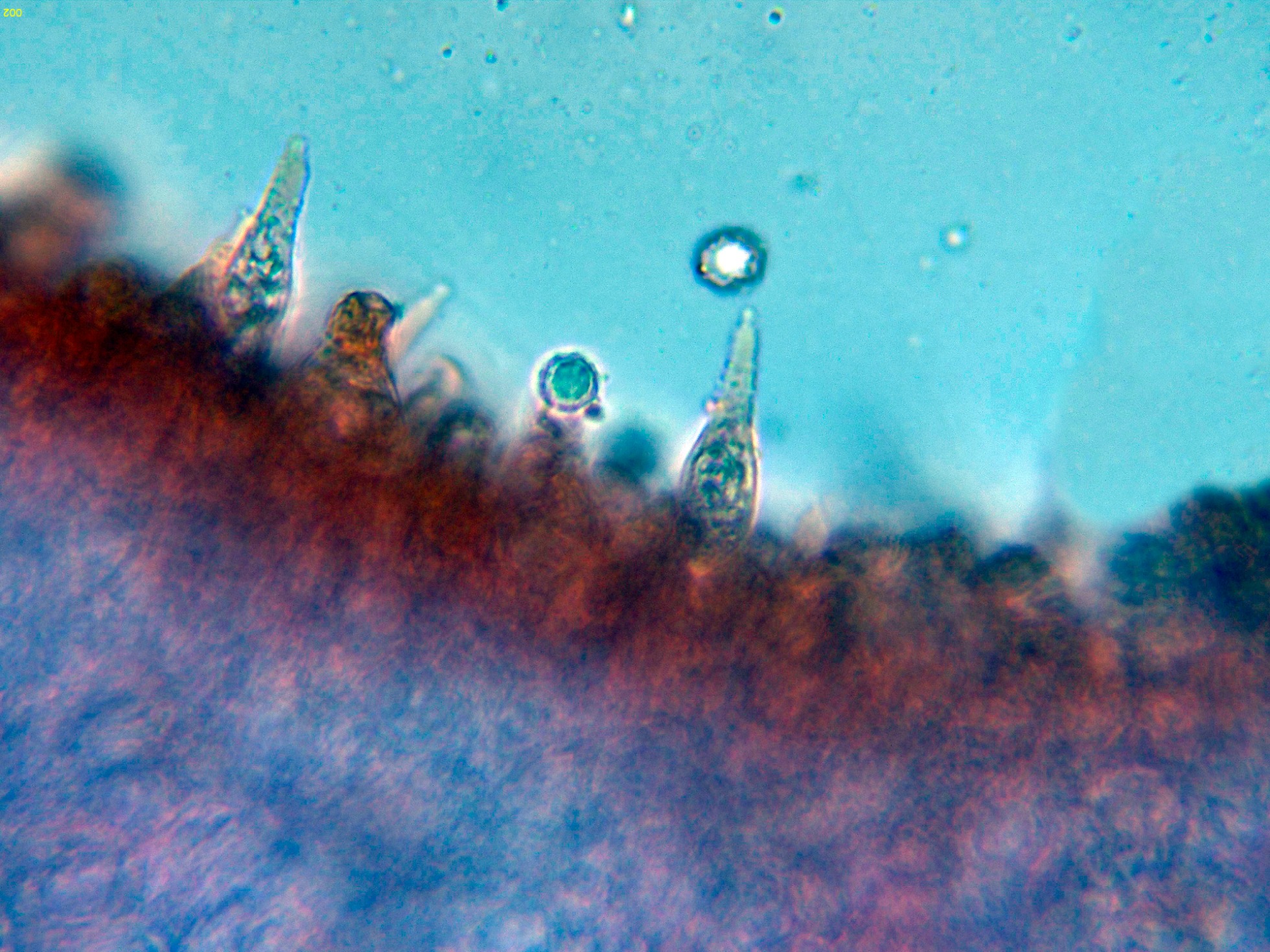 Cistidios presentes tanto en la arista como en la cara laminar, con unas medidas de (41.9) 48.4 - 63 (63.2) × (7) 7.8 - 11.4 (12.2) µm.