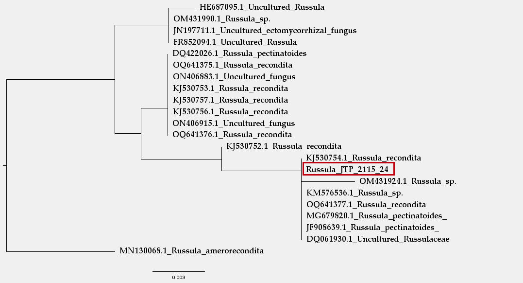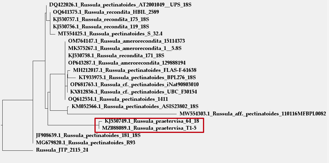 Mi propuesta (la Russula_JTP_2115_24) aparece bien alineada con la Russula pectinatoides, y en el recuadro en un clado distinto la Russula praetervisa.