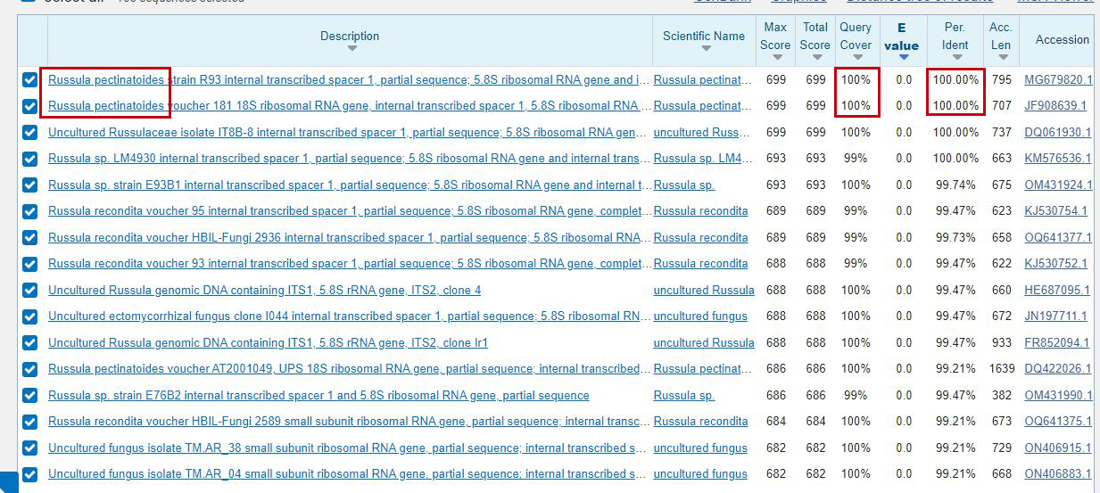 Mi propuesta se encuentra dentro del clado de la Russula pectinatoides y la Russula recondita, ambas muy parecidas en cuanto se refiere al gen ITS, tal y como ya se refleja en el resultado del Blast.