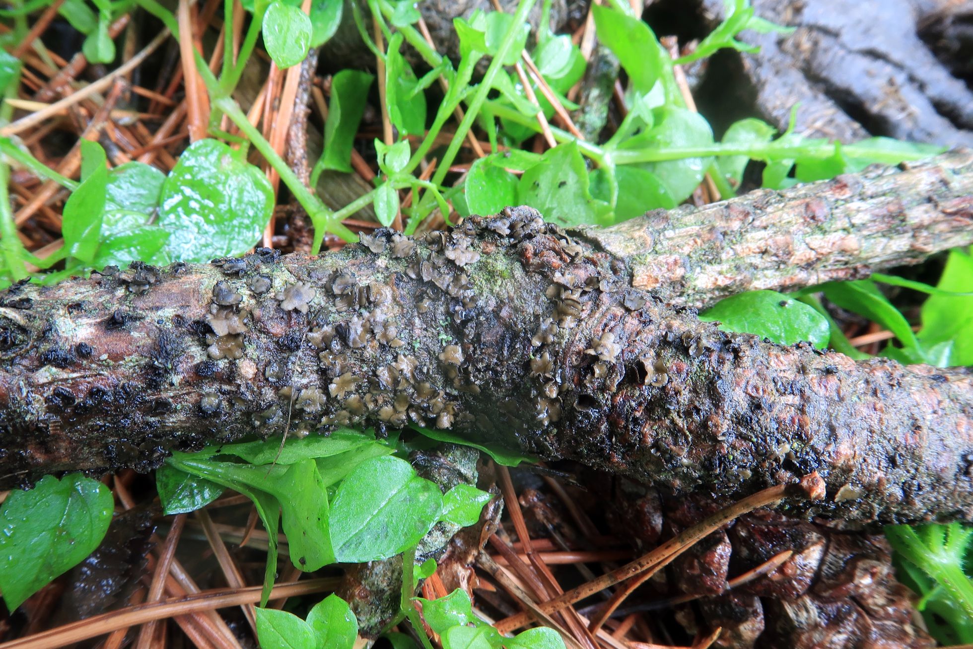 Un ascomiceto localizado el pasado 19 de mayo, brotando de manera abundante sobre la superficie de un pequeño tronco de Pinus sylvestris.