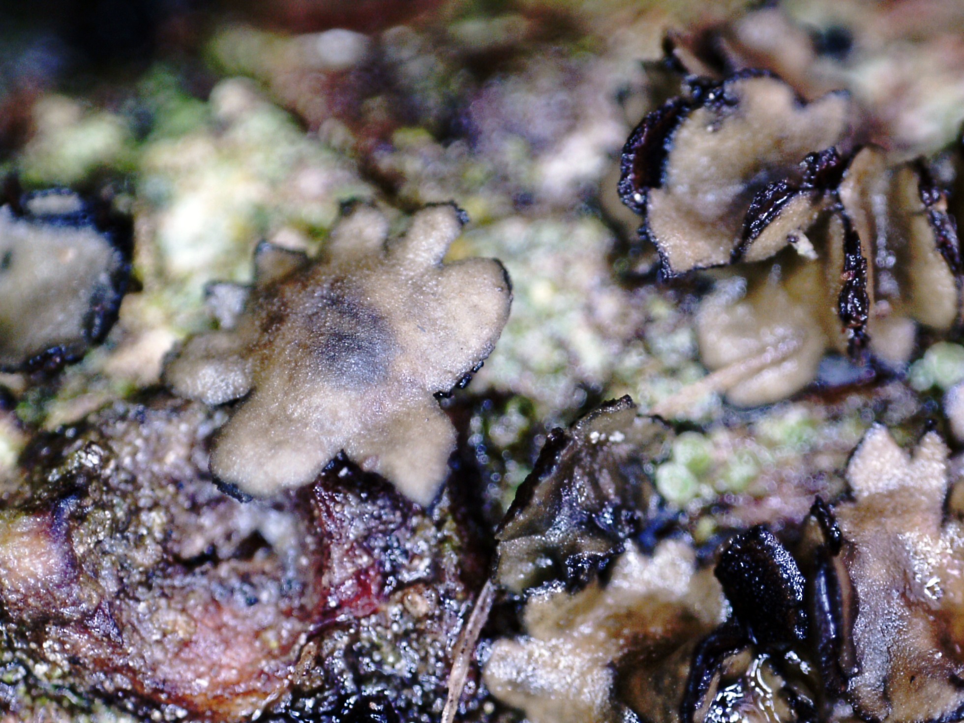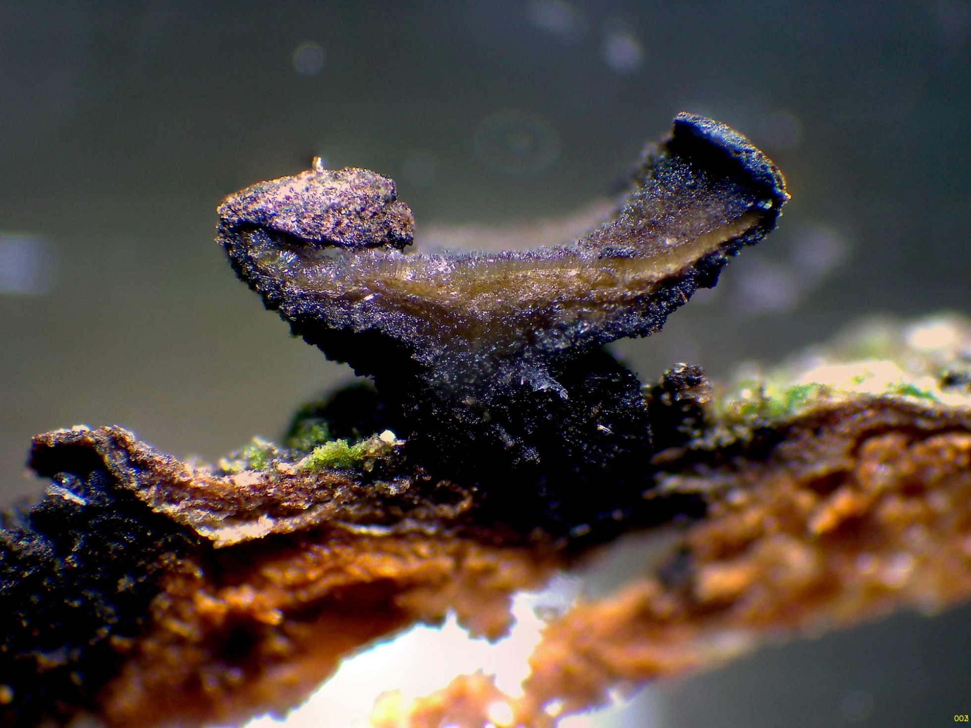 Ascomas lobulados, con aspecto de flor (floriformes), con su base de color negro y unidos al sustrato por su parte central, con un muy rudimentario pseudopié.