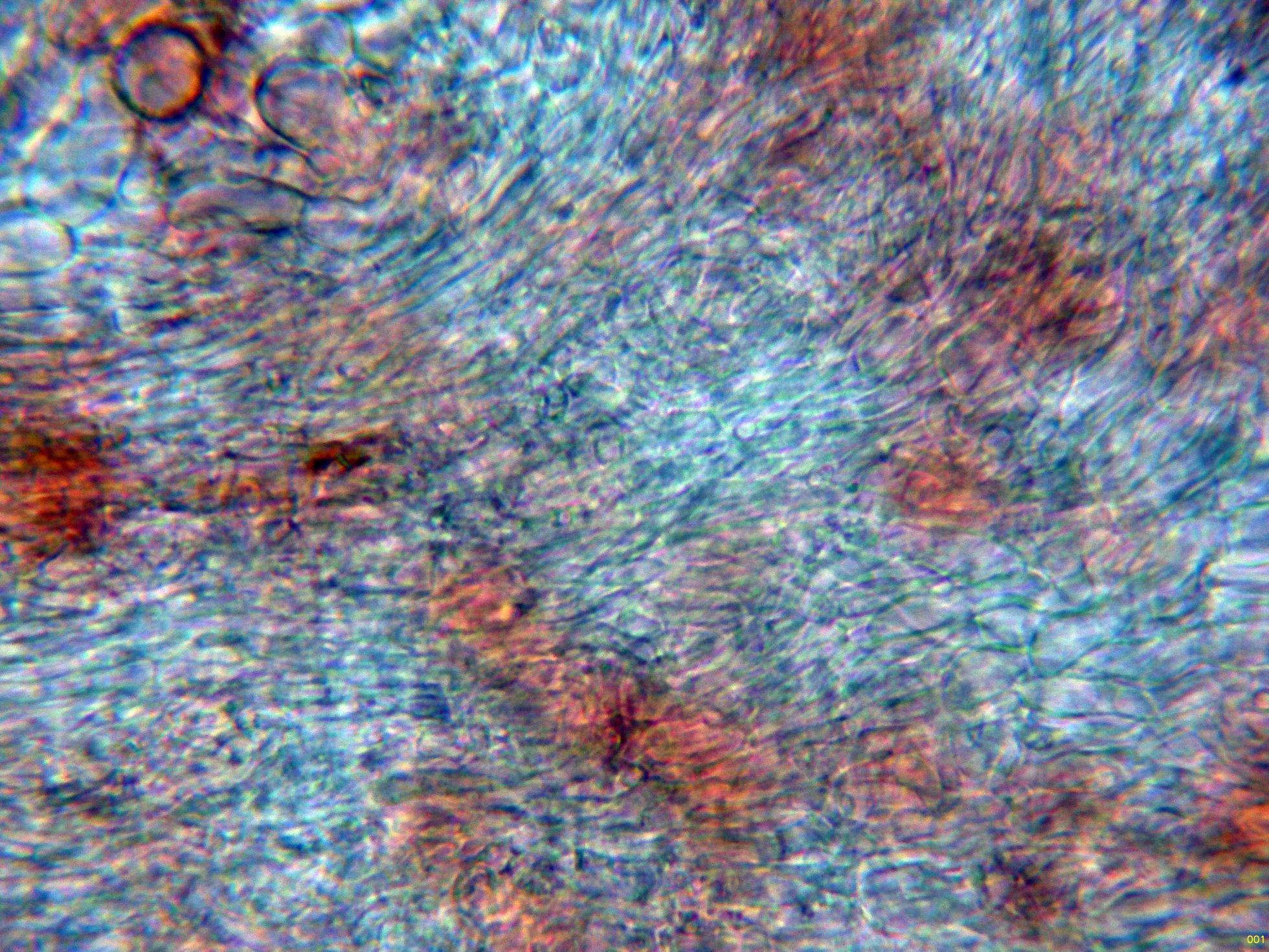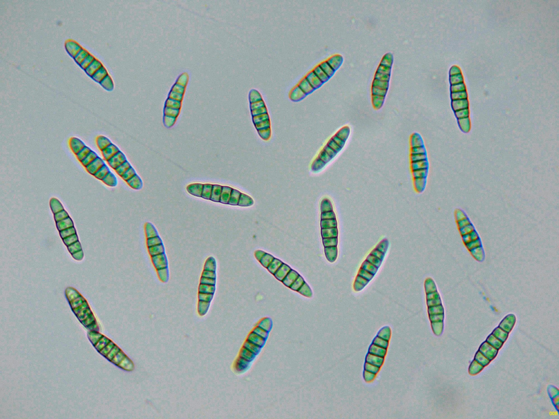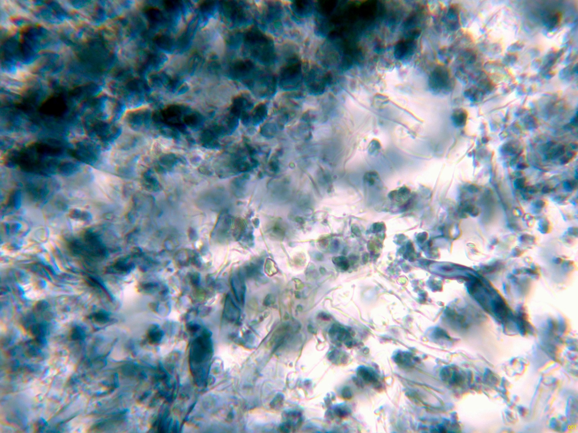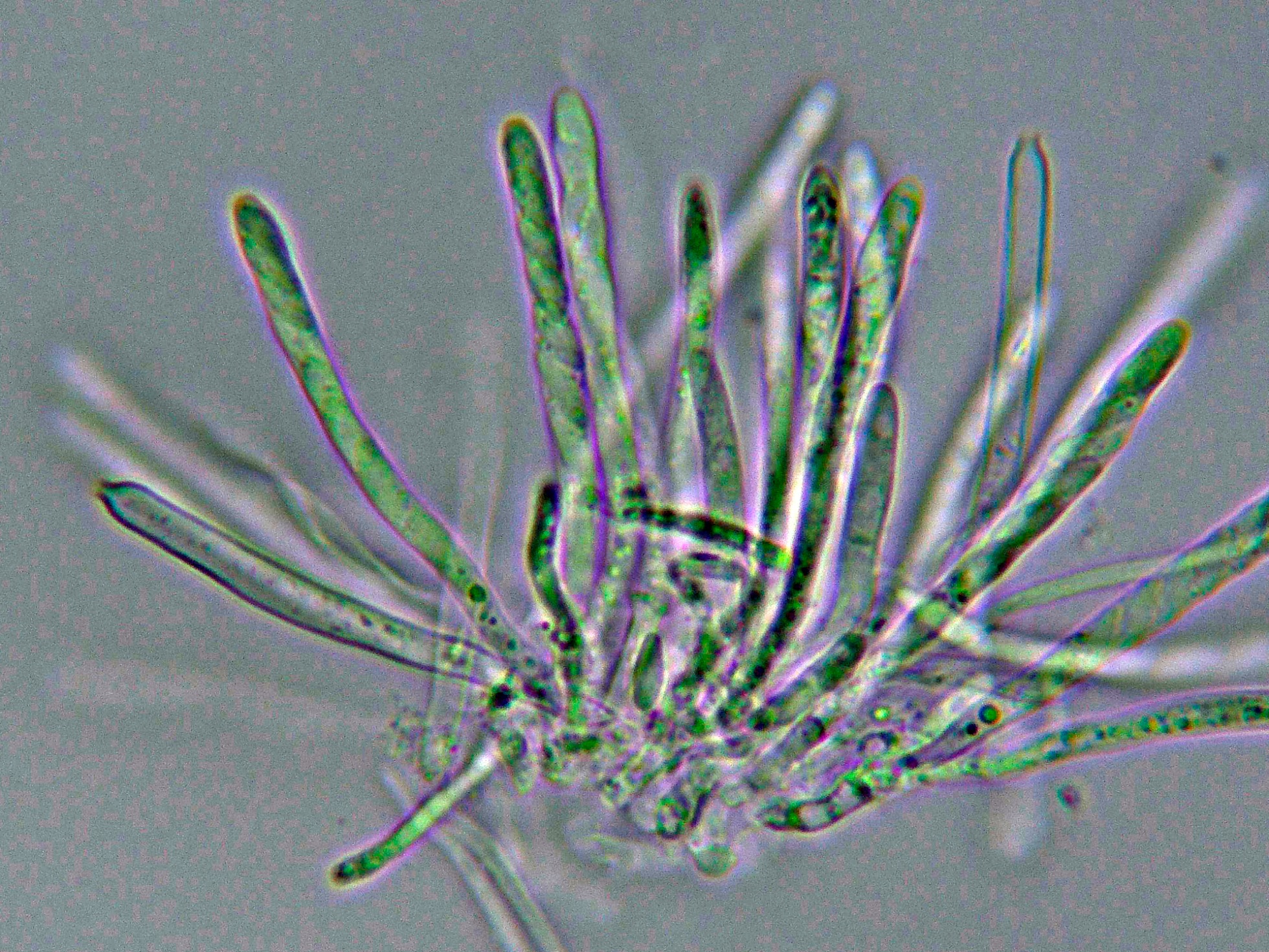 Las hifas subiculares en agua, fuertemente pigmentadas de azul.