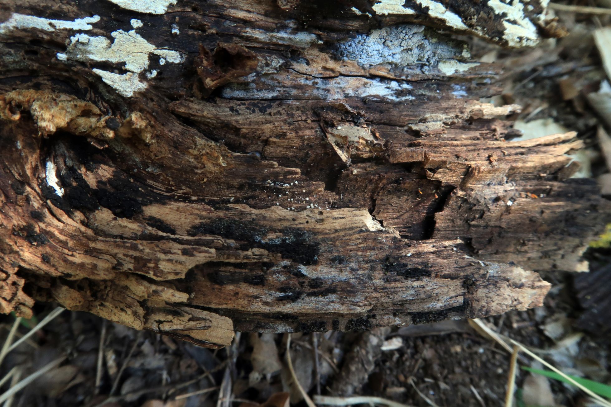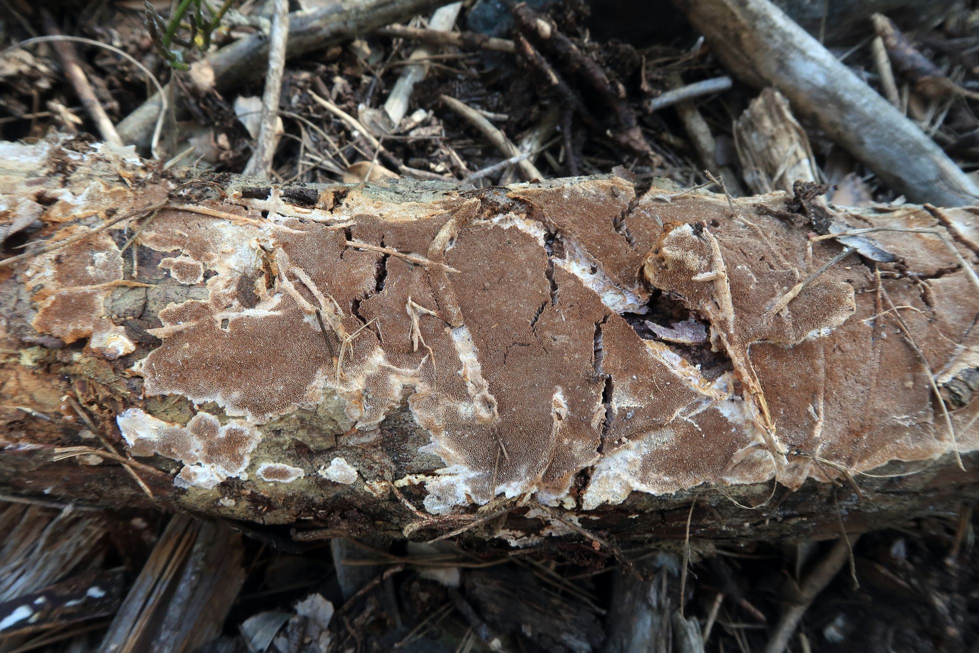Un Phellinus completamente resupinado, muy probablemente Phellinus ferruginosus.