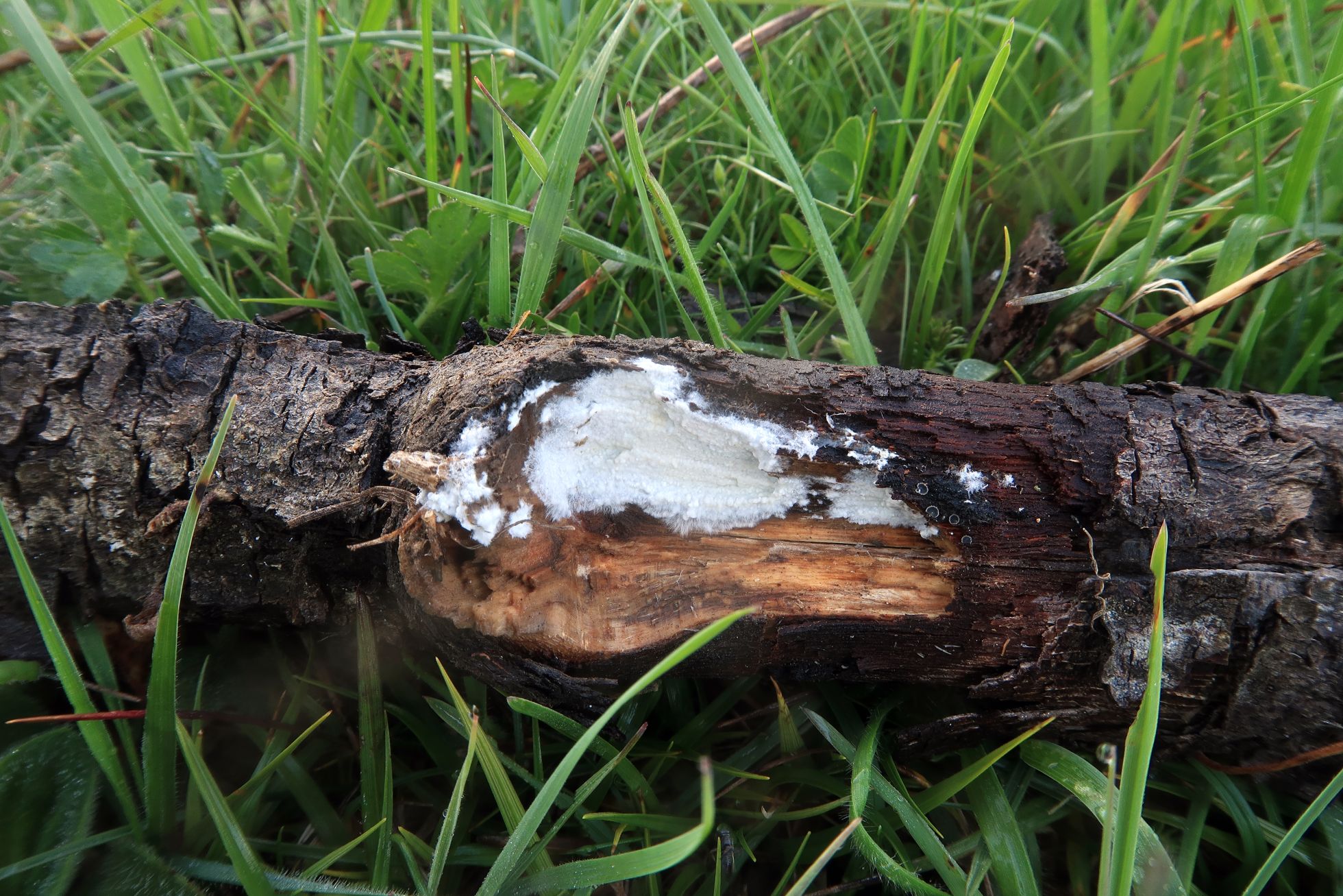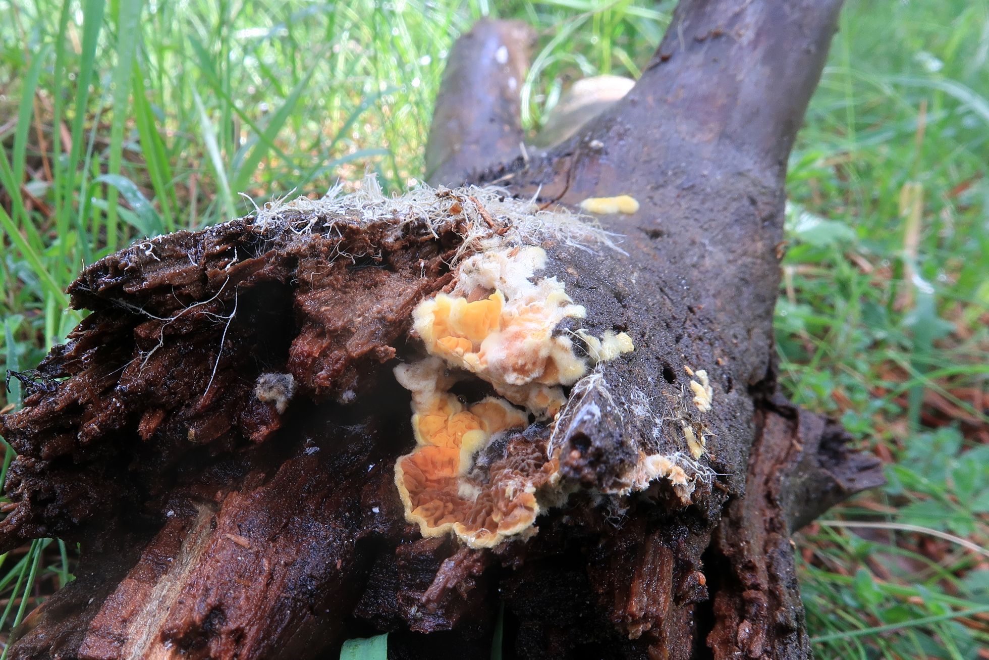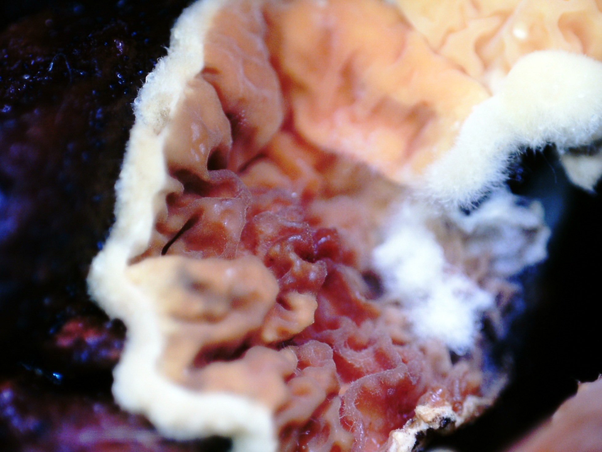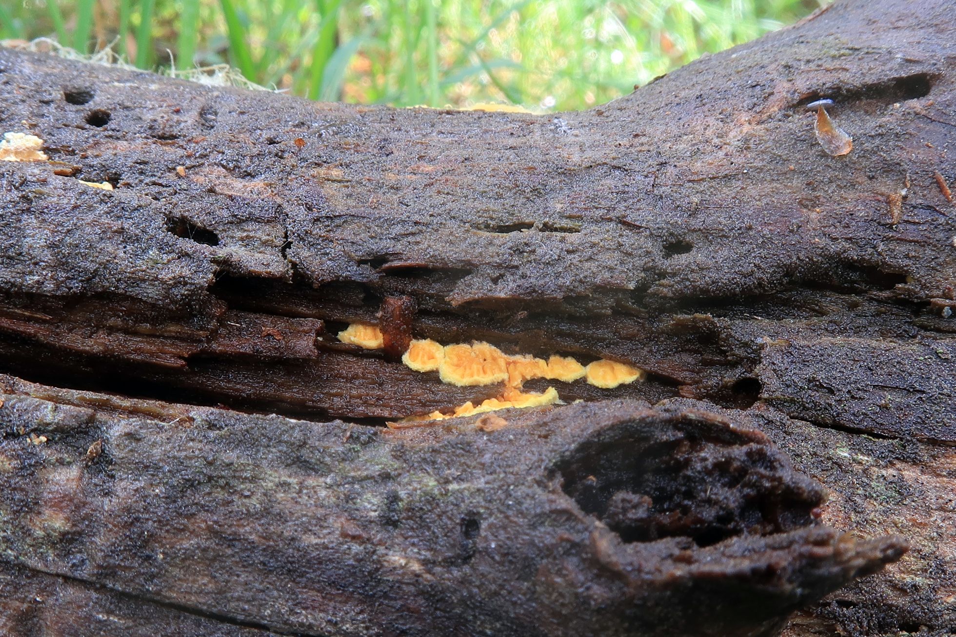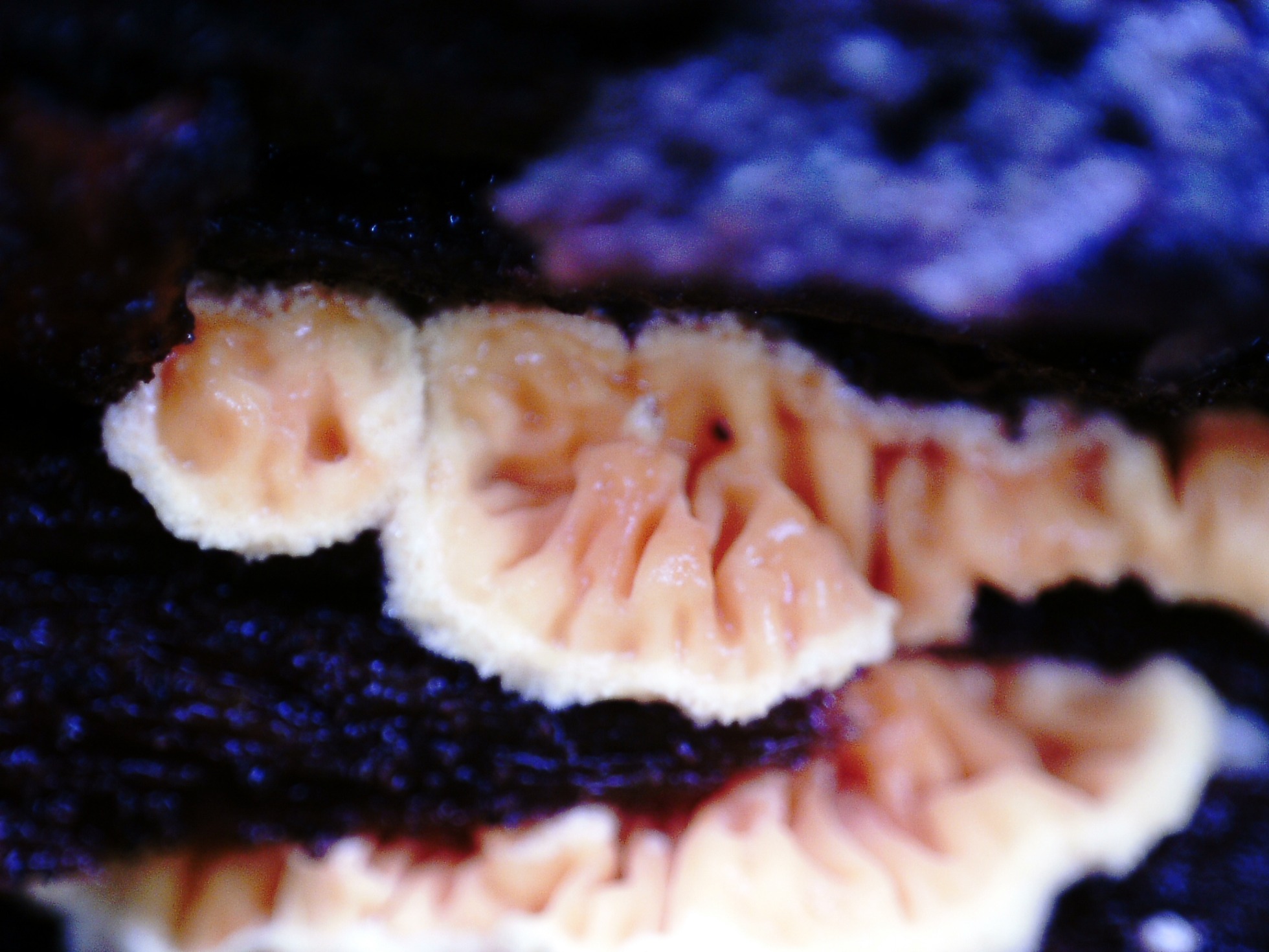Un Corticial Meruloide, segunda vez que me lo encuentro, muy parecido a la Leucogyrophana mollusca, pero con esporas muy diminutas y una microscopía completamente distinta, el Pseudomerulius aureus.