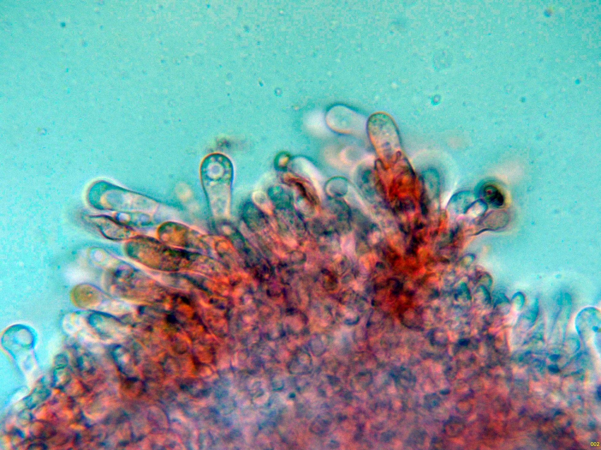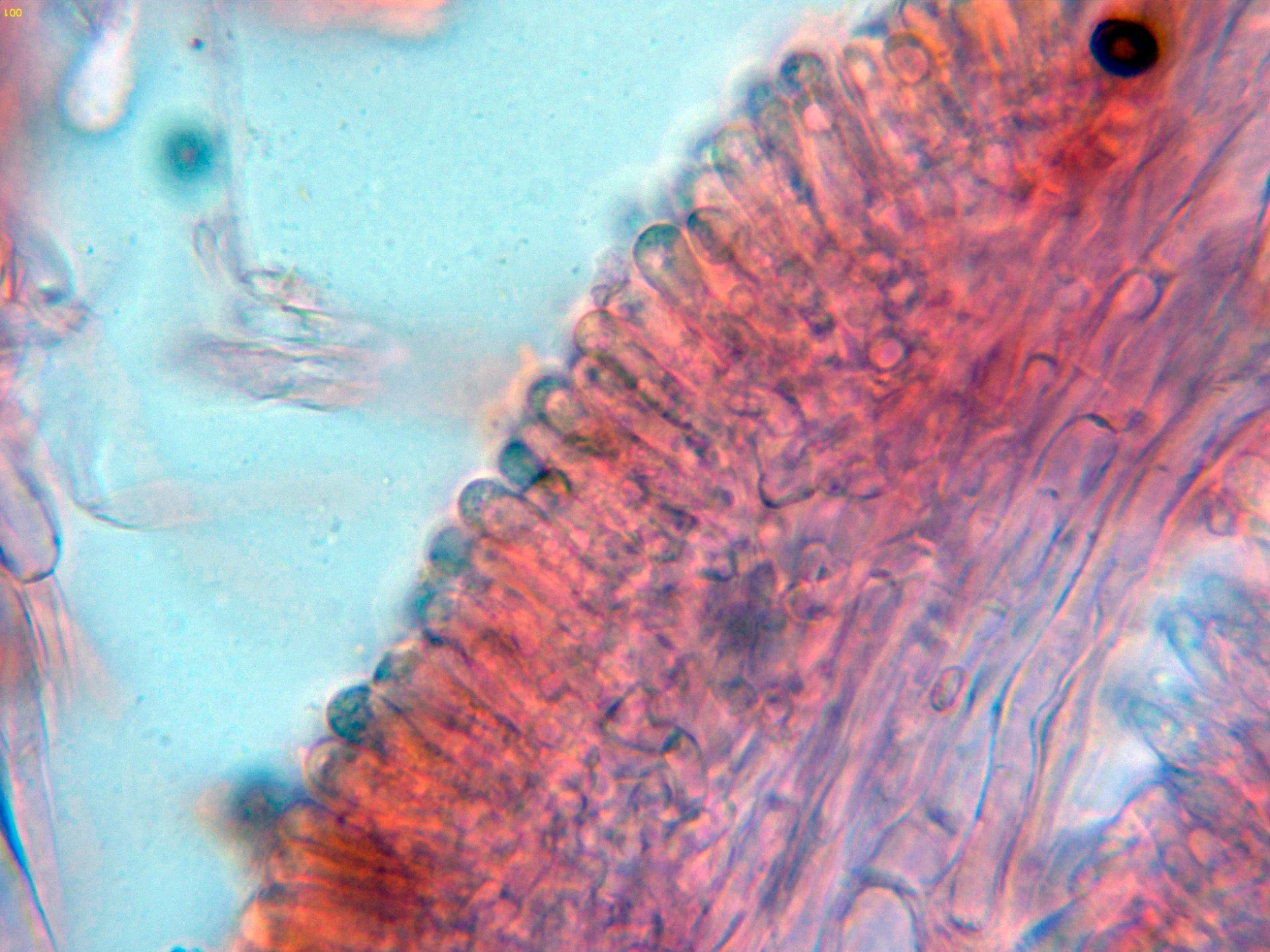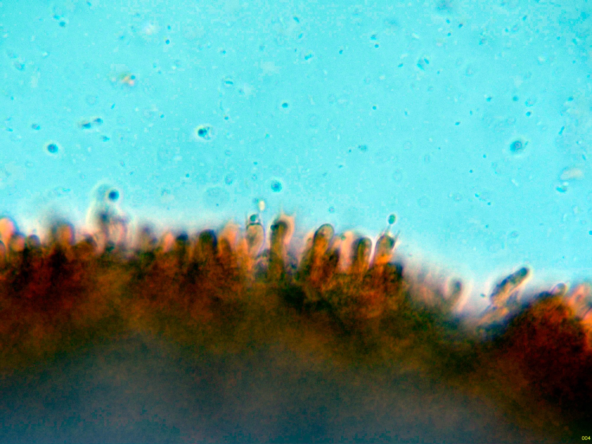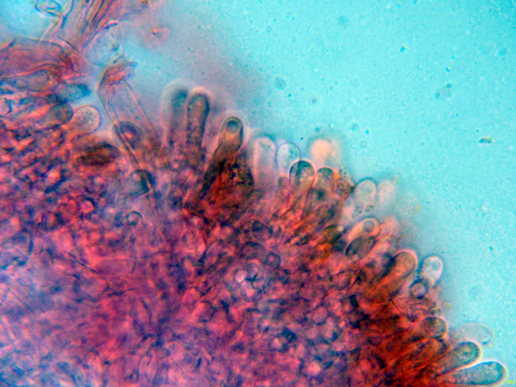 Arista laminar con queilocistidios no muy distintos de los basidios o basidiolos, con unas medidas de (17.3) 18.8 - 24.5 (25.7) × 5.9 - 8 (8.5) µm.