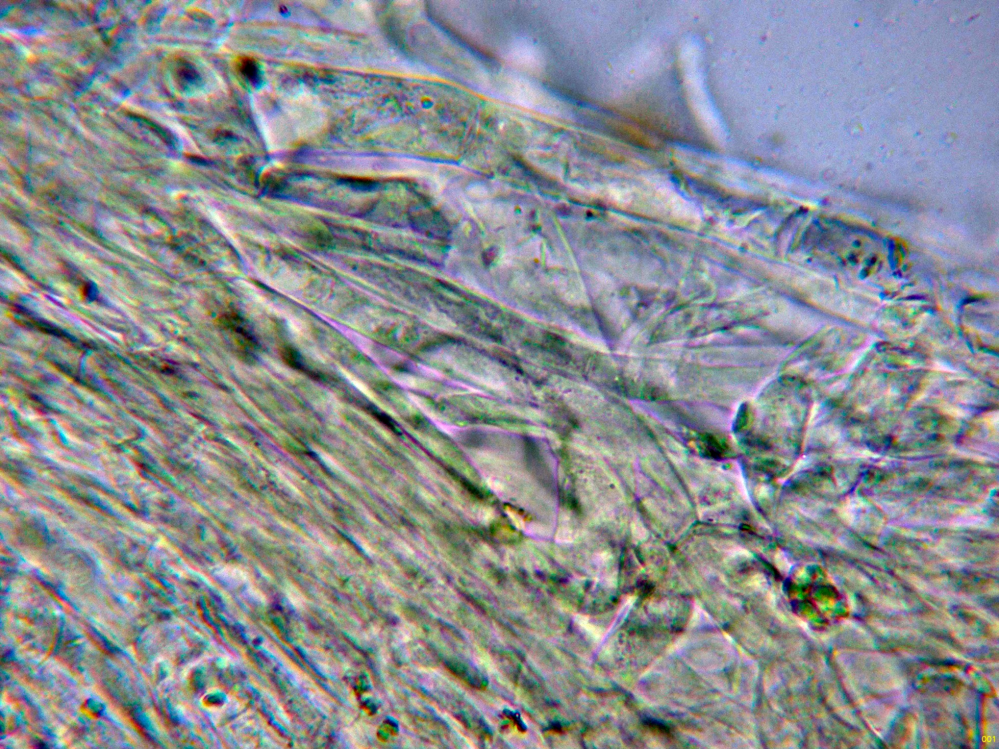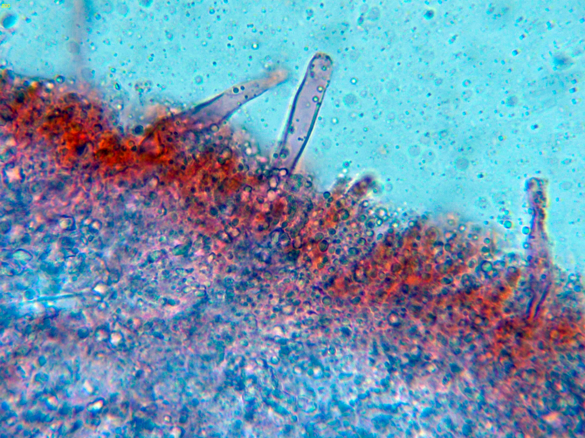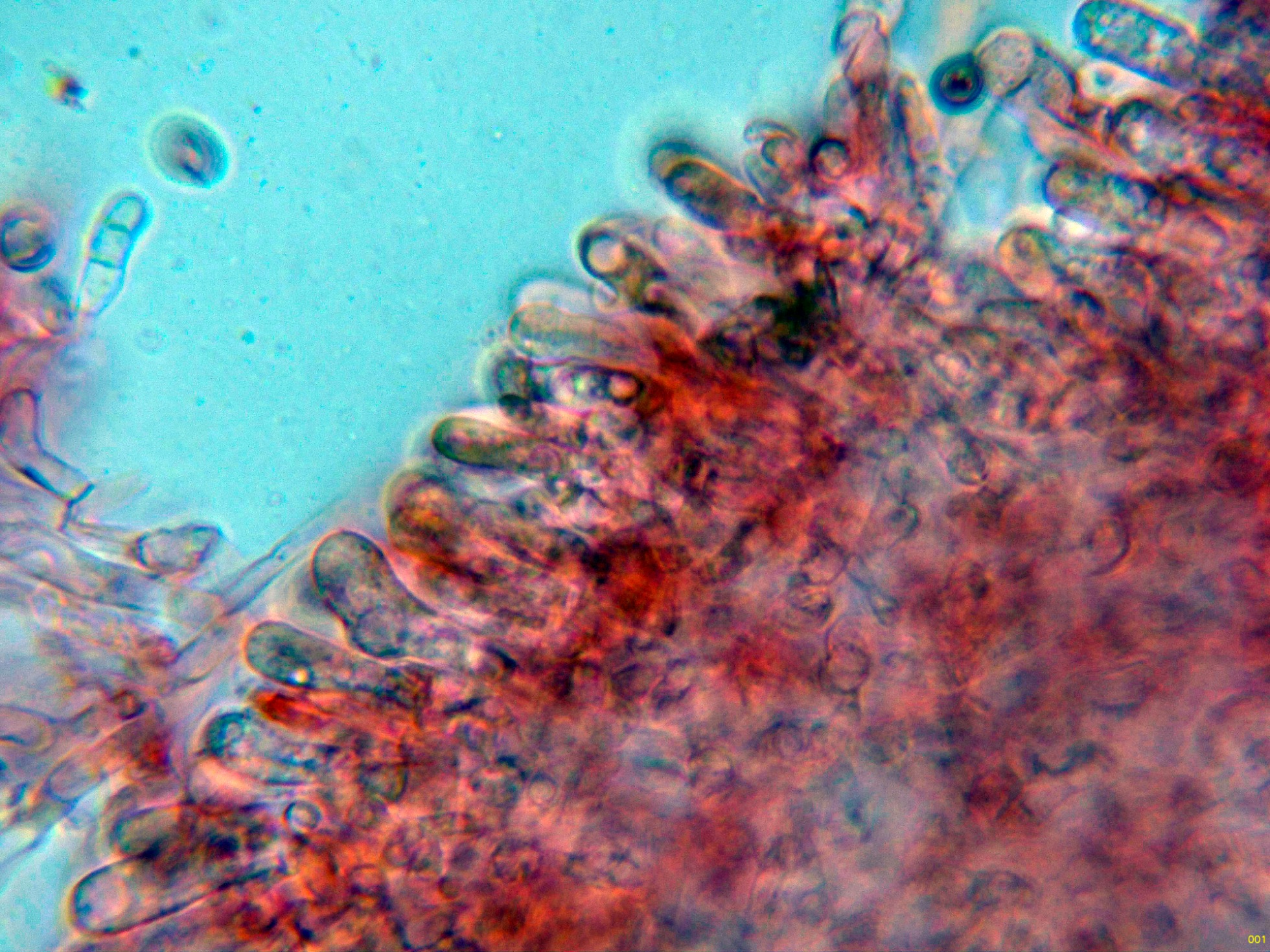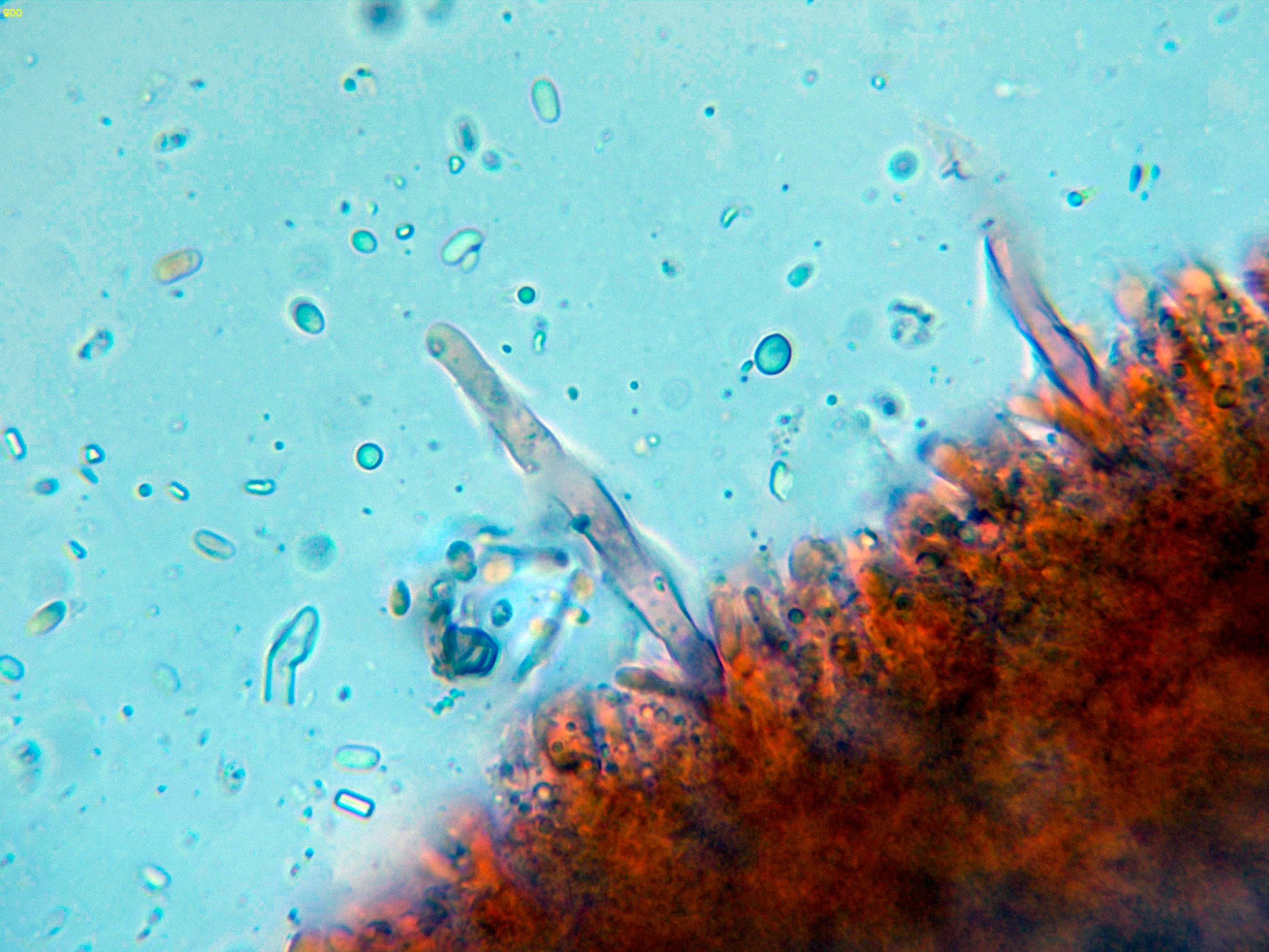 Arista laminar con queilocistidios no muy distintos de los basidios o basidiolos, con unas medidas de (17.3) 18.8 - 24.5 (25.7) × 5.9 - 8 (8.5) µm.