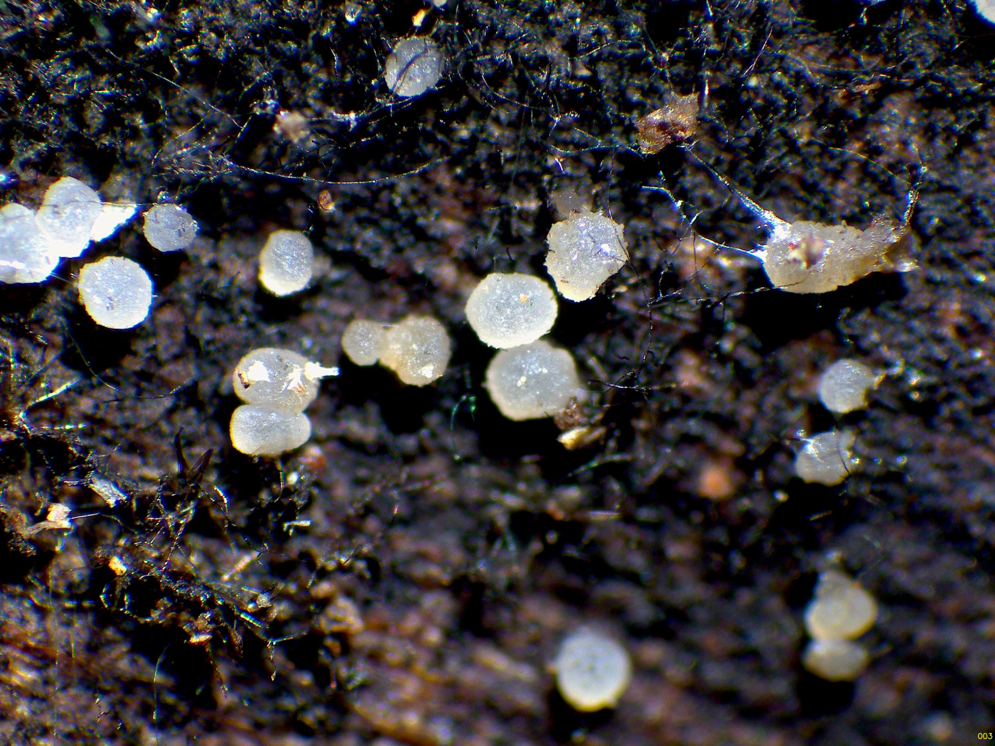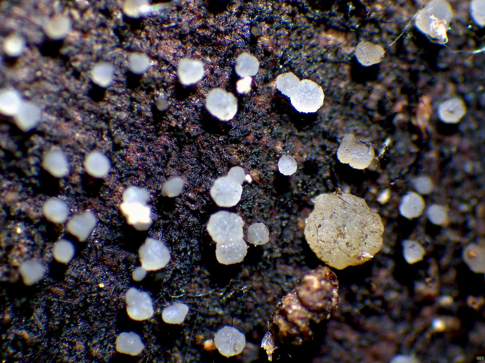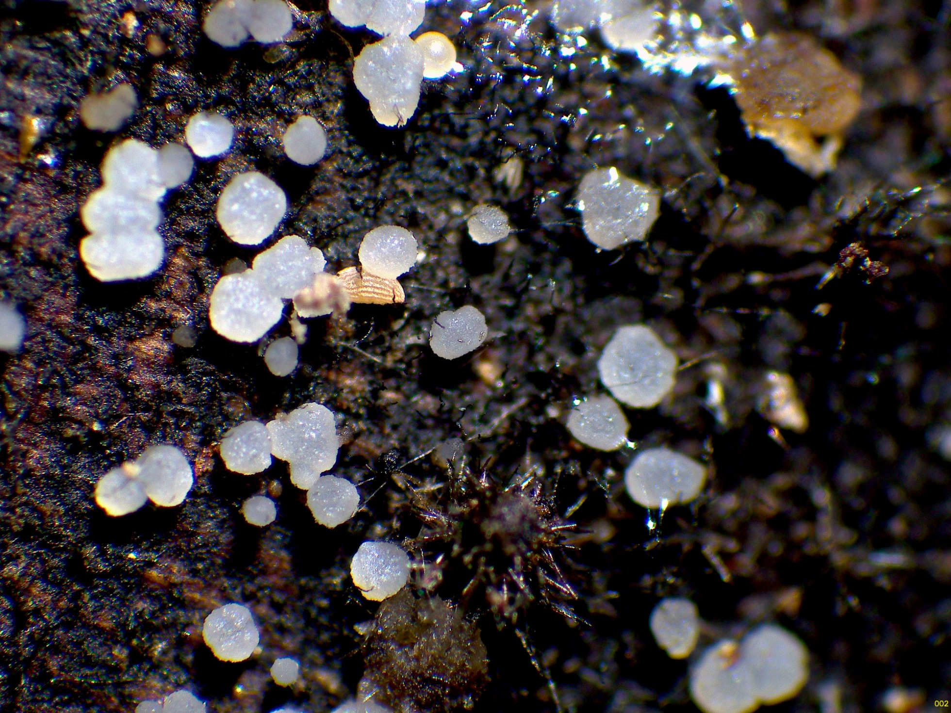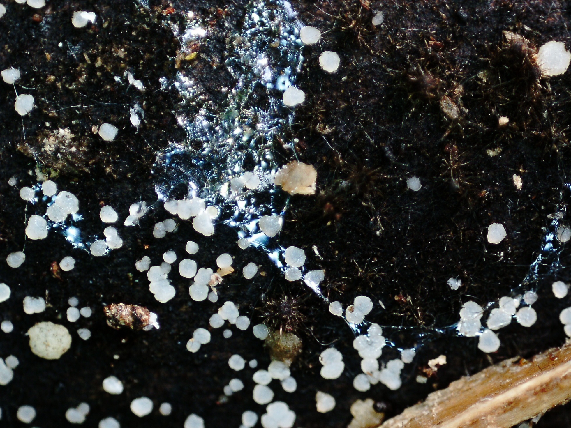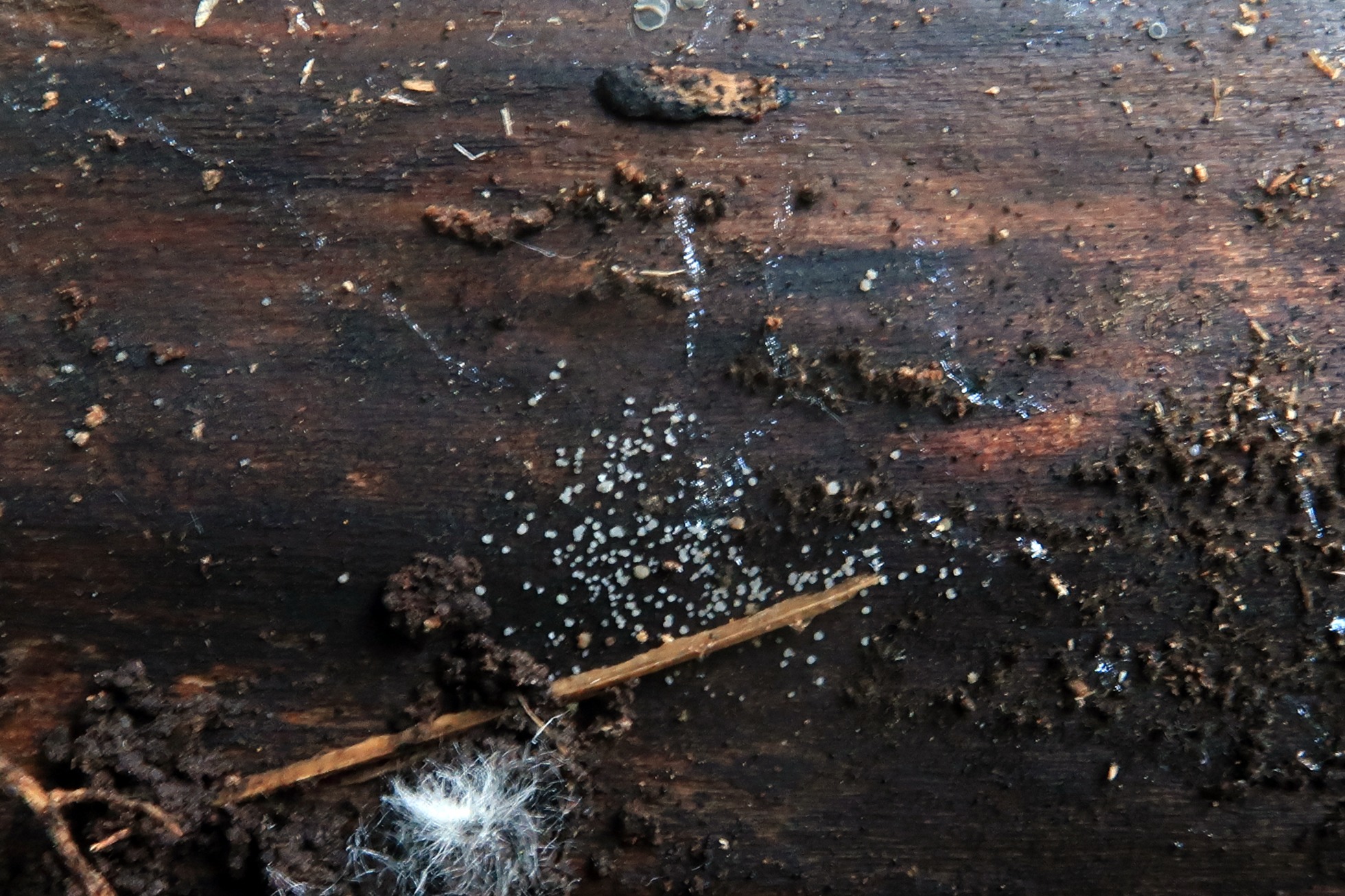 Un diminuto ascomiceto blanco fotografiado el 9 de junio, brotando de manera dispersa pero abundante sobre la superficie de un tronco tumbado, por la parte que está en contacto con el suelo.