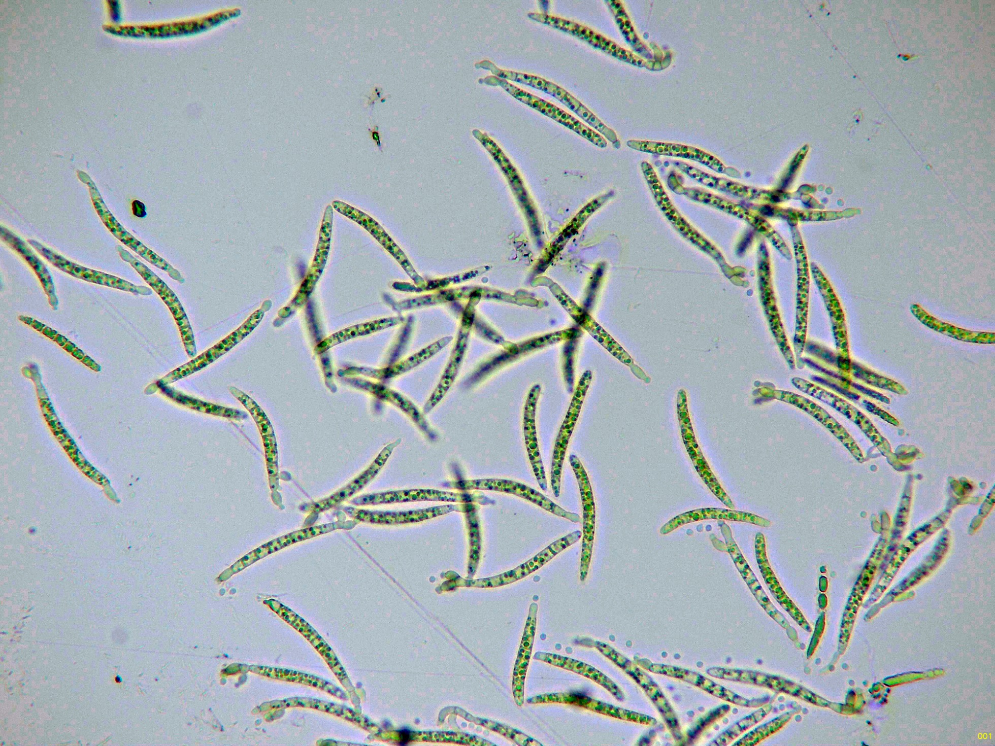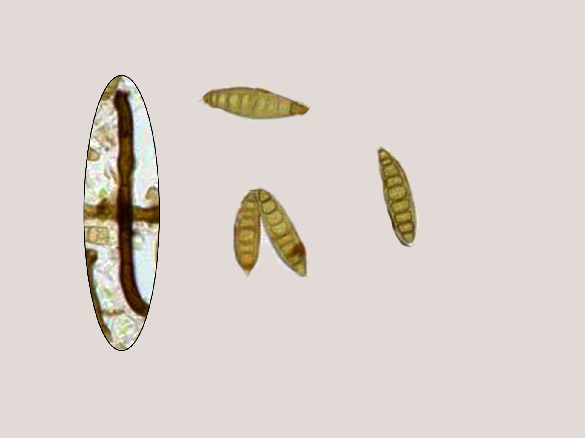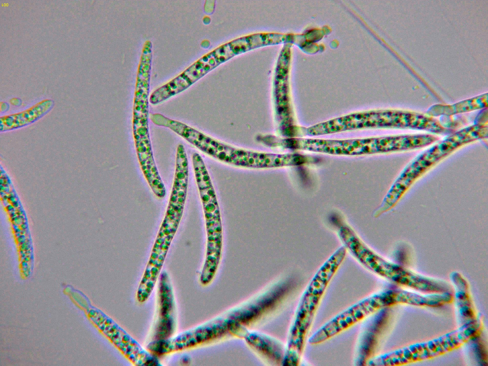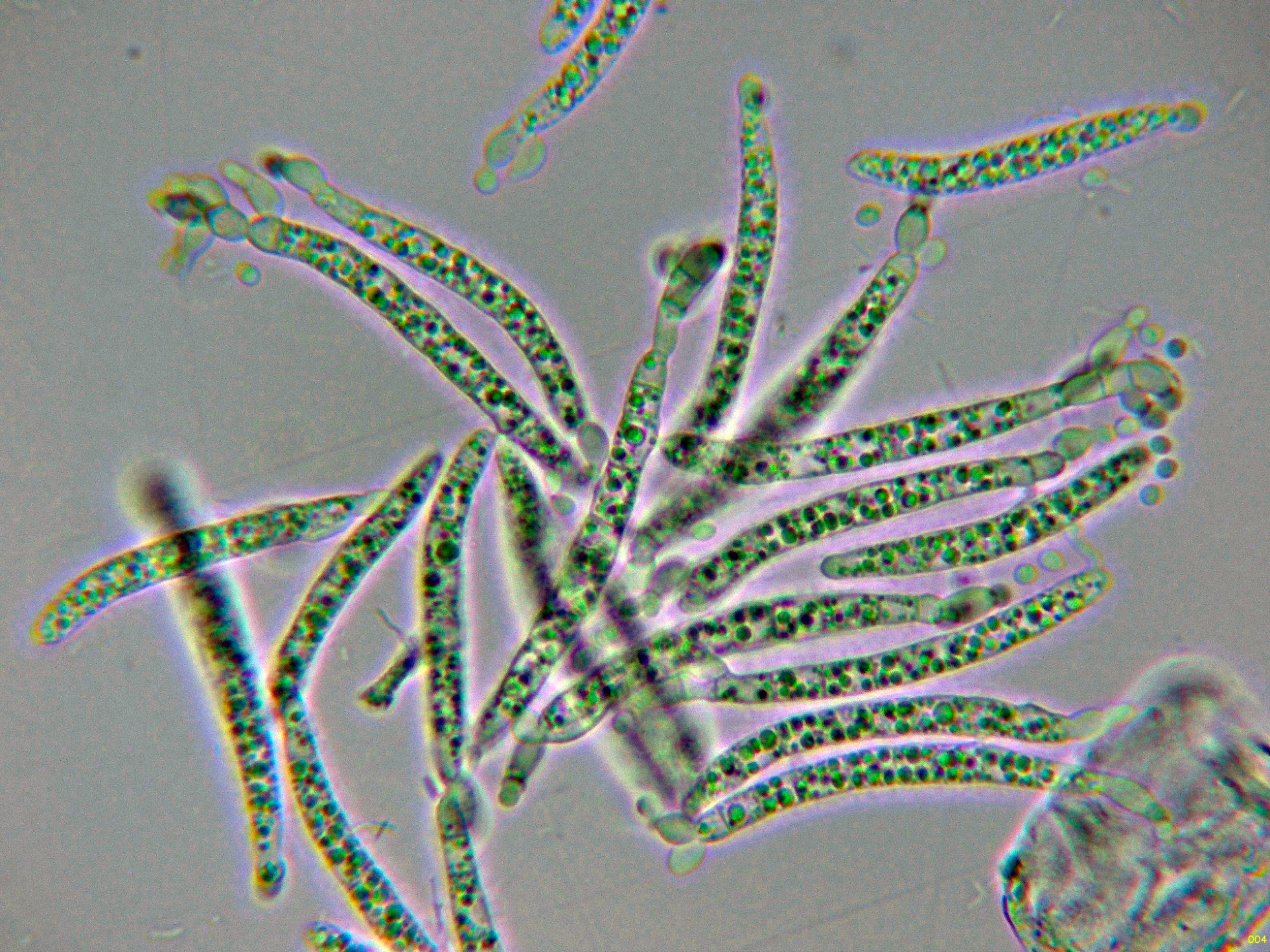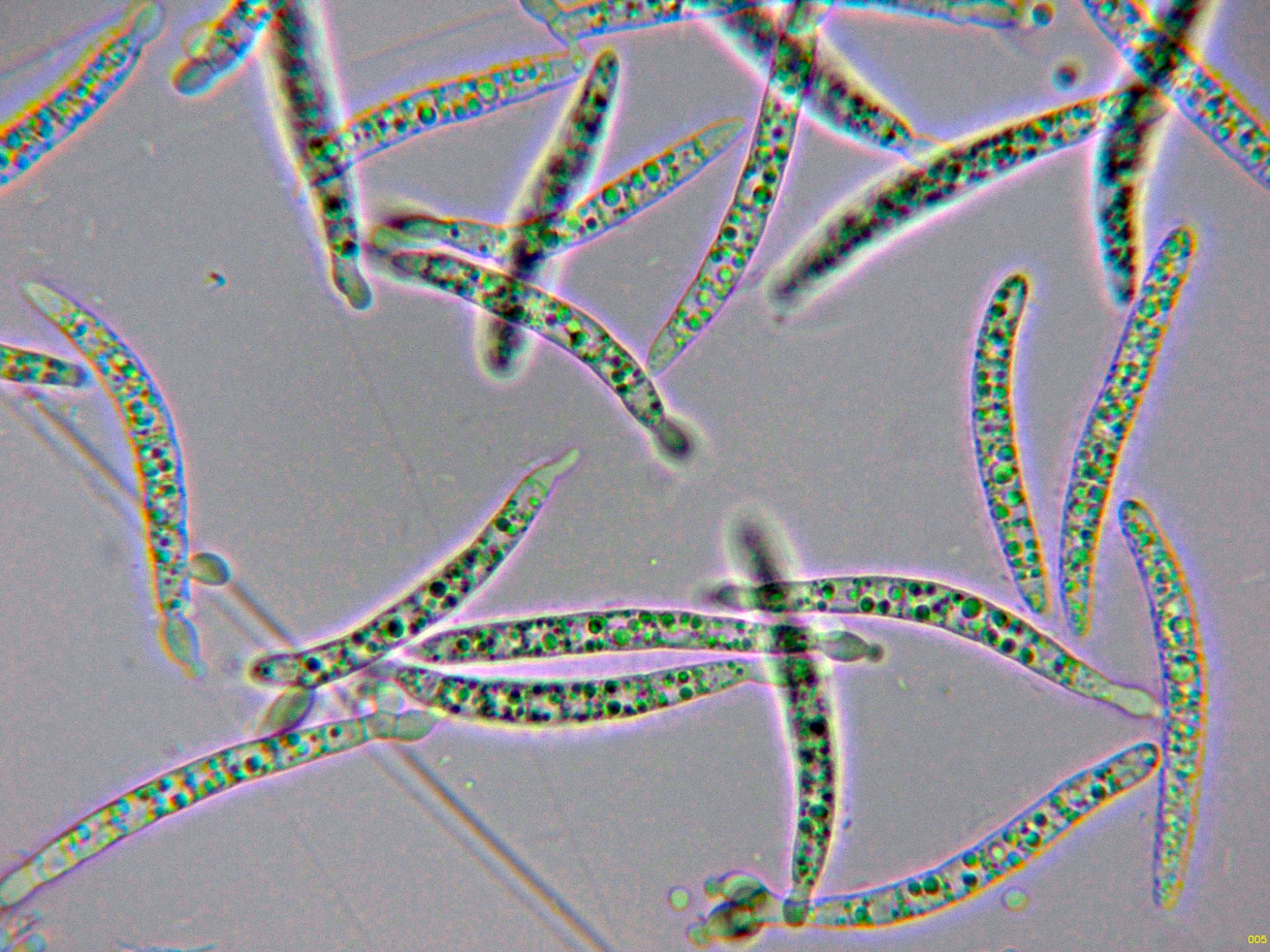 Dejo una composición de los pocos conidios que he podido salvar de mis imágenes y en la parte izquierda una supuesta hifa conidiógena.