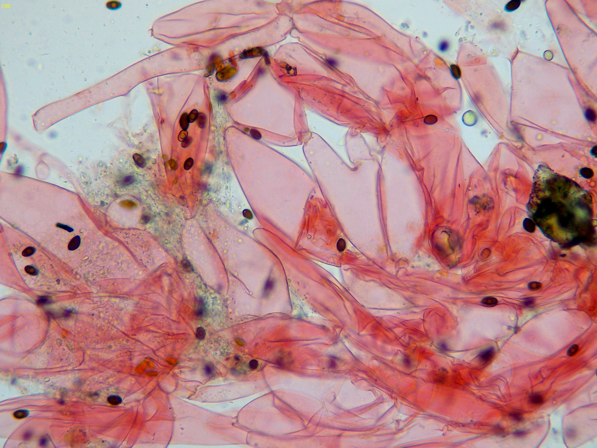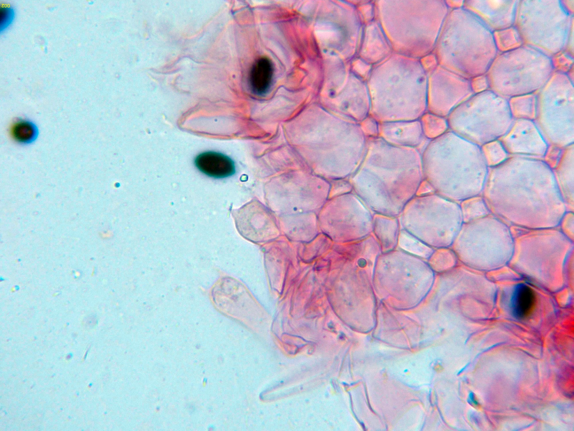 Abundantes cistidios, estos cistidios en Rojo Congo y a 400 aumentos.