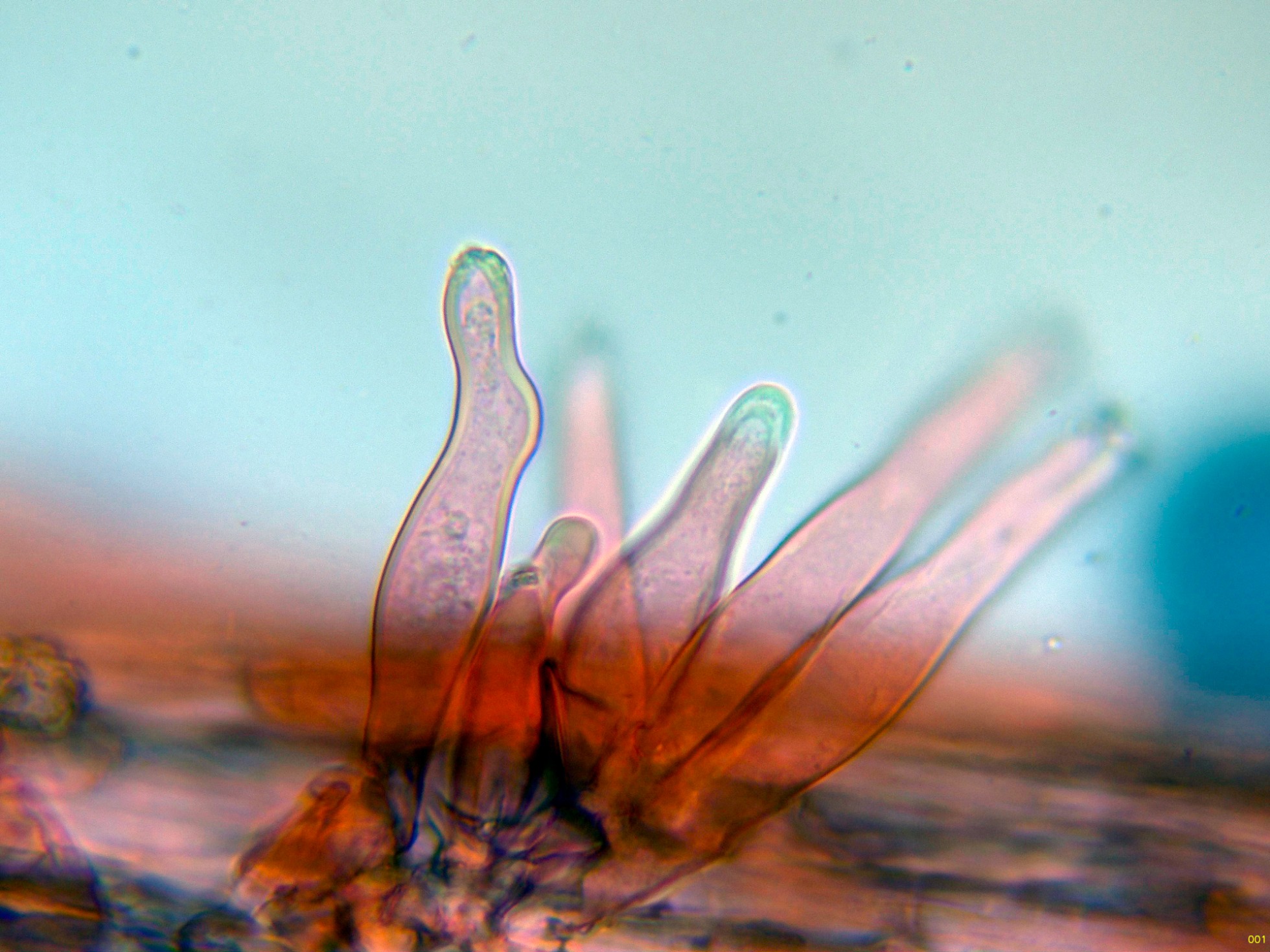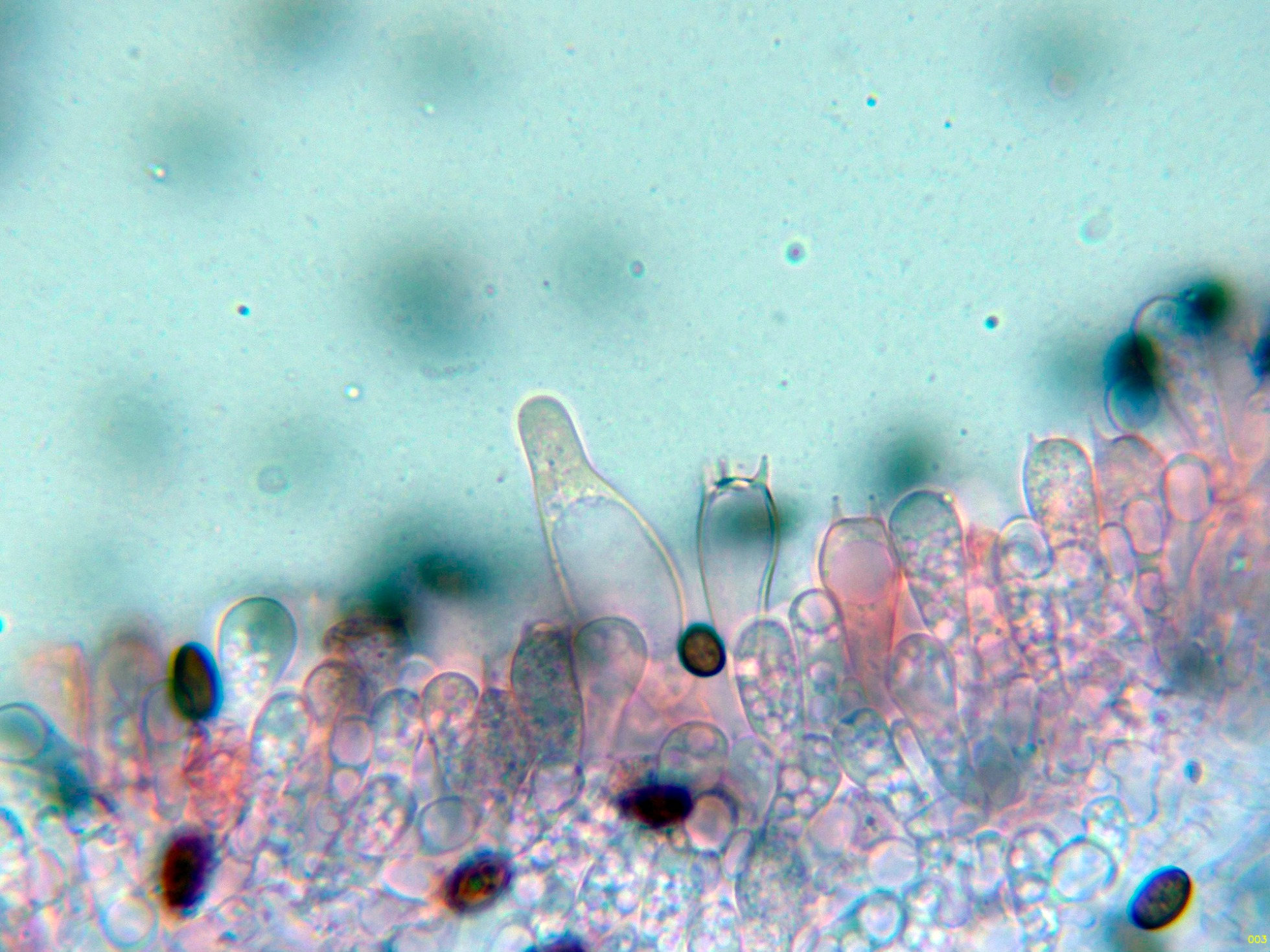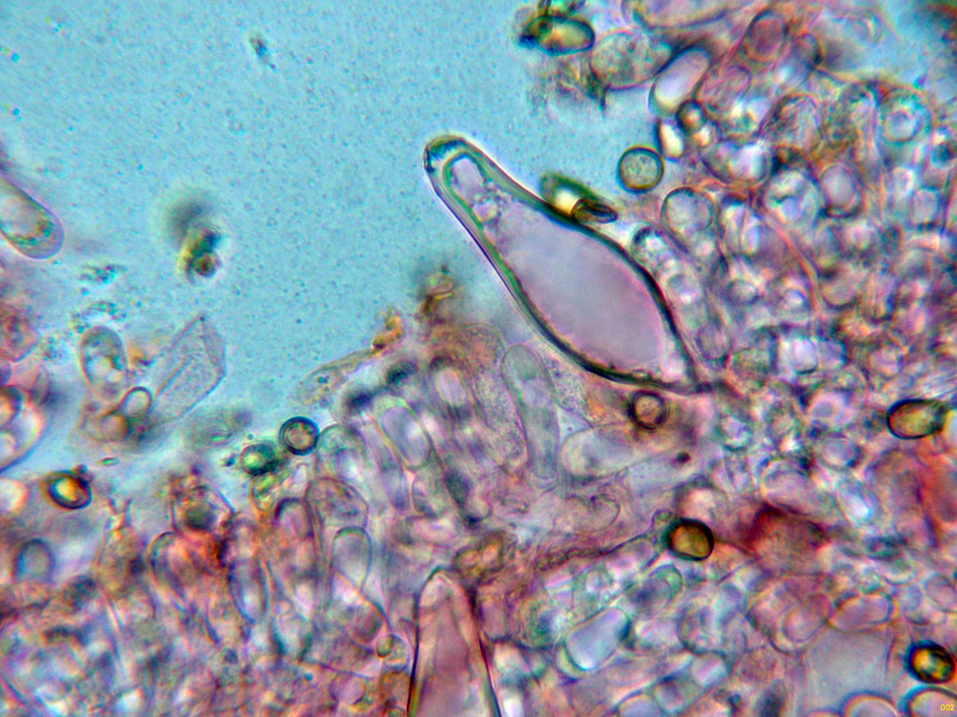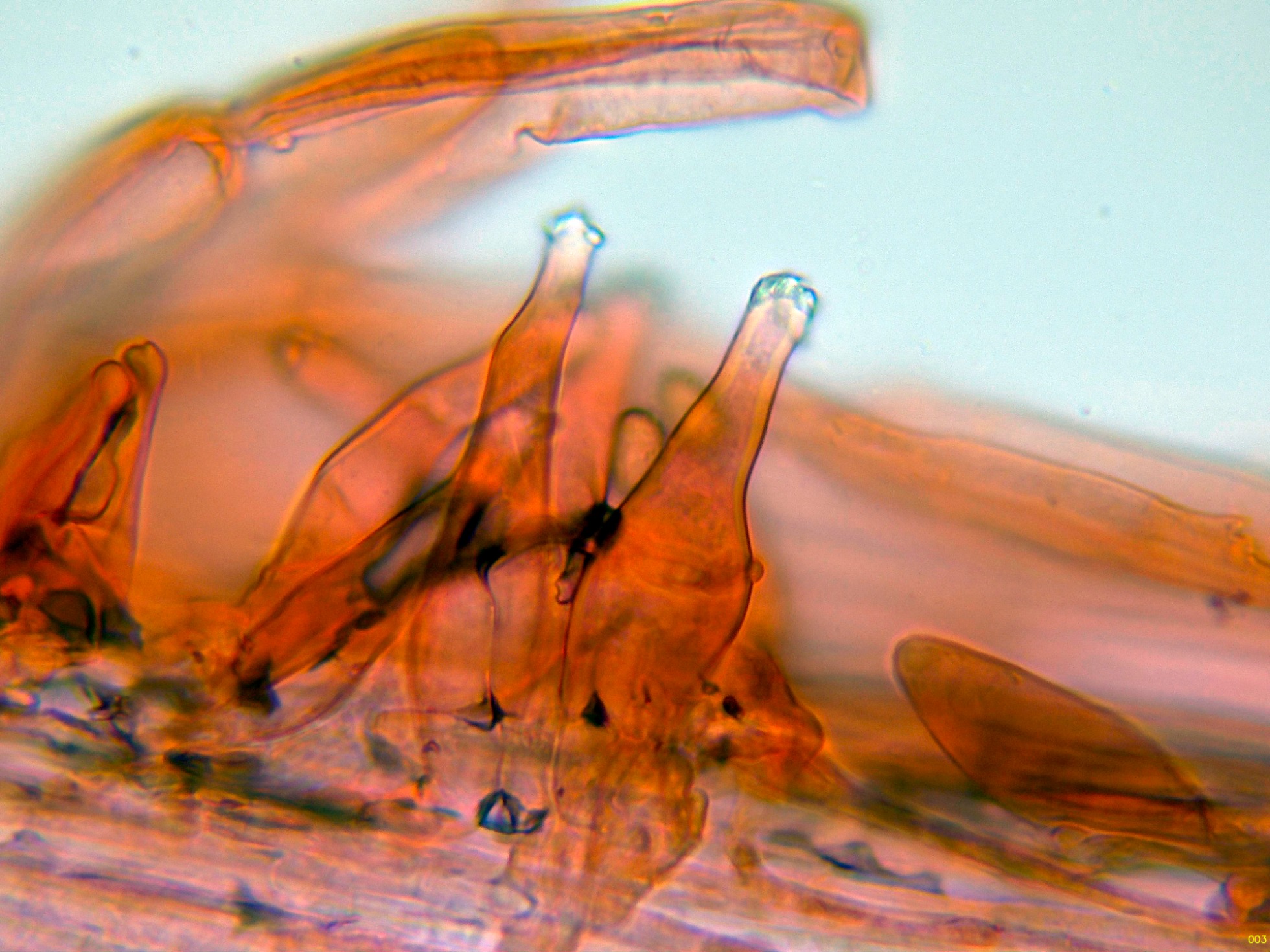 Queilocistidios muy abundantes con cristalizaciones en el ápice, con unas medidas de (39.5) 47.3 - 56.8 (62.2) × (10.7) 11.4 - 15.7 (16.8) µm.