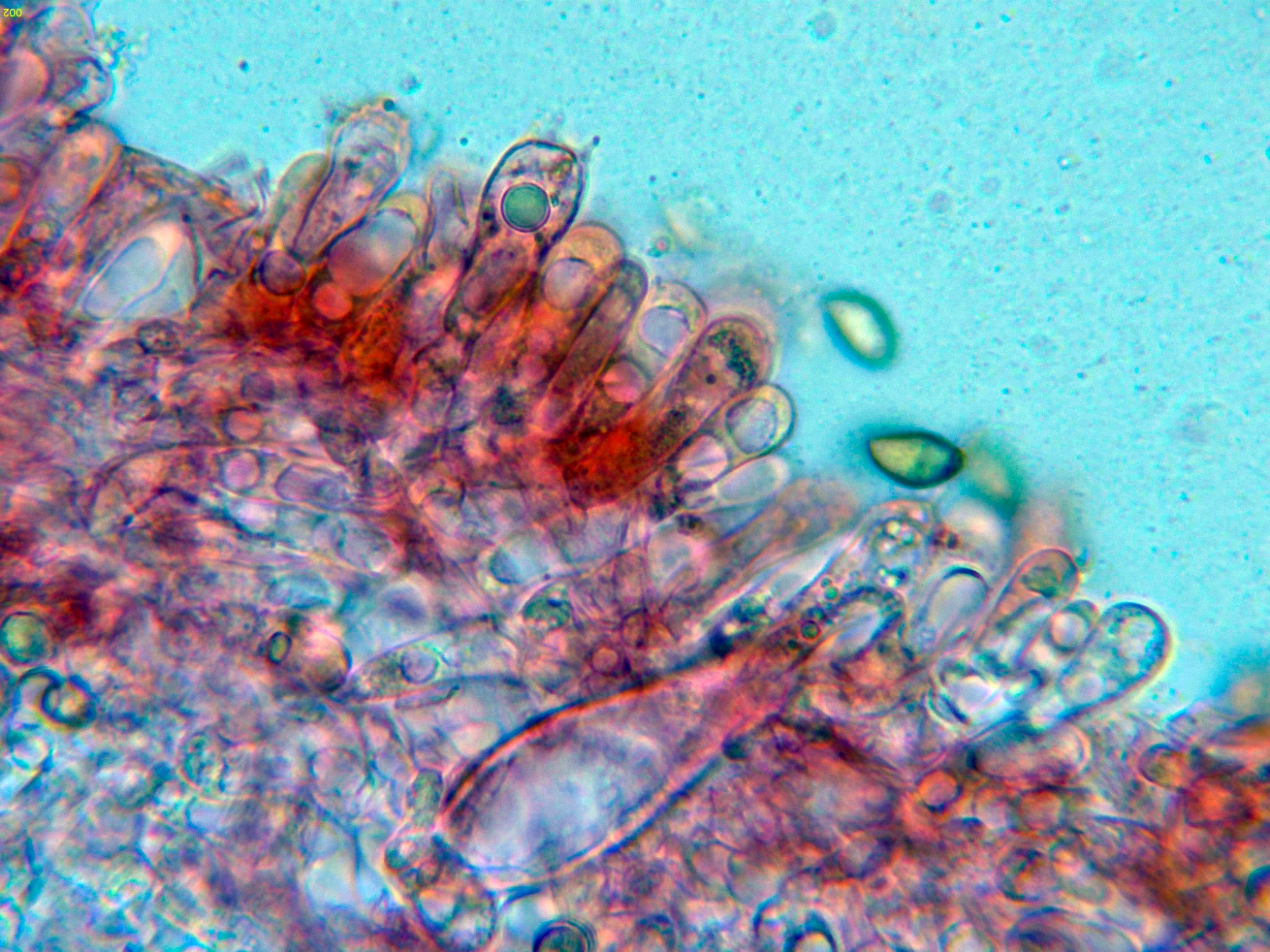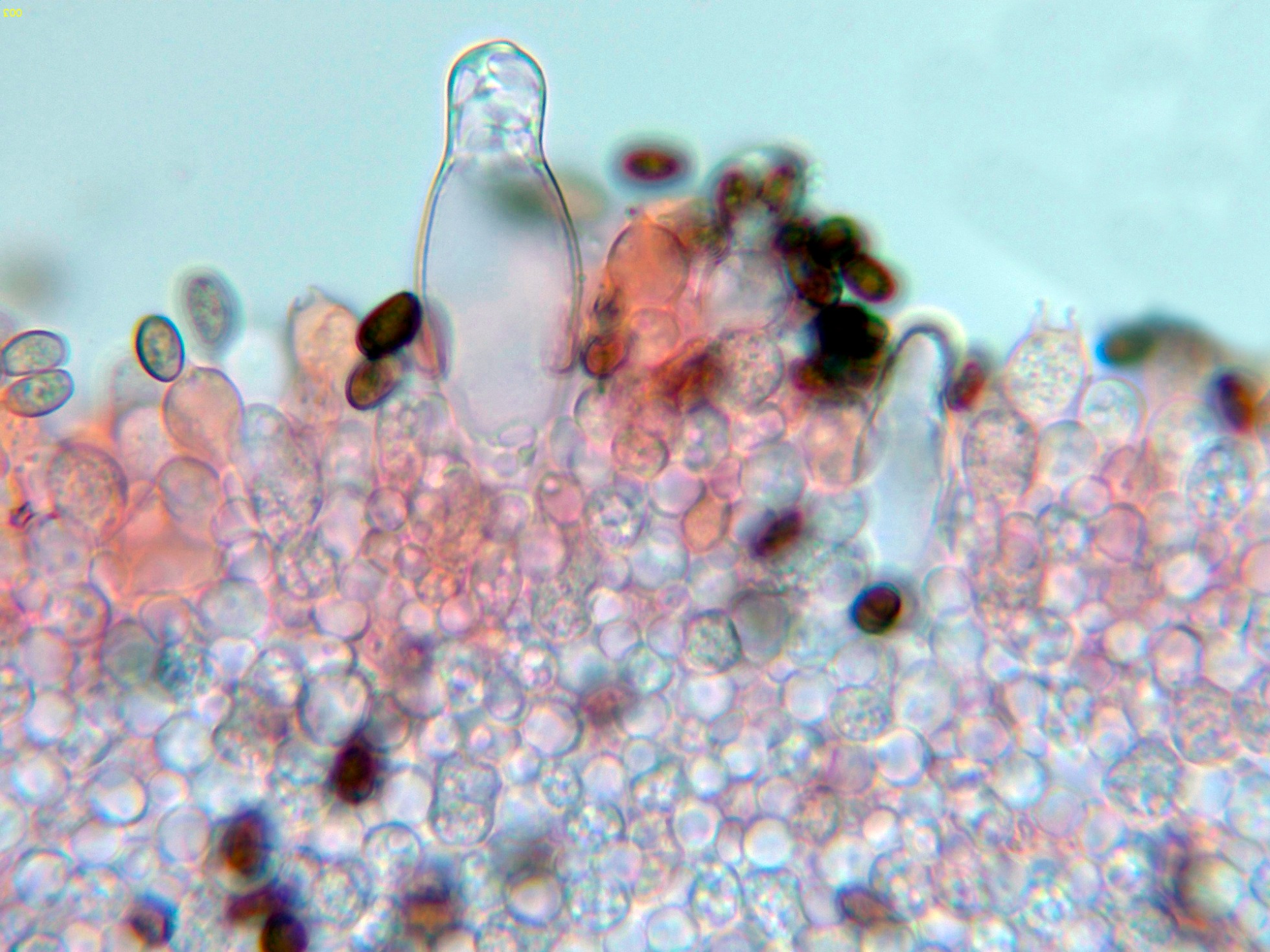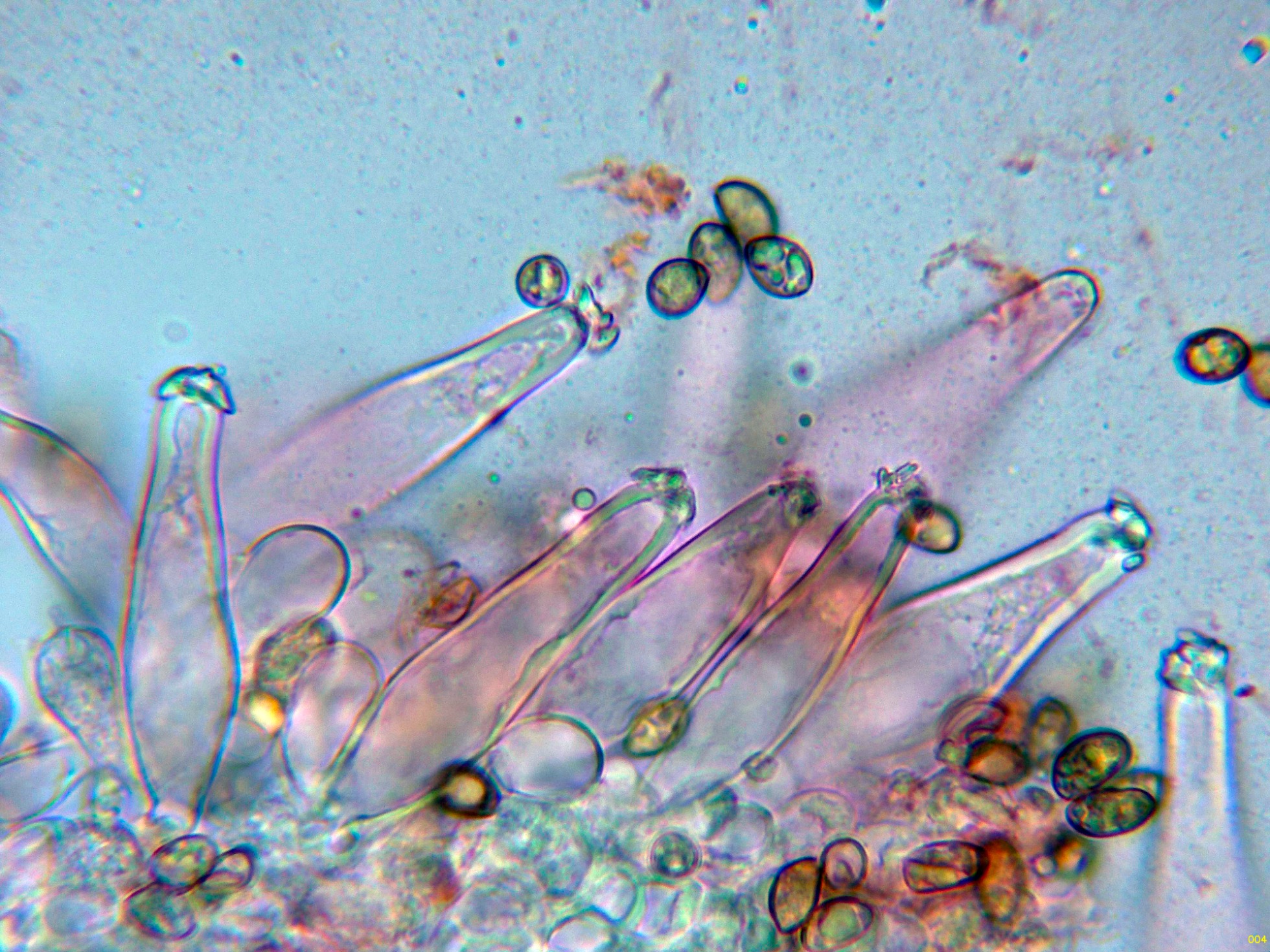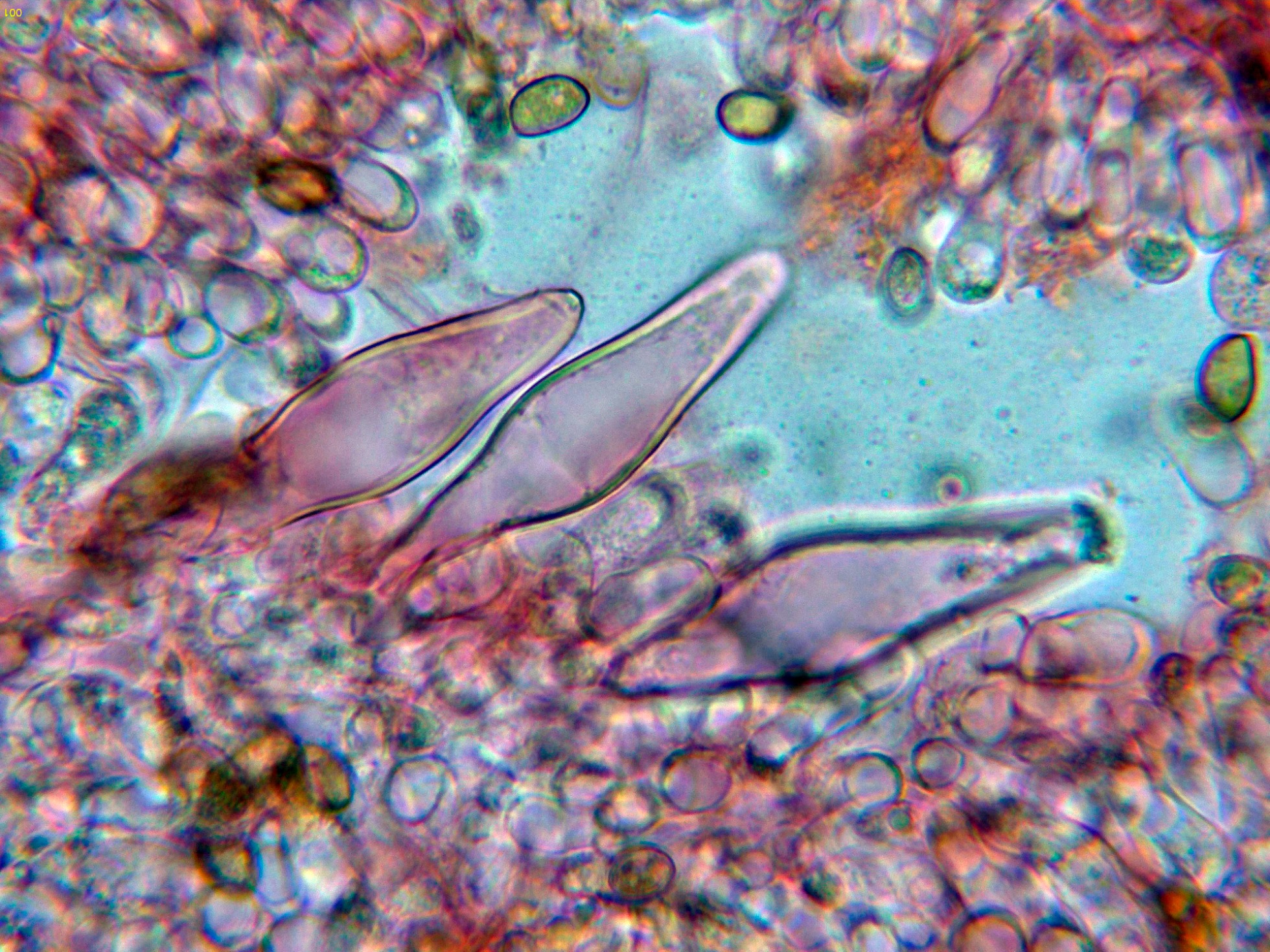 Queilocistidios muy abundantes con cristalizaciones en el ápice, con unas medidas de (39.5) 47.3 - 56.8 (62.2) × (10.7) 11.4 - 15.7 (16.8) µm.
