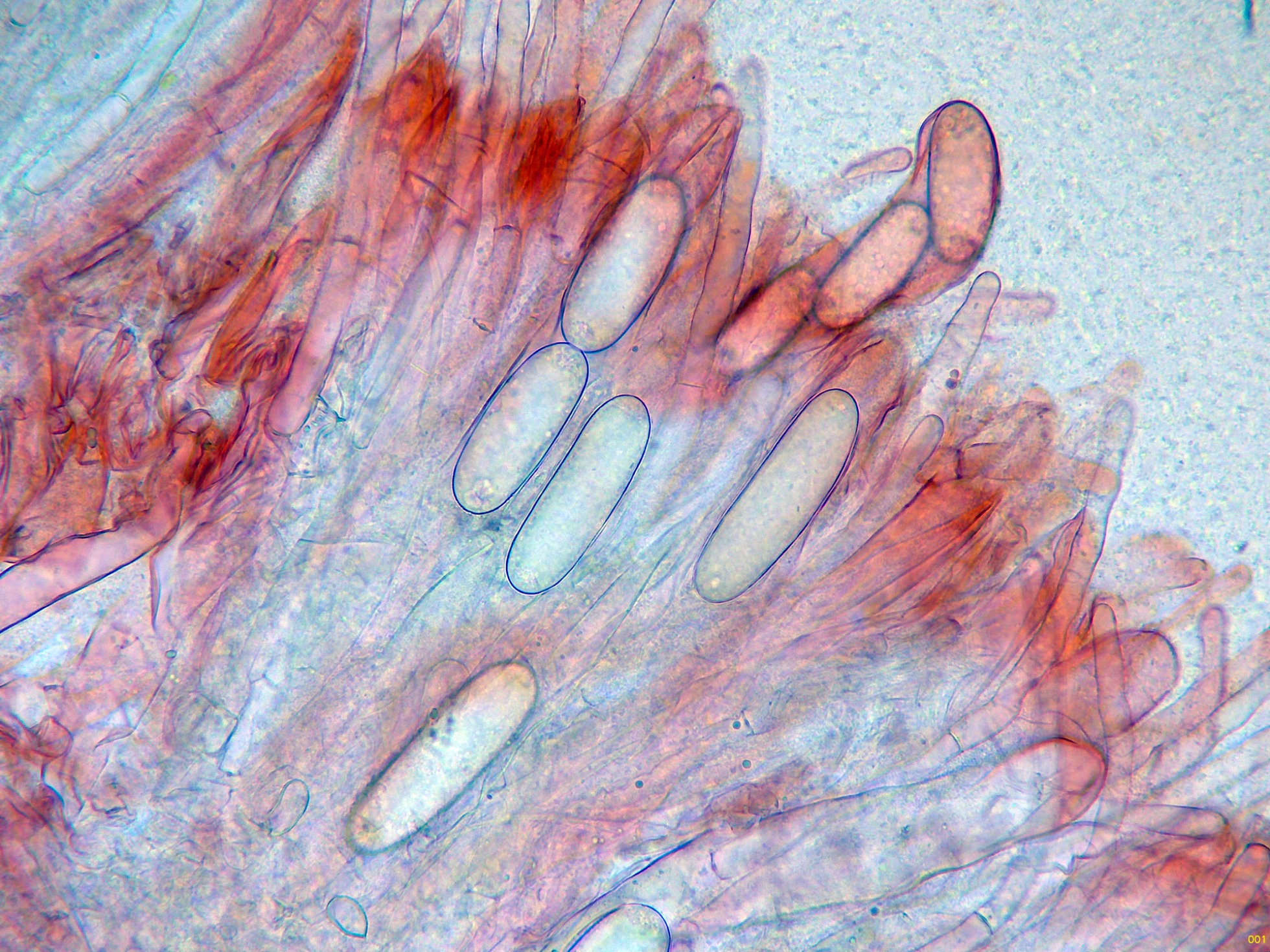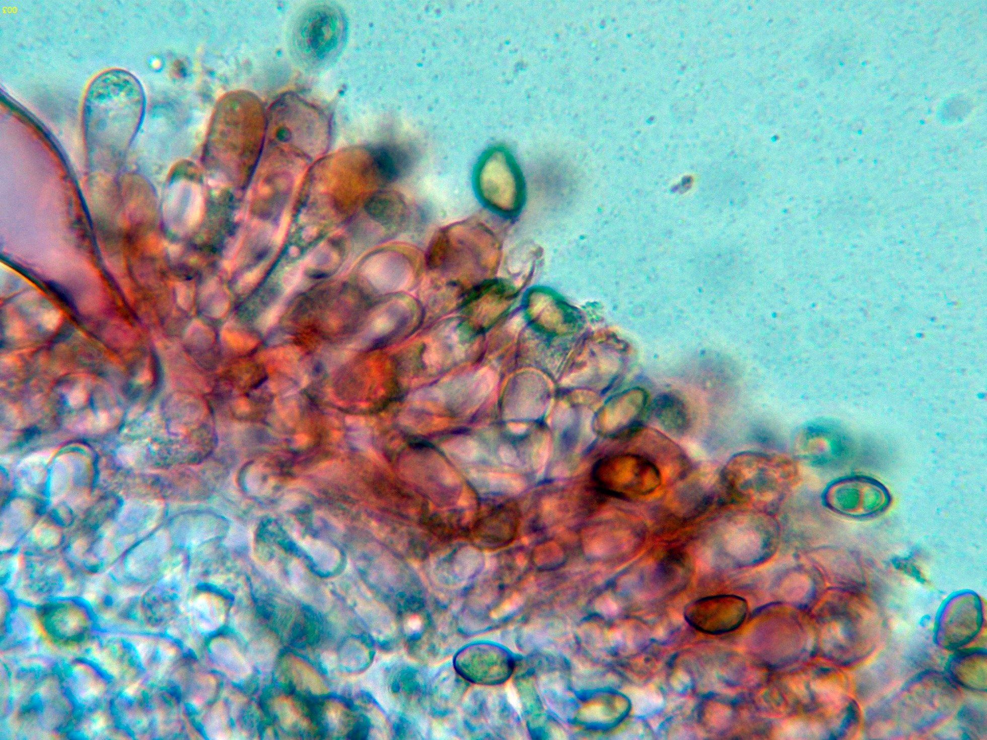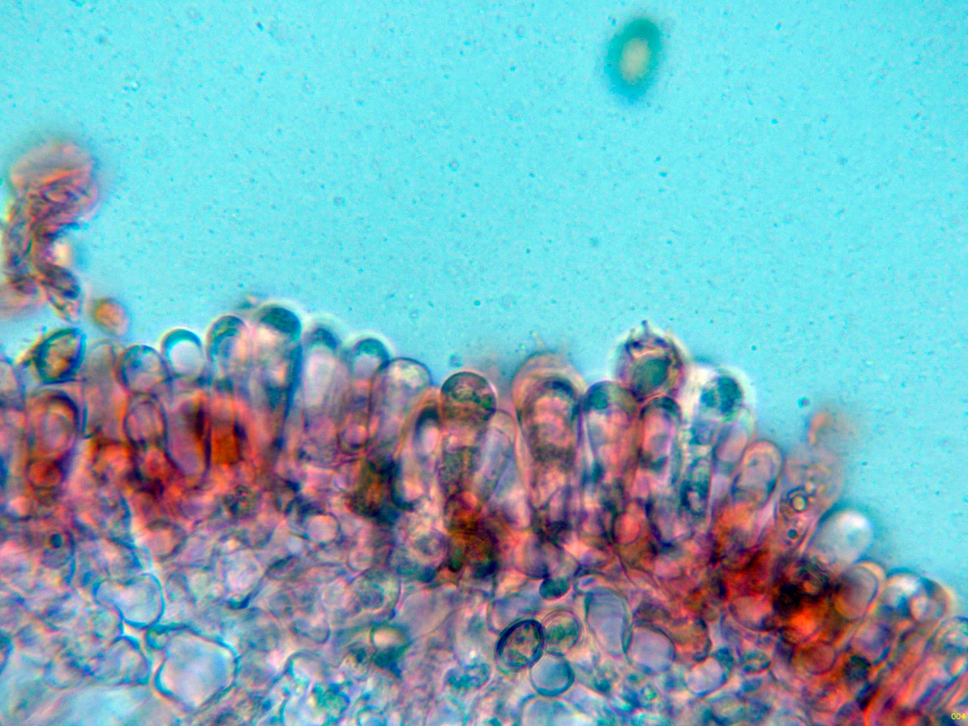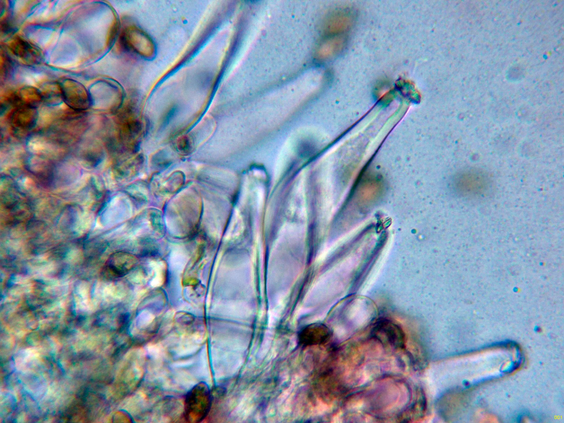 Queilocistidios muy abundantes con cristalizaciones en el ápice, con unas medidas de (39.5) 47.3 - 56.8 (62.2) × (10.7) 11.4 - 15.7 (16.8) µm.