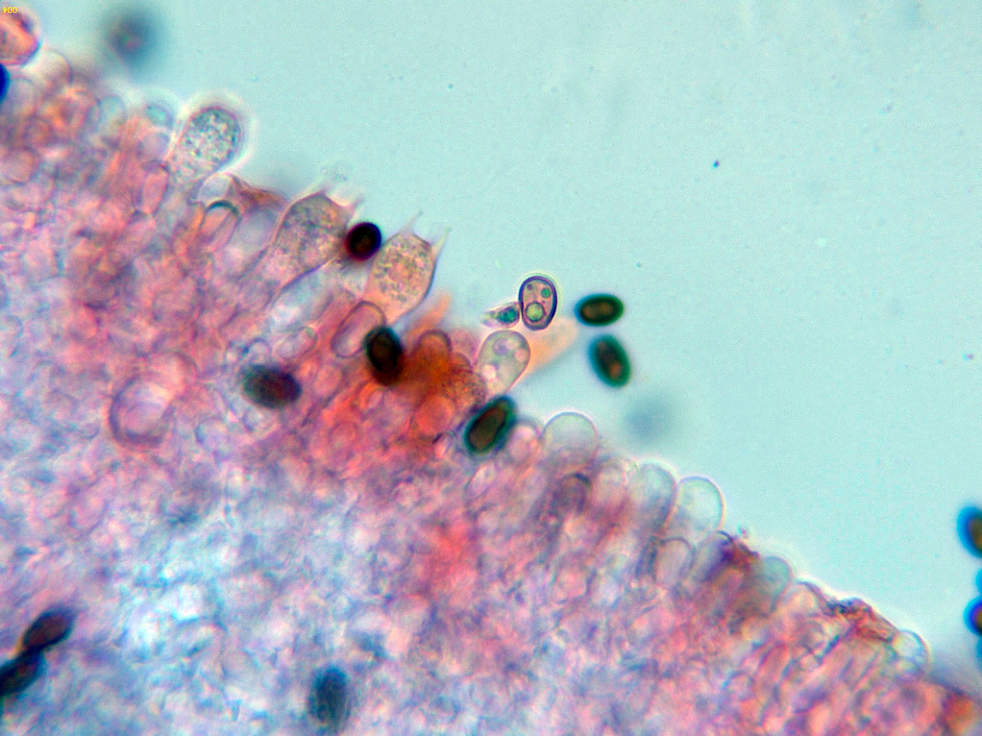 Pleurocistidios abundantes con una morfología muy parecida a los queilocistidios y con unas medidas de (52) 52.4 - 60.4 (76.4) × (14.1) 14.6 - 17.4 (18) µm.