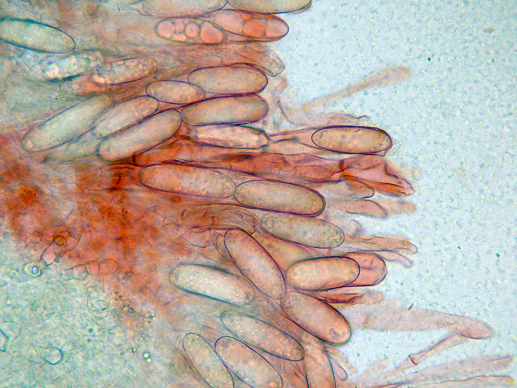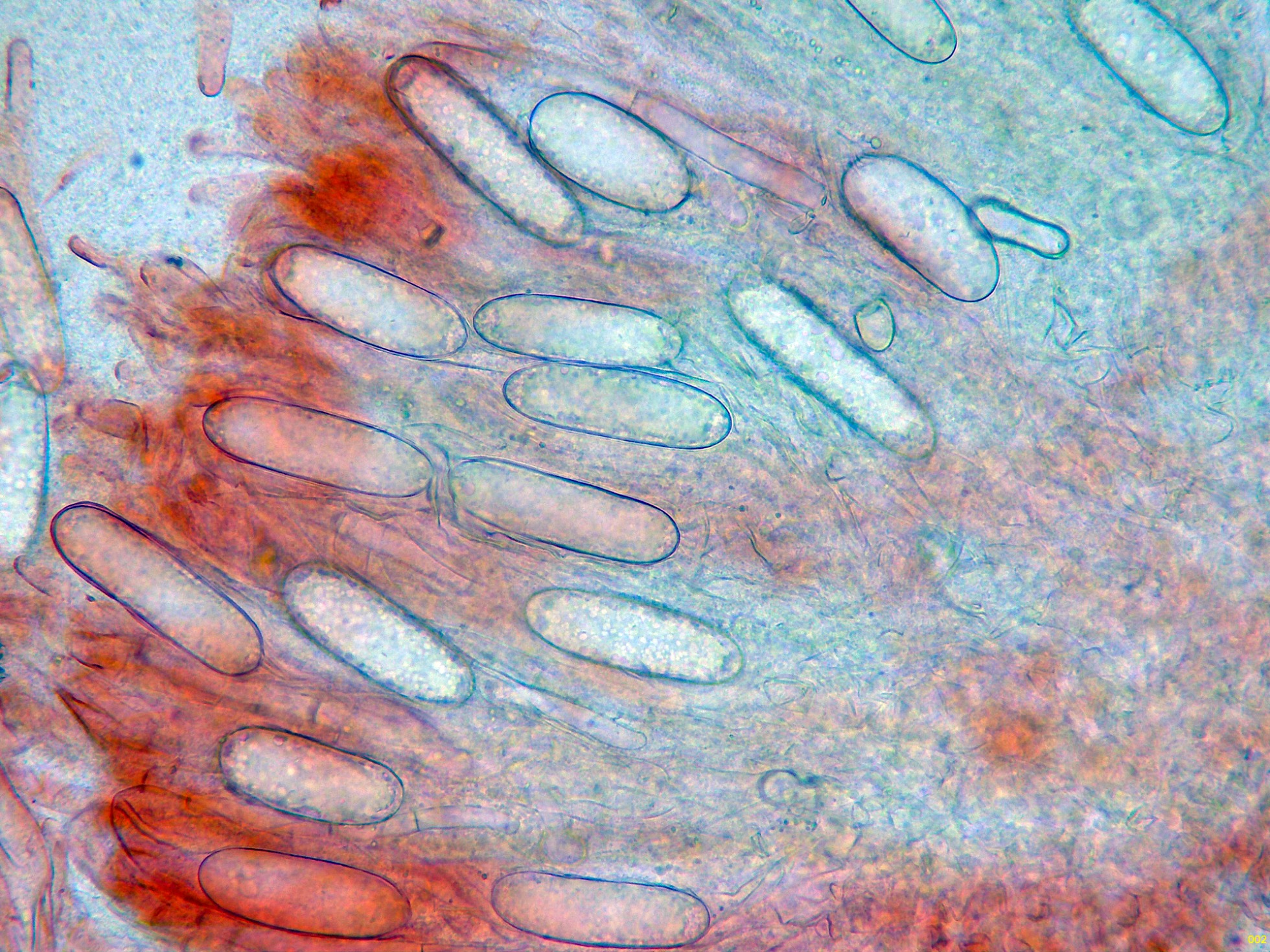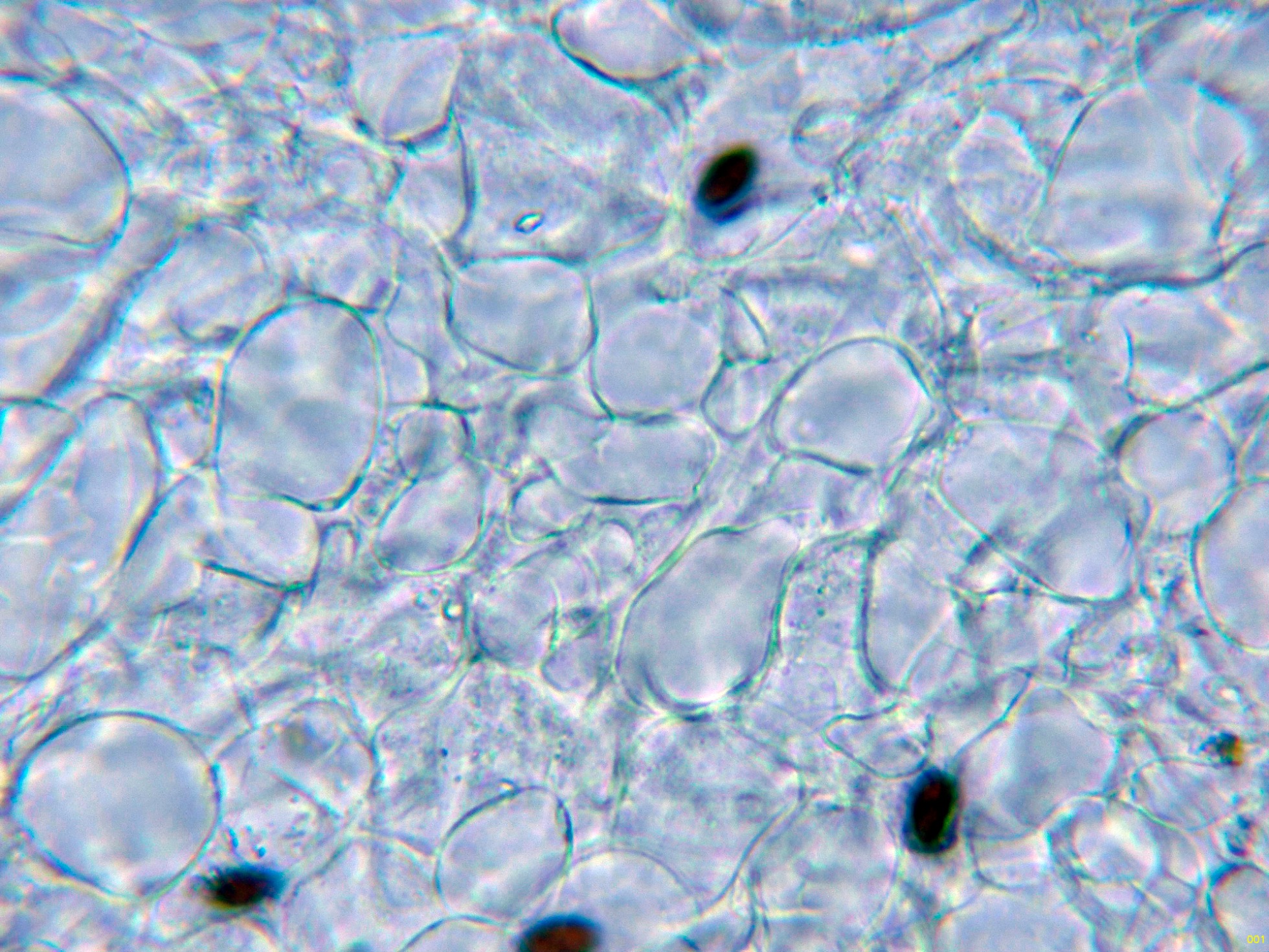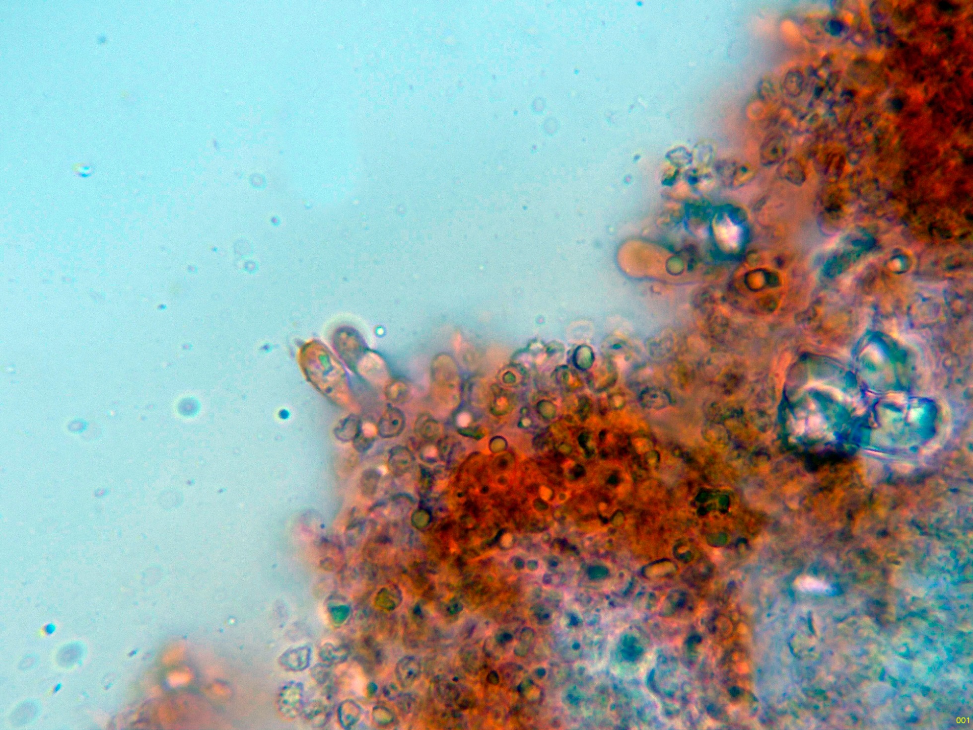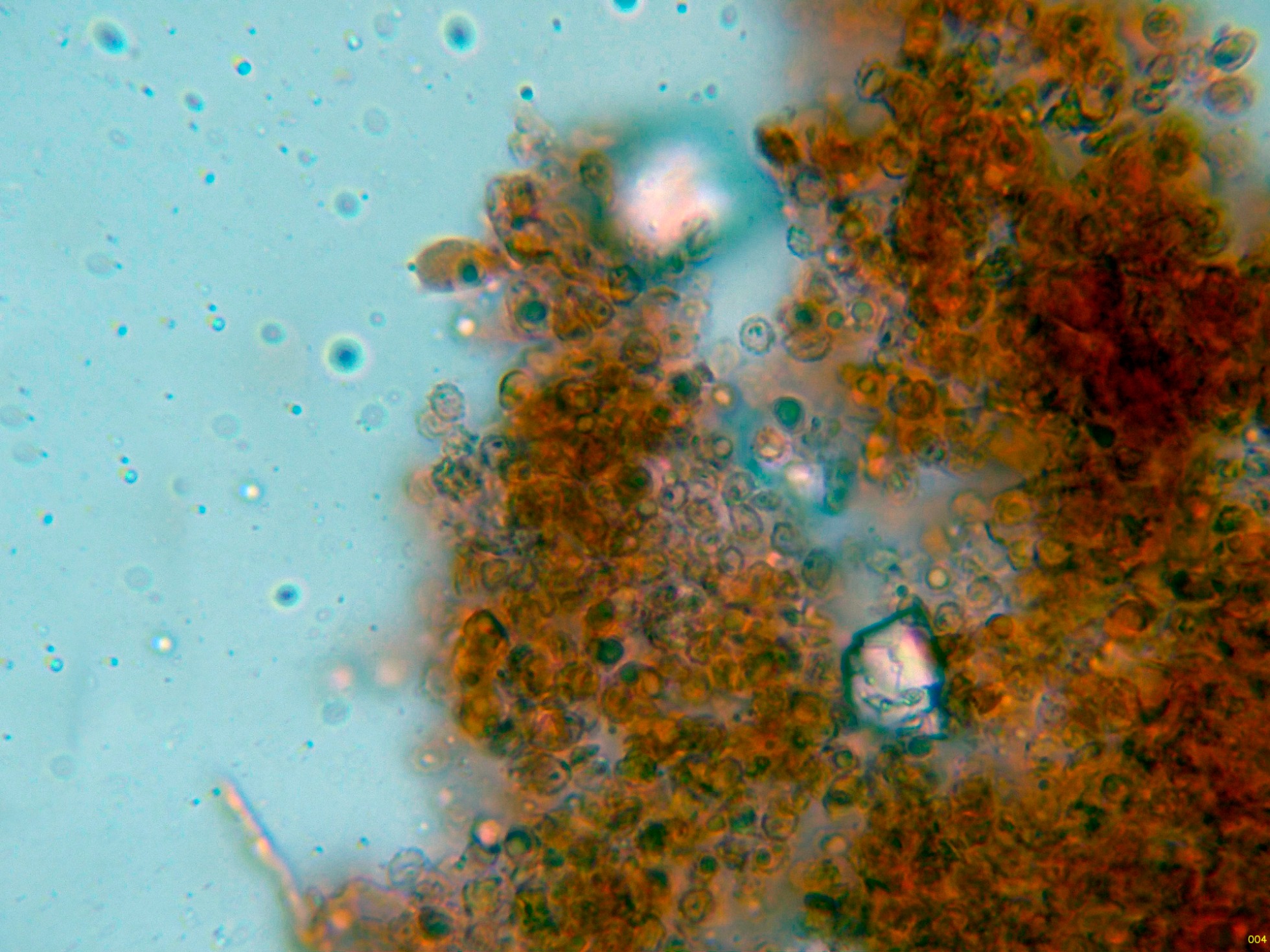 Las esporas en solución de KOH, sin apenas ninguna reacción aparente.