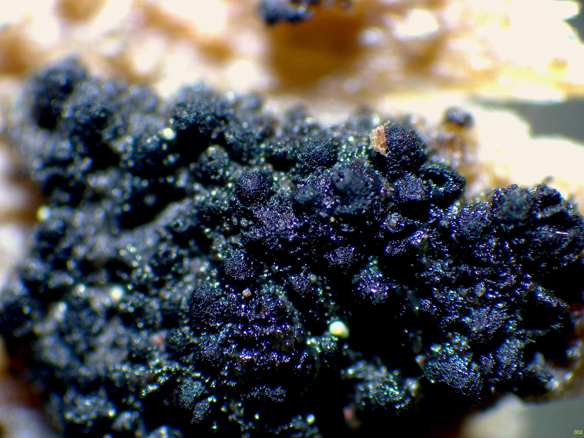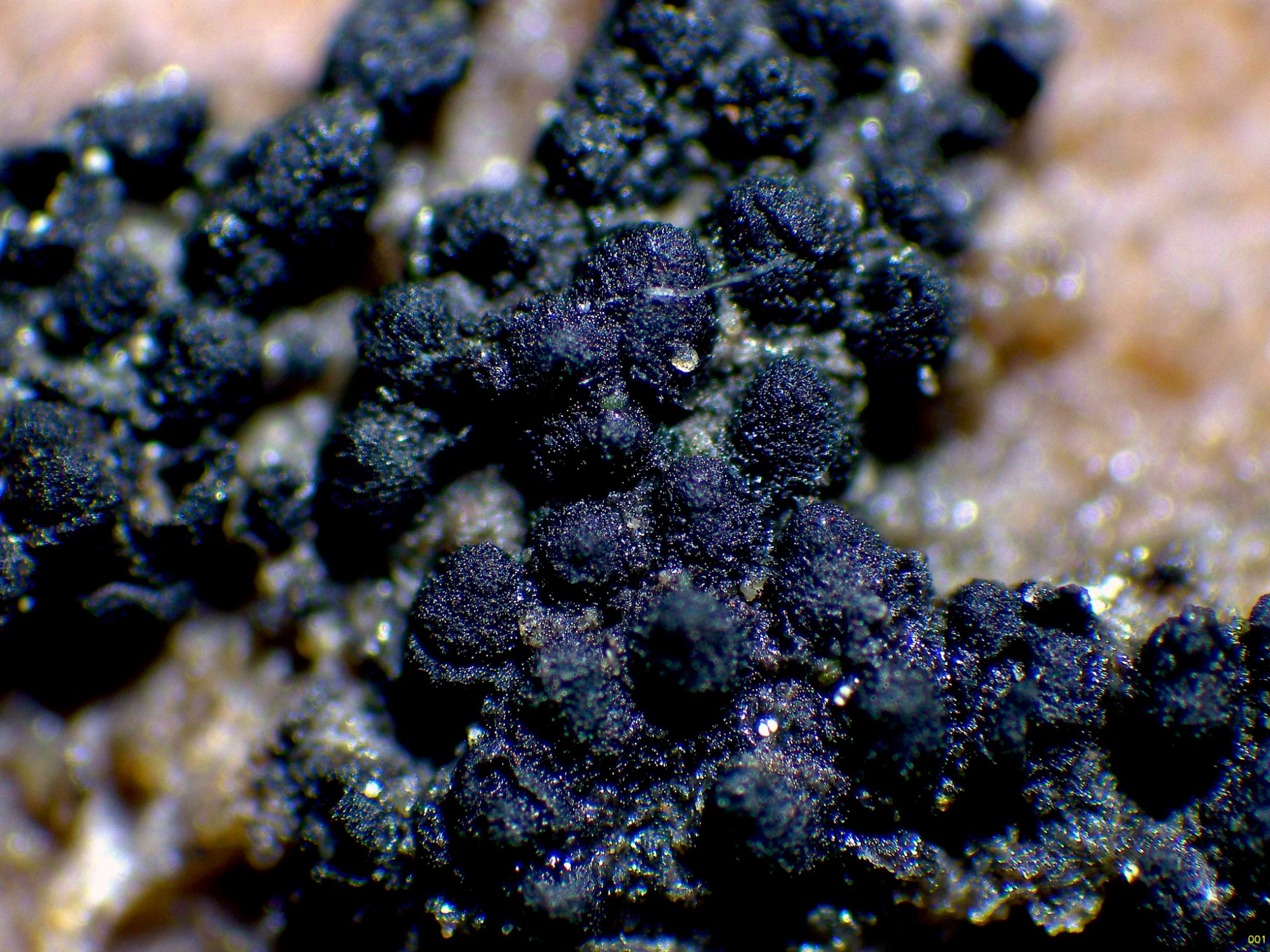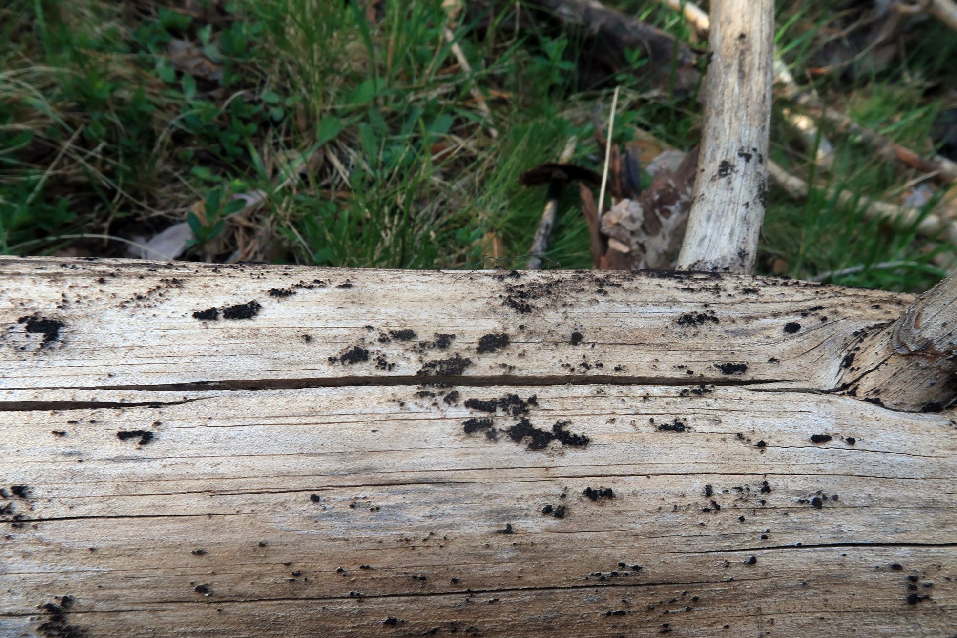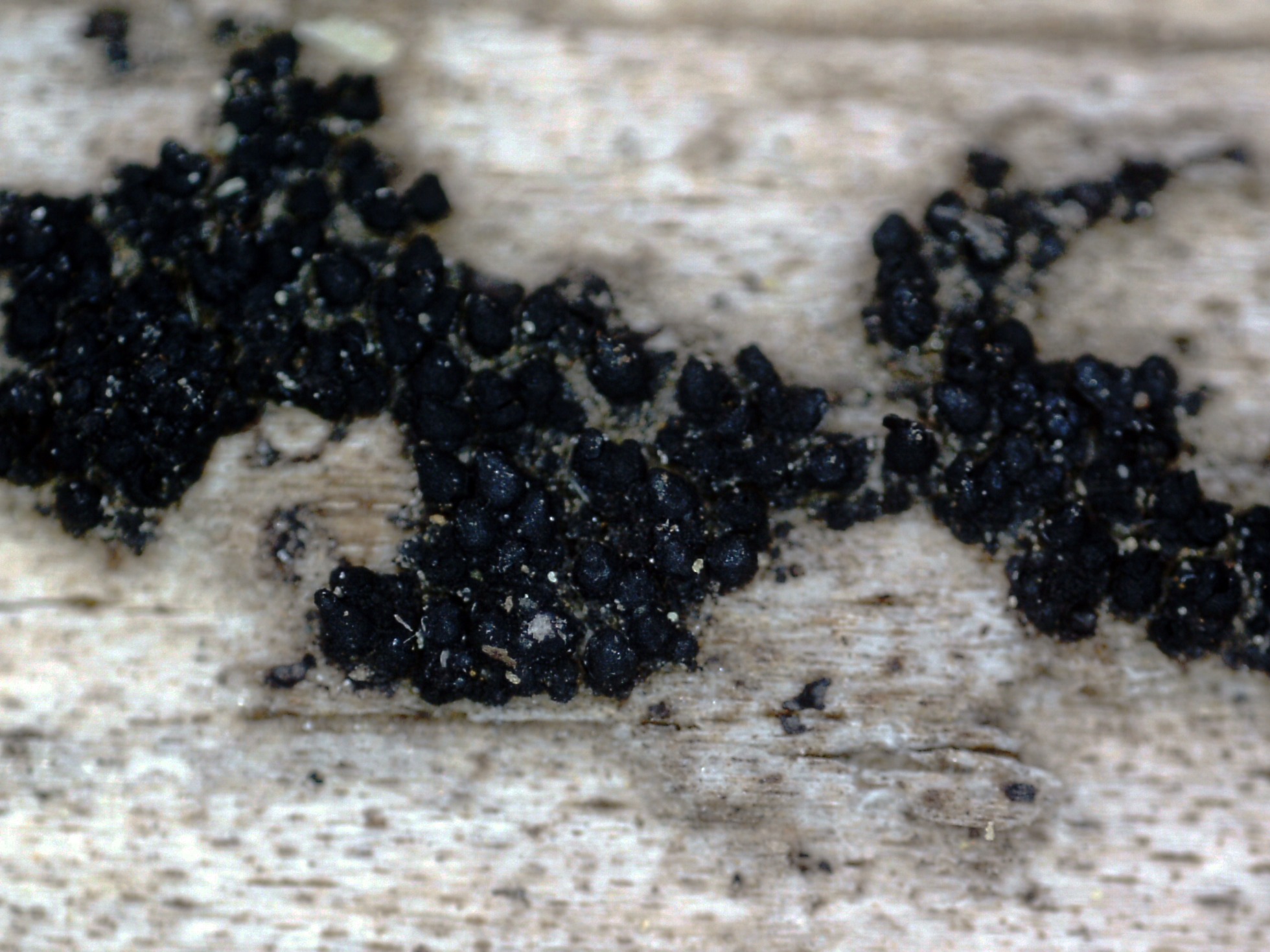 Muy diminutos peritecios de color negro brotando de manera dispersa, en pequeños grupos sobre la superficie descortezada de un tronco tumbado del suelo de Pinus sylvestris.