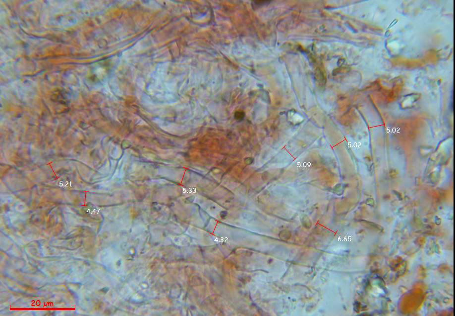 Una imágen con la anchura de estas hifas subiculares, según bibliografía de 4,2 a 6,3 μm.