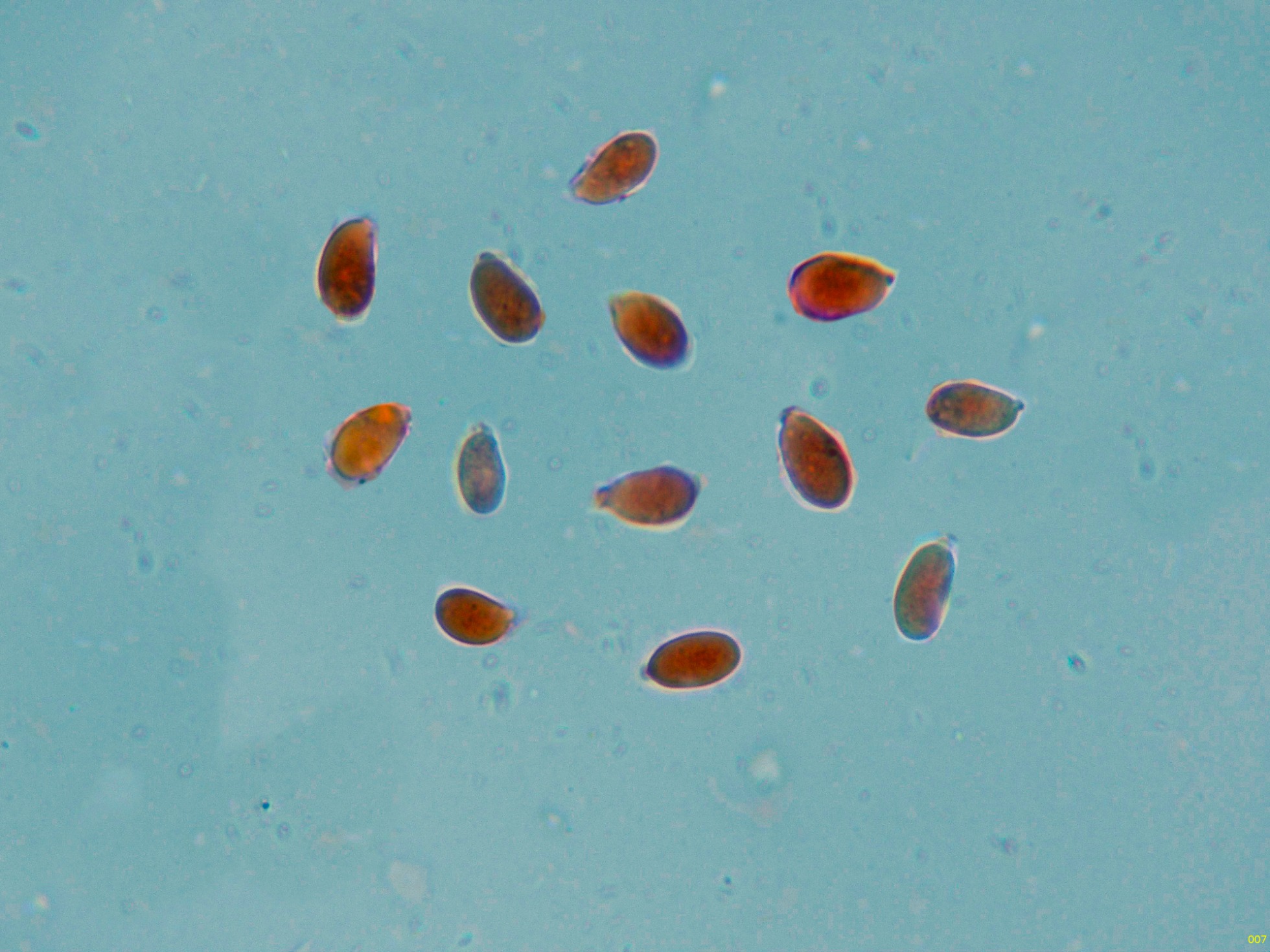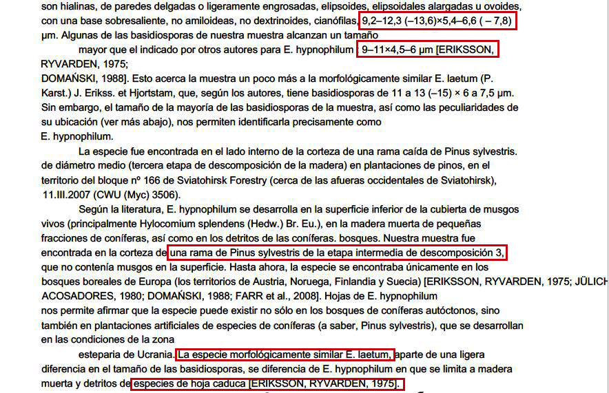 Observaciones: Determinación hecha siguiendo el criterio del documento "Nuevas especies de hongos corticoides para Ucrania del Parque Nacional Natural Svyati Gory", en el que se indican unas medidas esporales para el Erythricium hypnophilum de 9,2–12,3 (–13,6)×5,4–6,6 ( – 7,8) μm., un poco lejos de las indicadas en las claves de 9–11×4,5–6 μm., añado una captura de pantalla del documento: