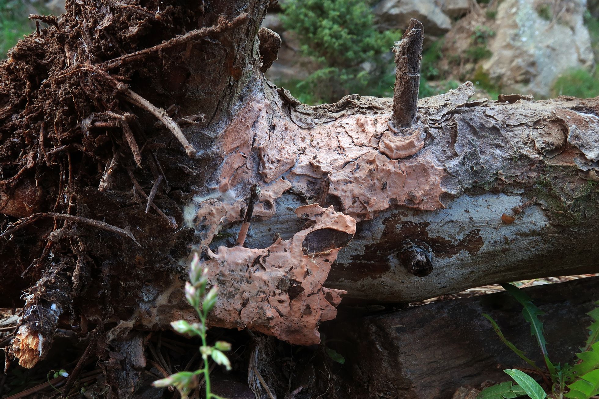 Un Corticial de color rosado asalmonado del 2 de junio pasado en pinar de altura, brotando sobre la superficie de un tronco tumbado de Pinus mugo, este podría tratarse de todo un "cromazo", quizás la primera cita de la especie para Nuestra Península.