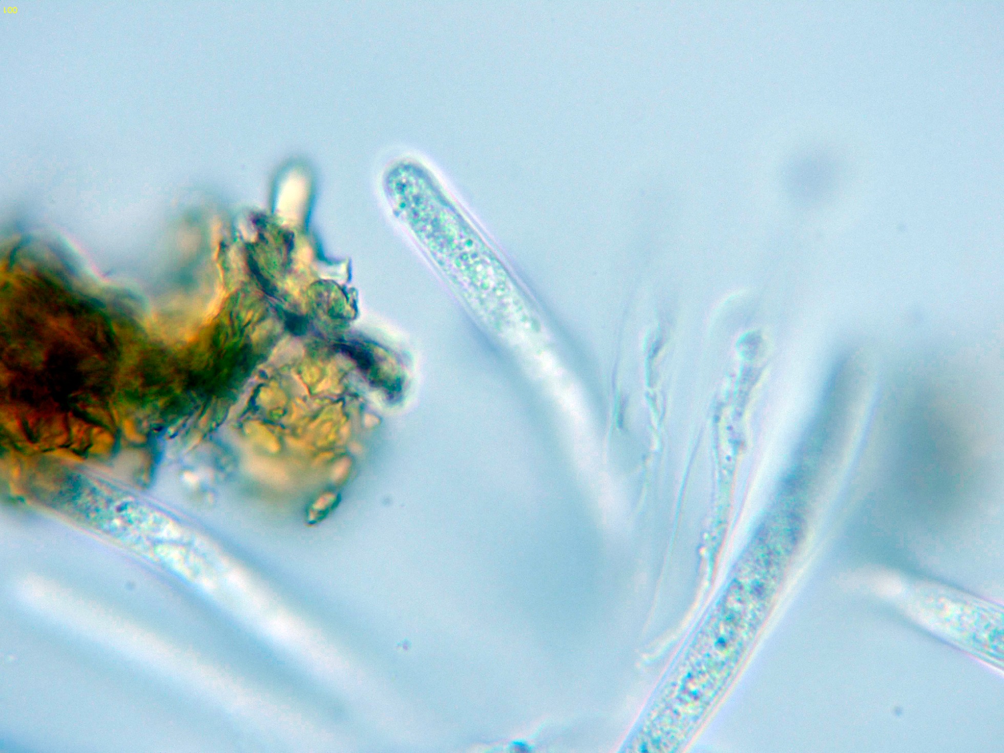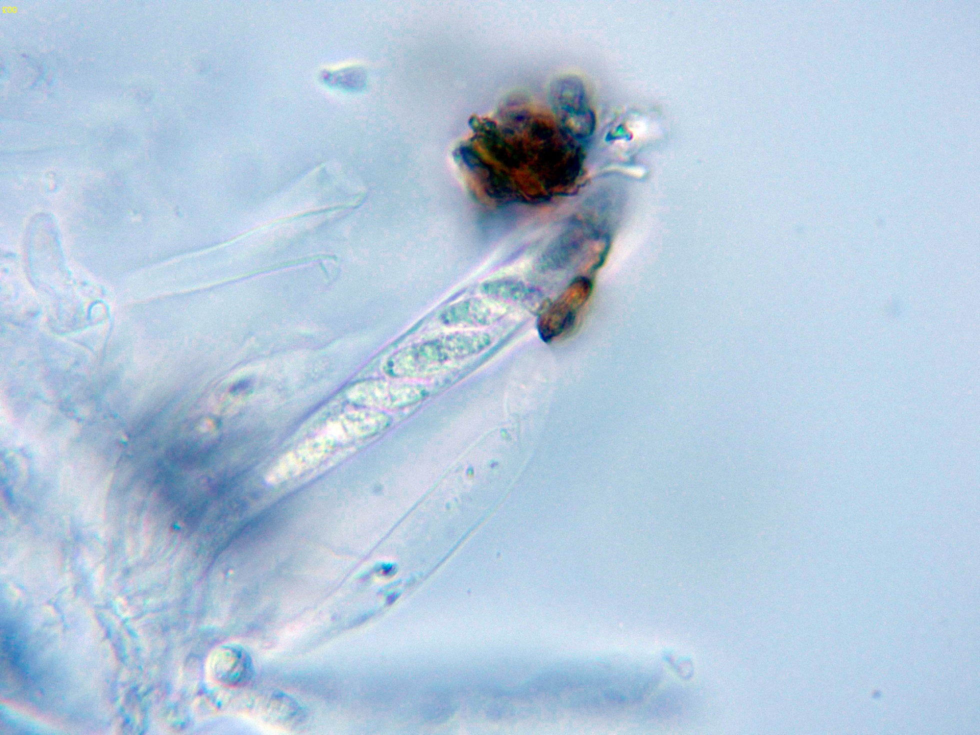 Los ascomas ya se encontraban bastante resecos, con lo que no pude obtener esporas por esporulación natural, pongo una composición de las esporas libres observadas: