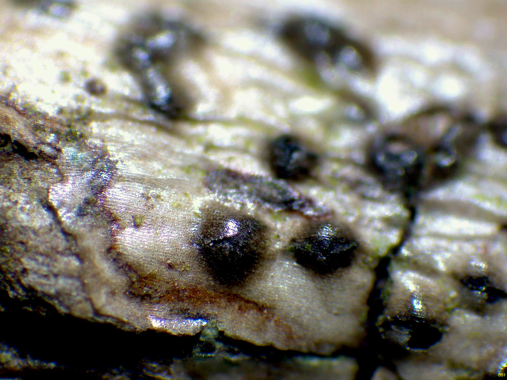 Ascomas a 40 aumentos a modo de granos negruzcos que rompen la corteza: