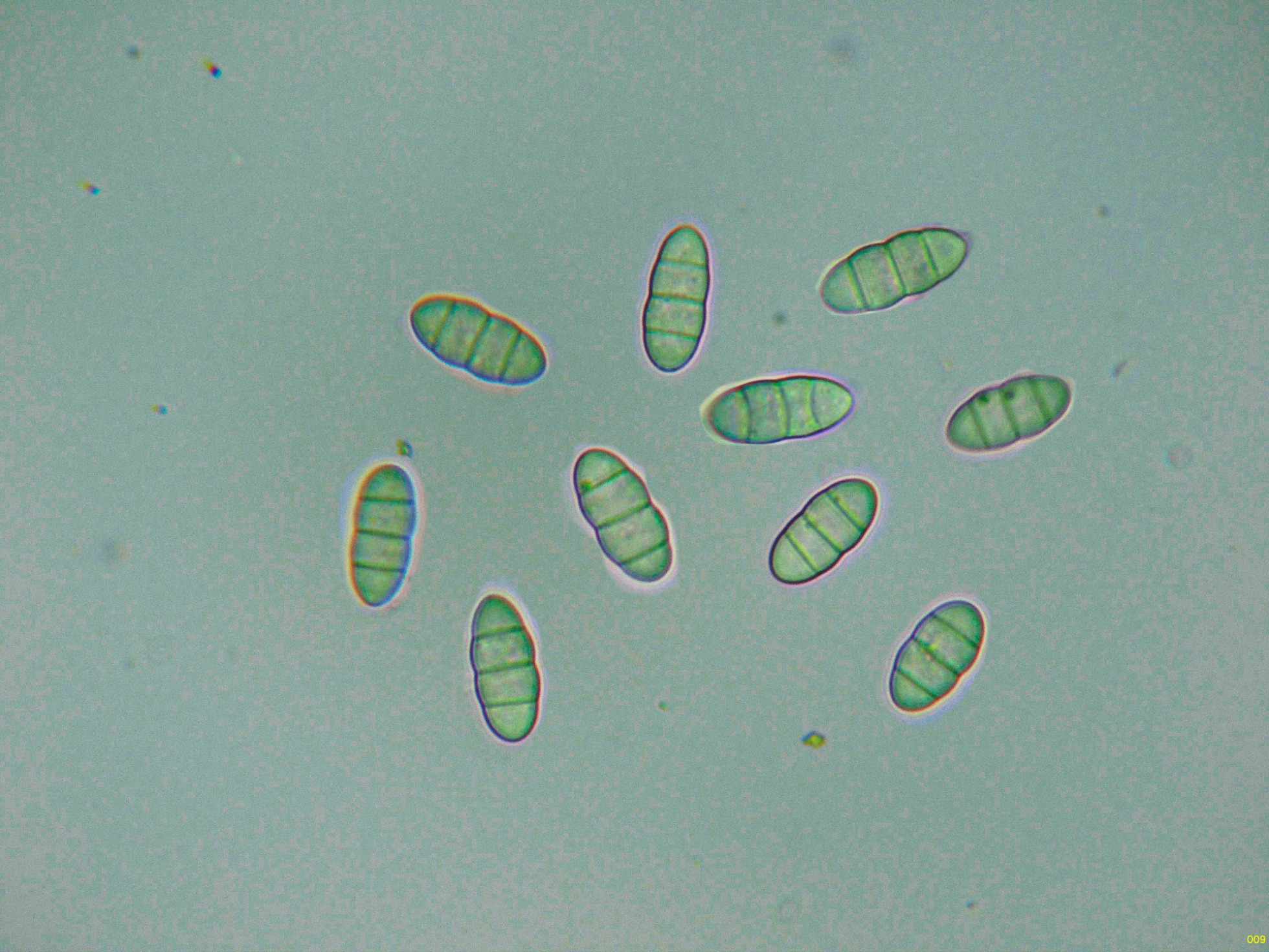 Estas esporas con 3 septos, con consteñimiento en los mismos, este constreñimiento más acusado en el septo central y con unas medidas en agua de (14.7) 14.8 - 16.6 (17.3) × (6.4) 6.6 - 7.4 (7.7) µm., Me = 15.9 × 7 µm ; Qe = 2.3.