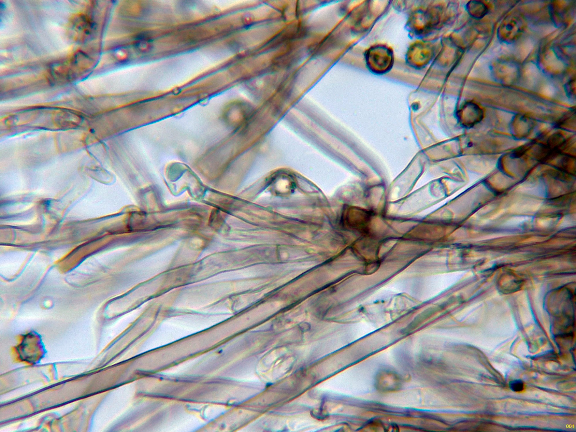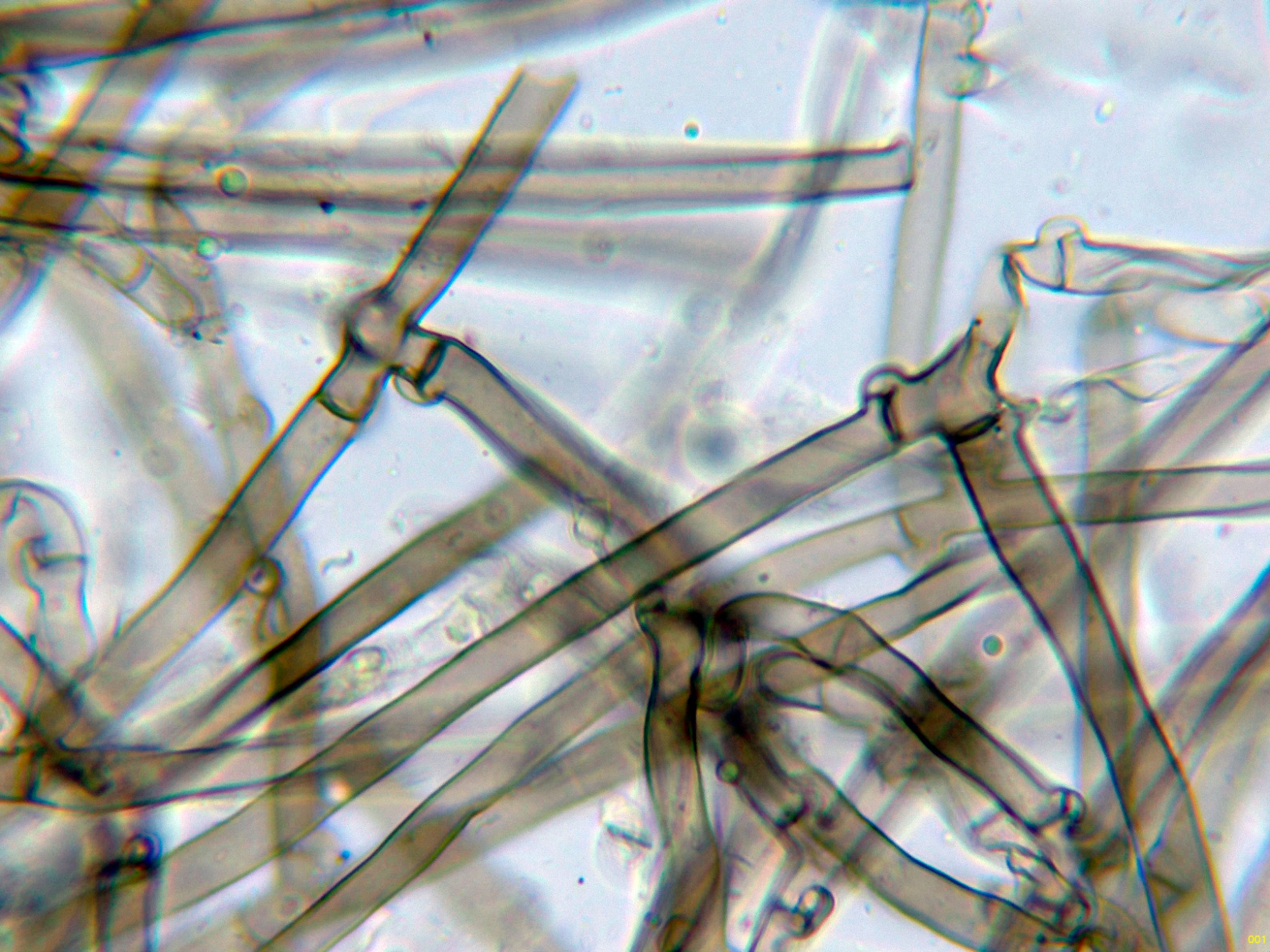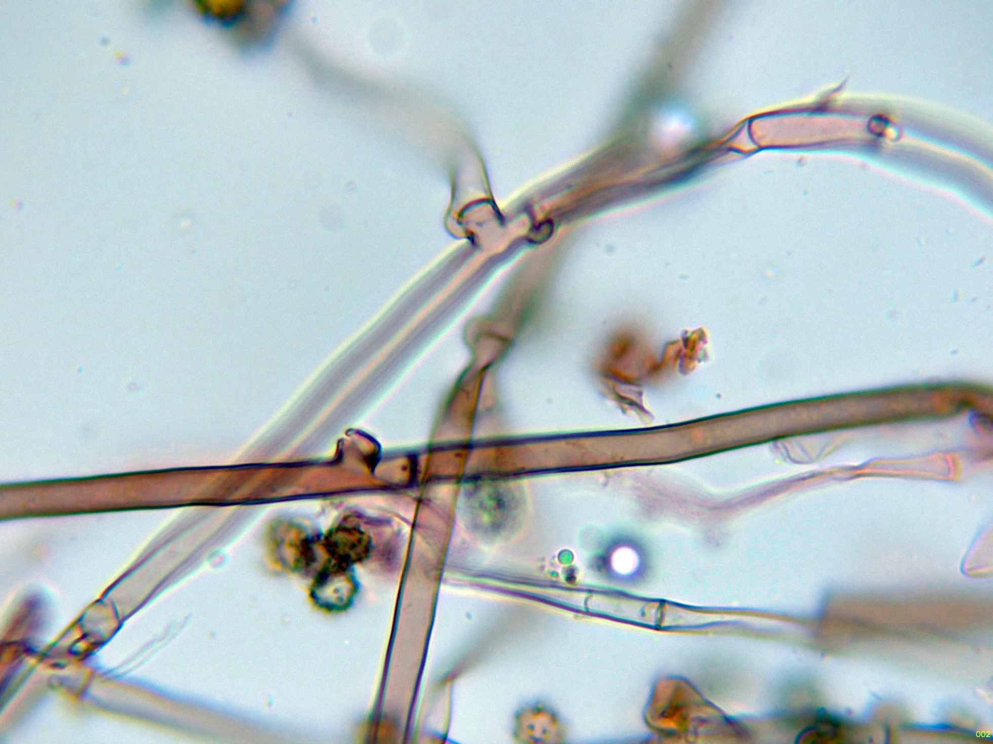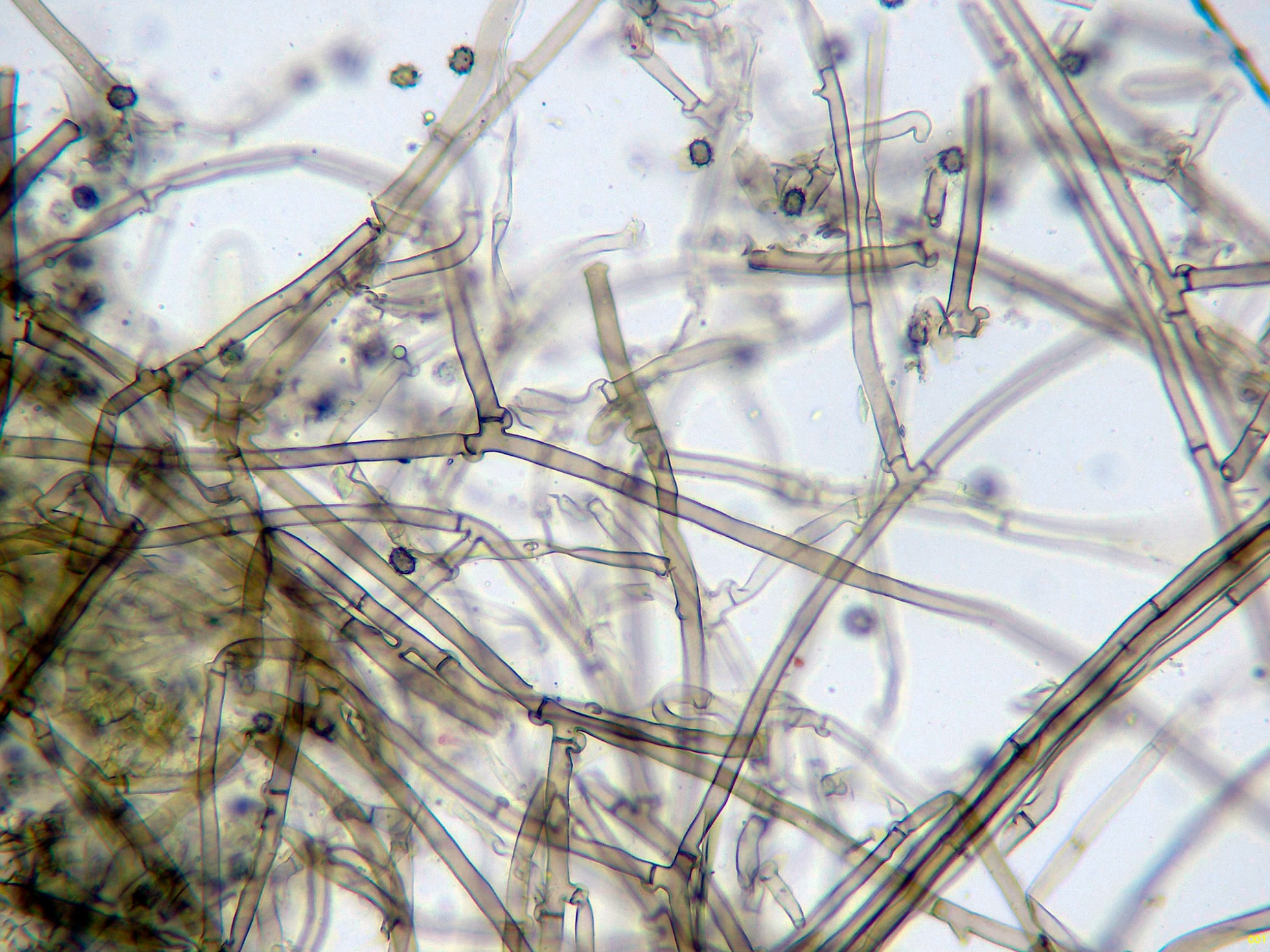 Hifas subiculares fibuladas, de color pardo y pared gruesa: