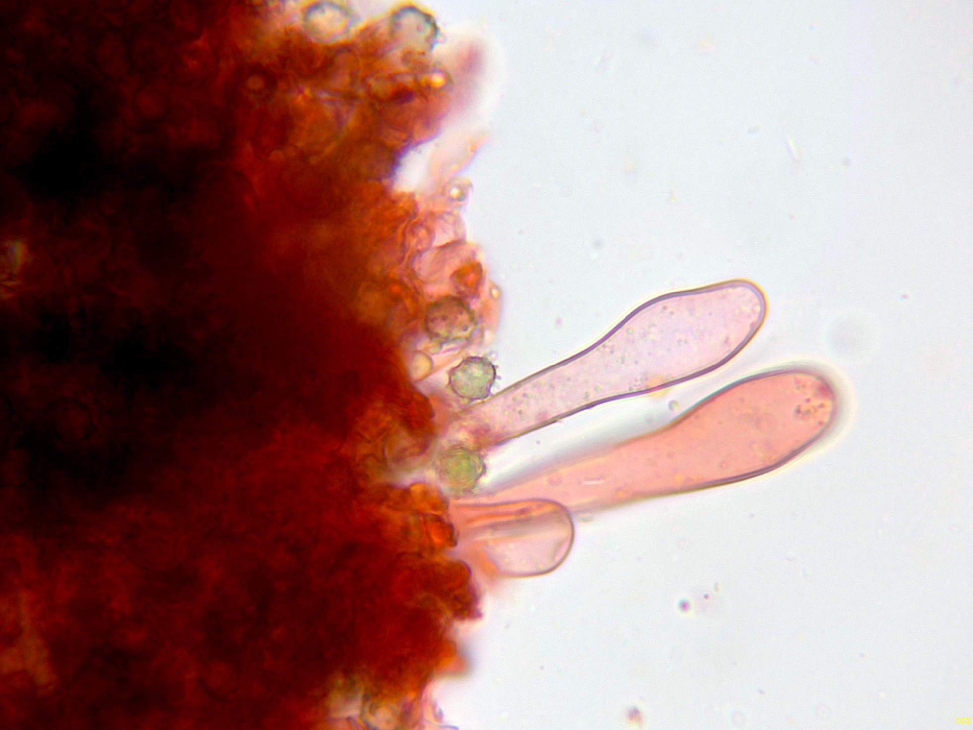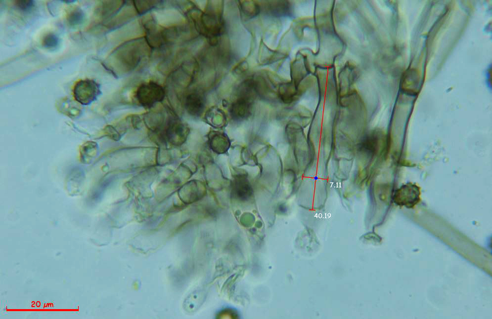 Los cistidios clavados en solución de Rojo Congo, estos cistidios con unas medidas de (48.1) 62.7 - 118 × (8.8) 9.1 - 12.39 (12.4) µm.