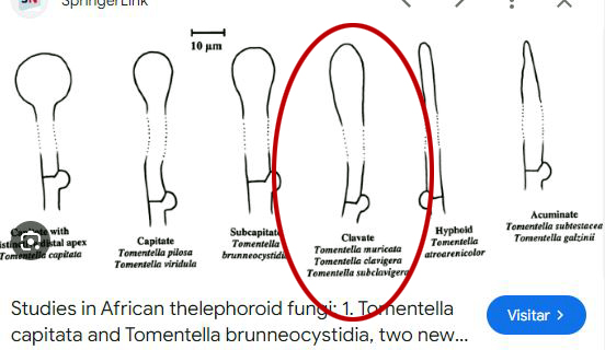De Tomentellas con cistidios clavados tenemos la Tomentella muricata, la Tomentella clavigera y la Tomentella subclavigera, añado un pantallazo con la morfología de los cistidios de las Claves: