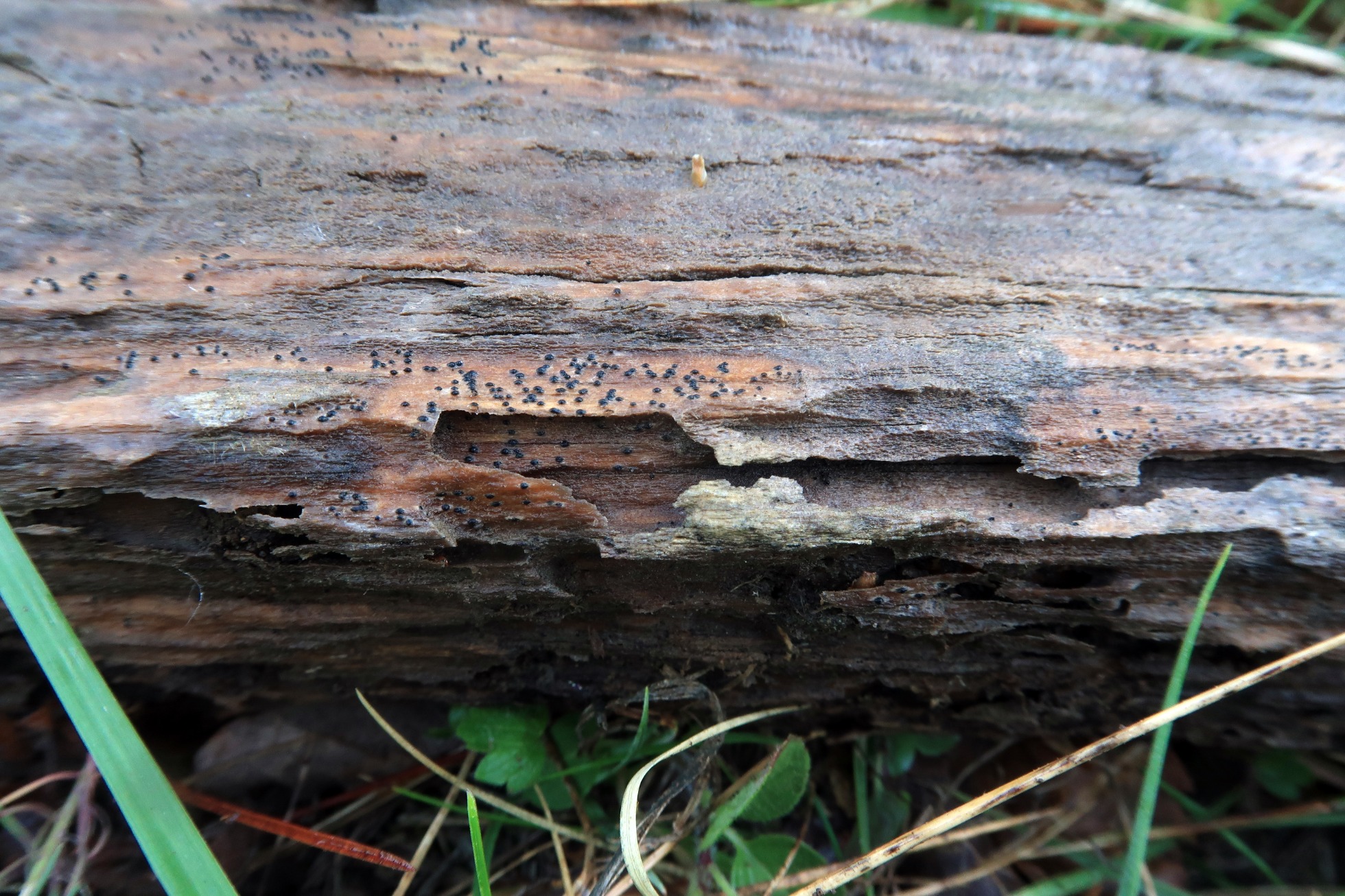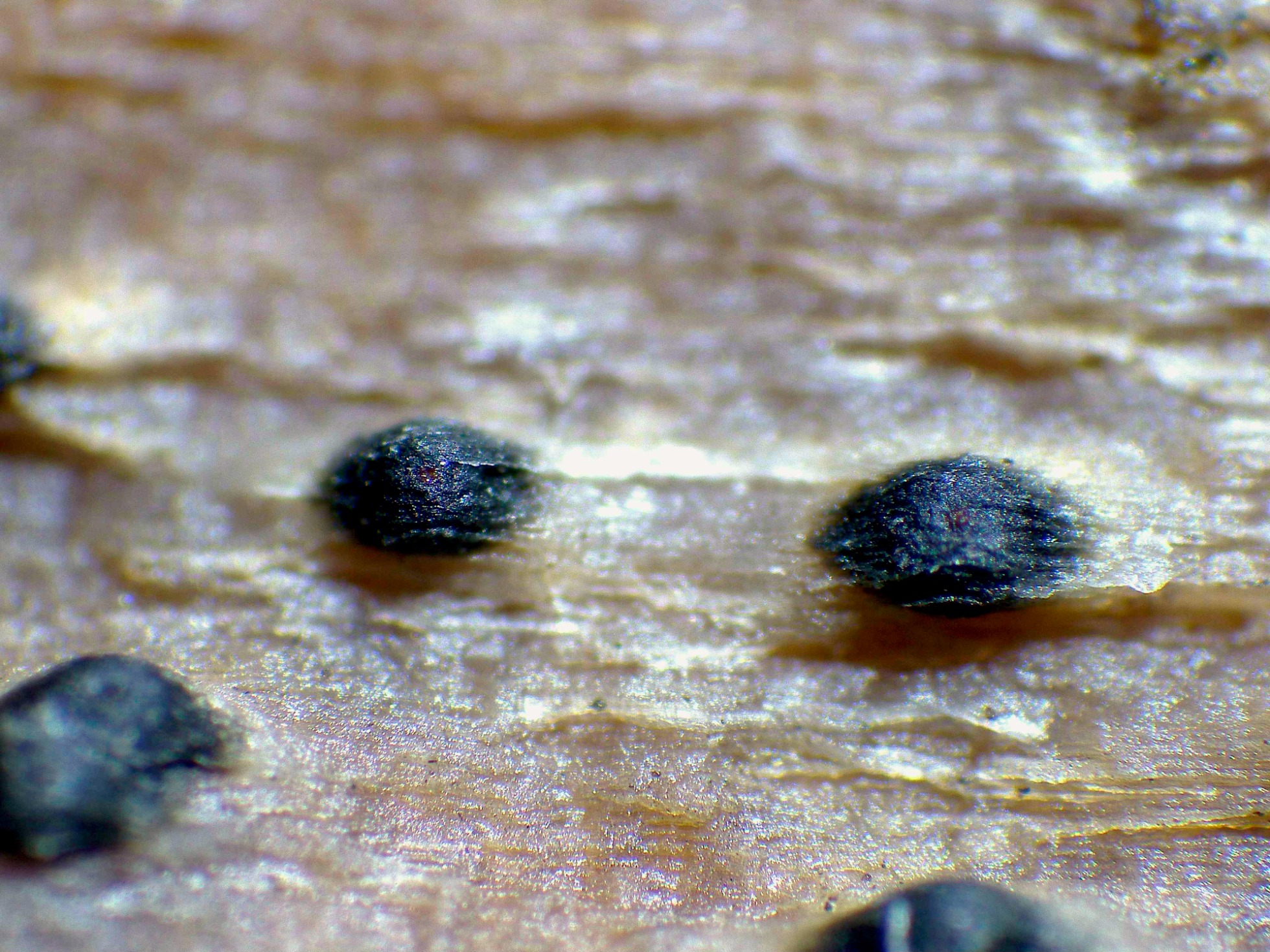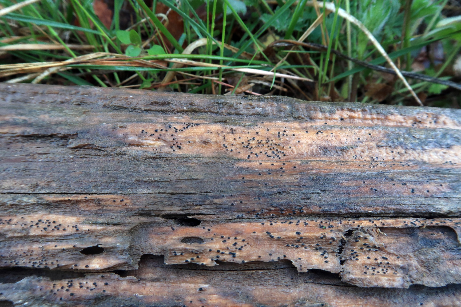 Unos pequeños apotecios brotando de manera dispersa pero abundante sobre una tabla de madera ya elaborada y trabajada y además bastante degradada de probablemente planifolio.