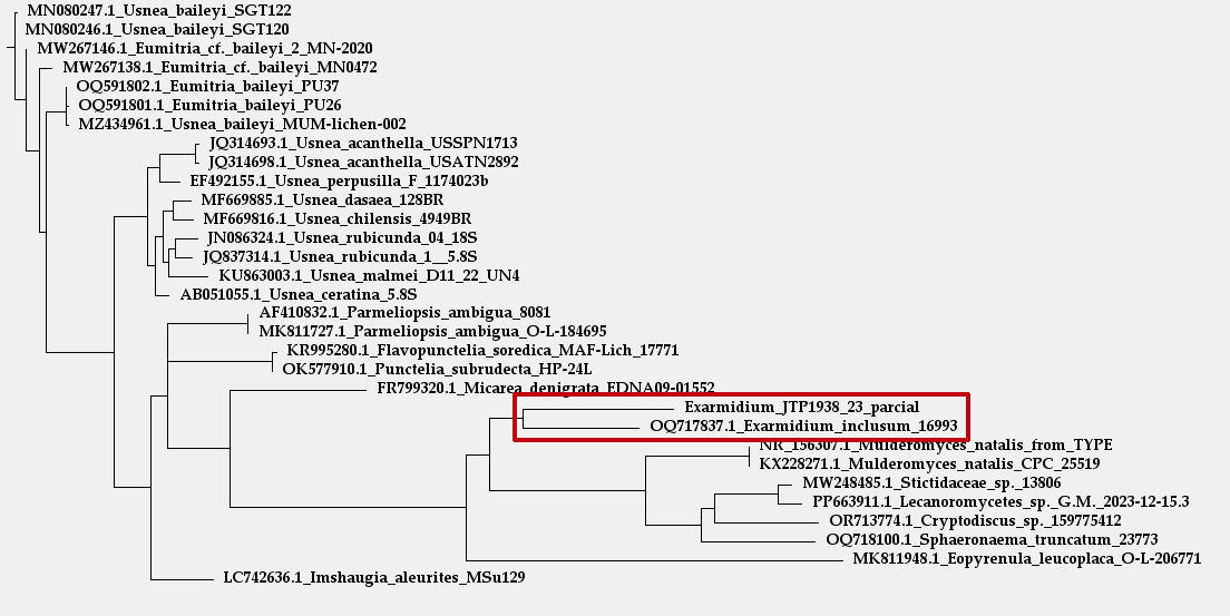 Aunque coloca la especie de mi estudio en el mismo Clado que el Exarmidium inclusum, el árbol filogenético ya refleja una diferencia entre ambos.