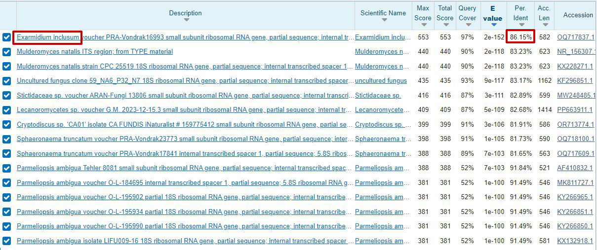 Como que con la microscopía no pude llegar a ninguna propuesta convincente, teniendo solo claro que estaba ante un Exarmidium, decidí probar con el análisis molecular, añado el resultado del Blast correspondiente al gen ITS: