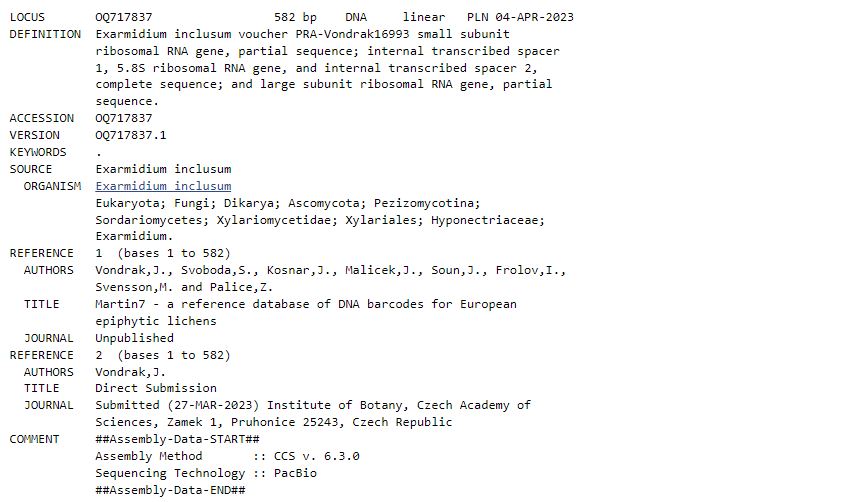 Con todos estos datos obtenidos, tengo claro que a día de hoy solo disponemos de un registro en Genbank de un Exarmidium, y dentro del género solo hay uno del gen ITS del Exarmidium inclusum de una recolecta efectuada en la República Checa del 4 de abril de 2023, dejo una captura de pantalla del registro: