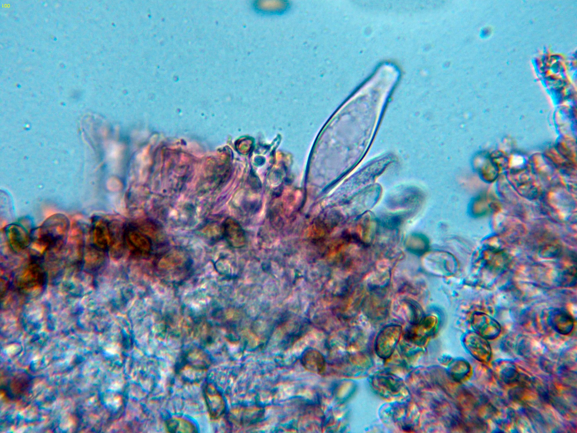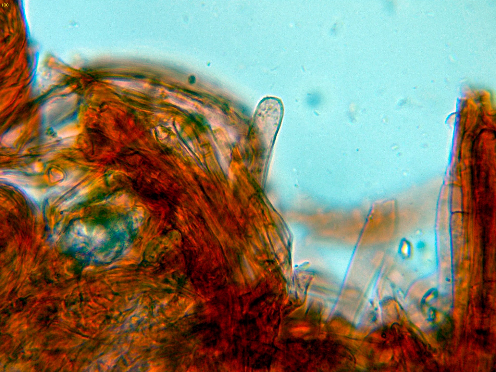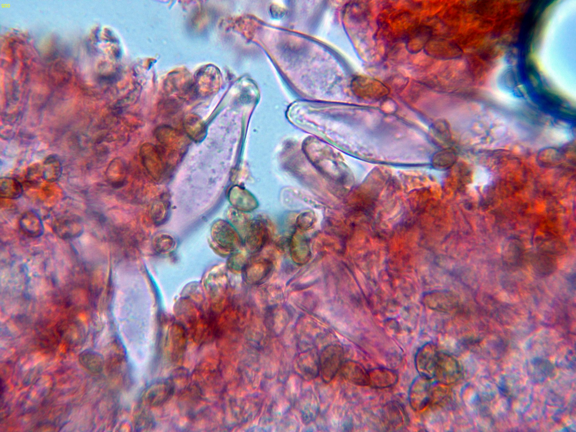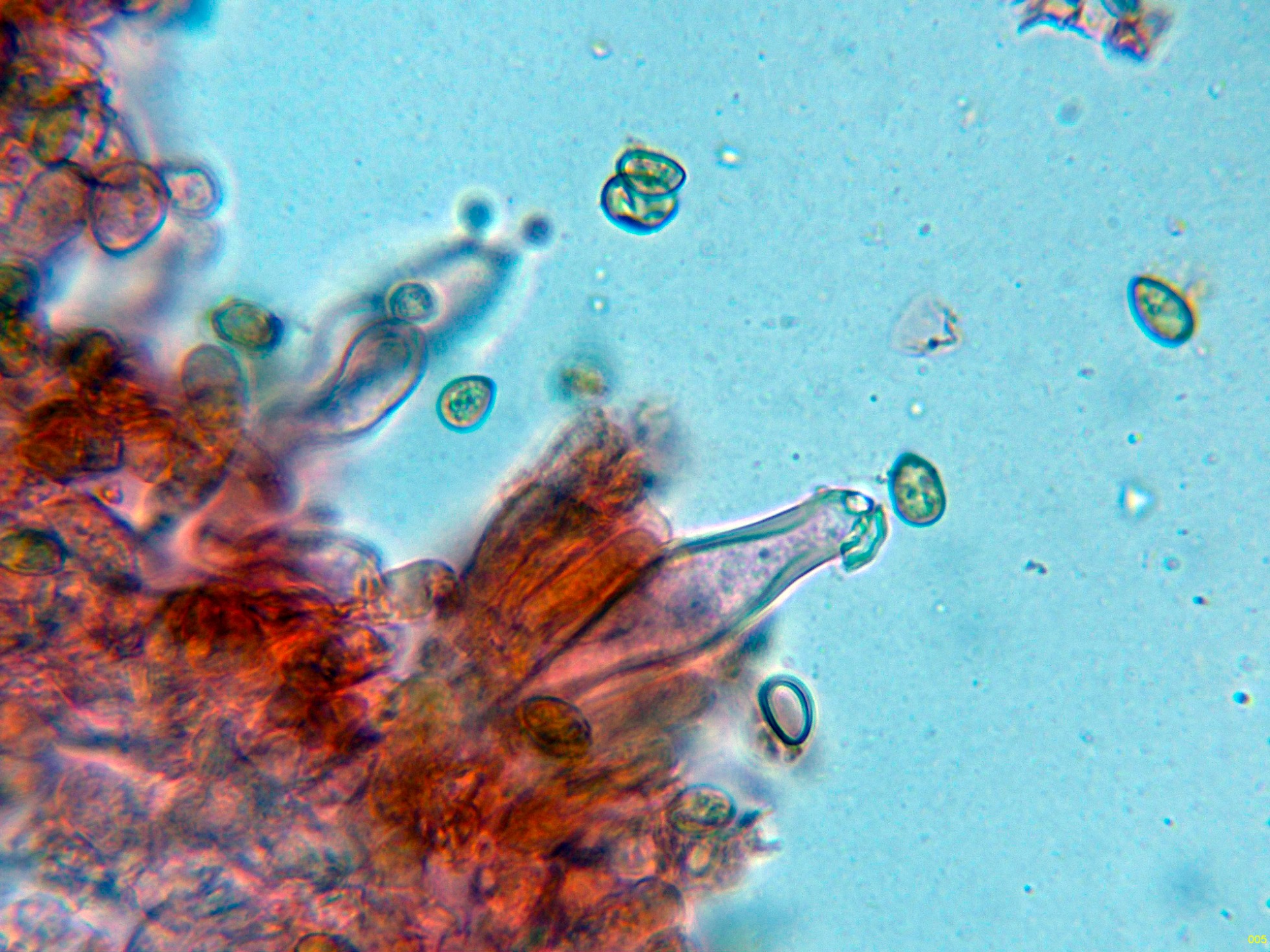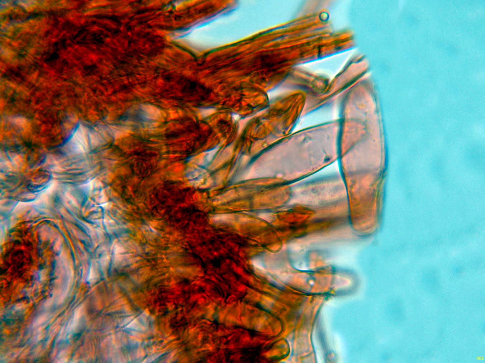 Queilocistidios con cristalizaciones en el ápice y con unas medidas de (38.5) 39 - 49 (54.5) × (9) 10.4 - 12.8 (13) µm.