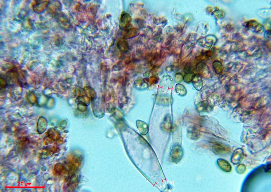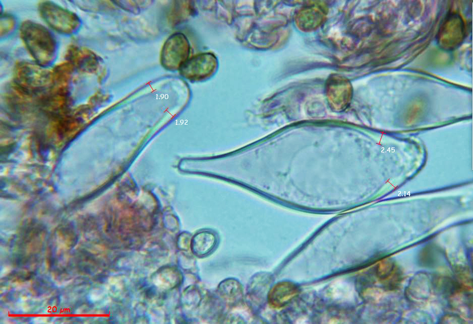 μm., aunque la mayoría de los pleurocistidios medidos entraban dentro de este rango, pude observar algunos de ellos aberrantes con una anchura superior, también la anchura de la pared de hasta 2 micras según el mismo documento y llegando hasta las 2.45 micras en mi estudio.
