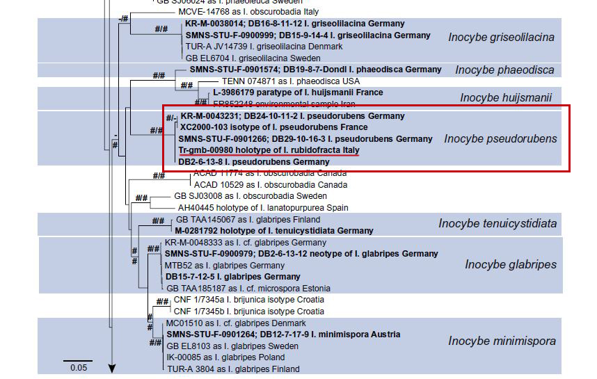 En la imágen se observa claramente la posición a nivel molecular de la Inocybe rubidofracta, justo en medio de lo que se considera como Inocybe pseudorubens, en el mismo documento ya se sugiere la sinonimia entre ambas especies, tal y como se ve ya reflejado en Mycobank.